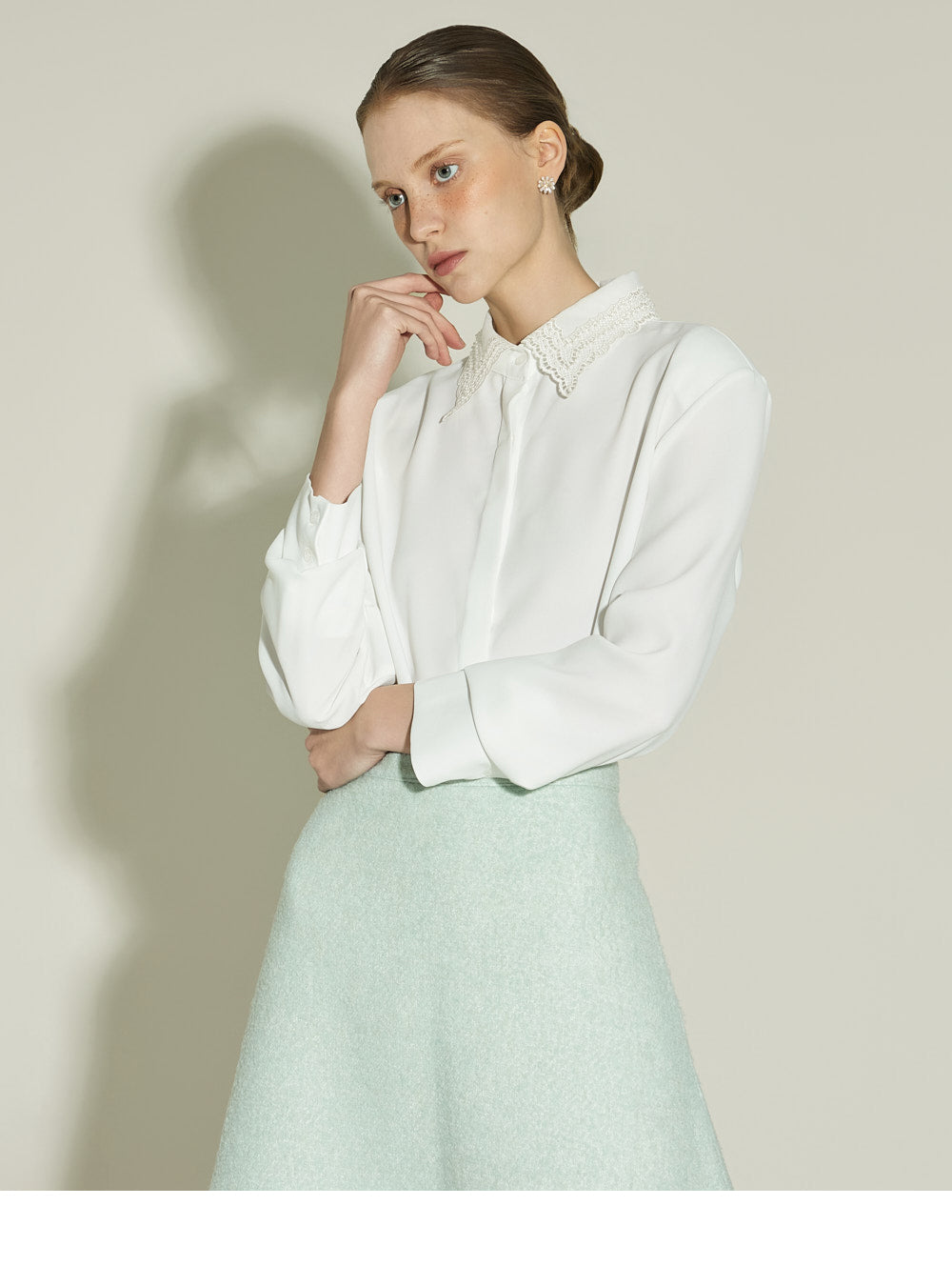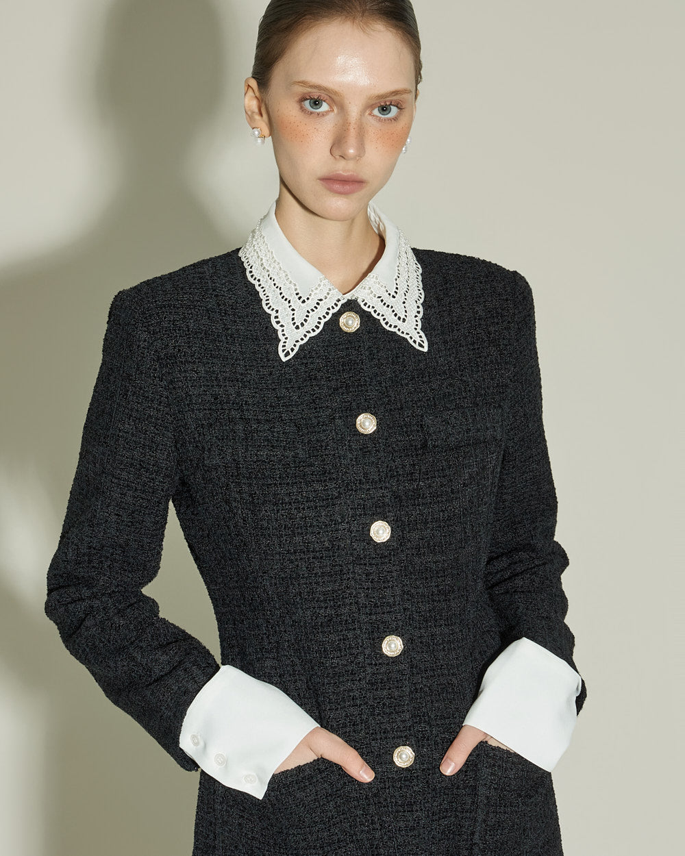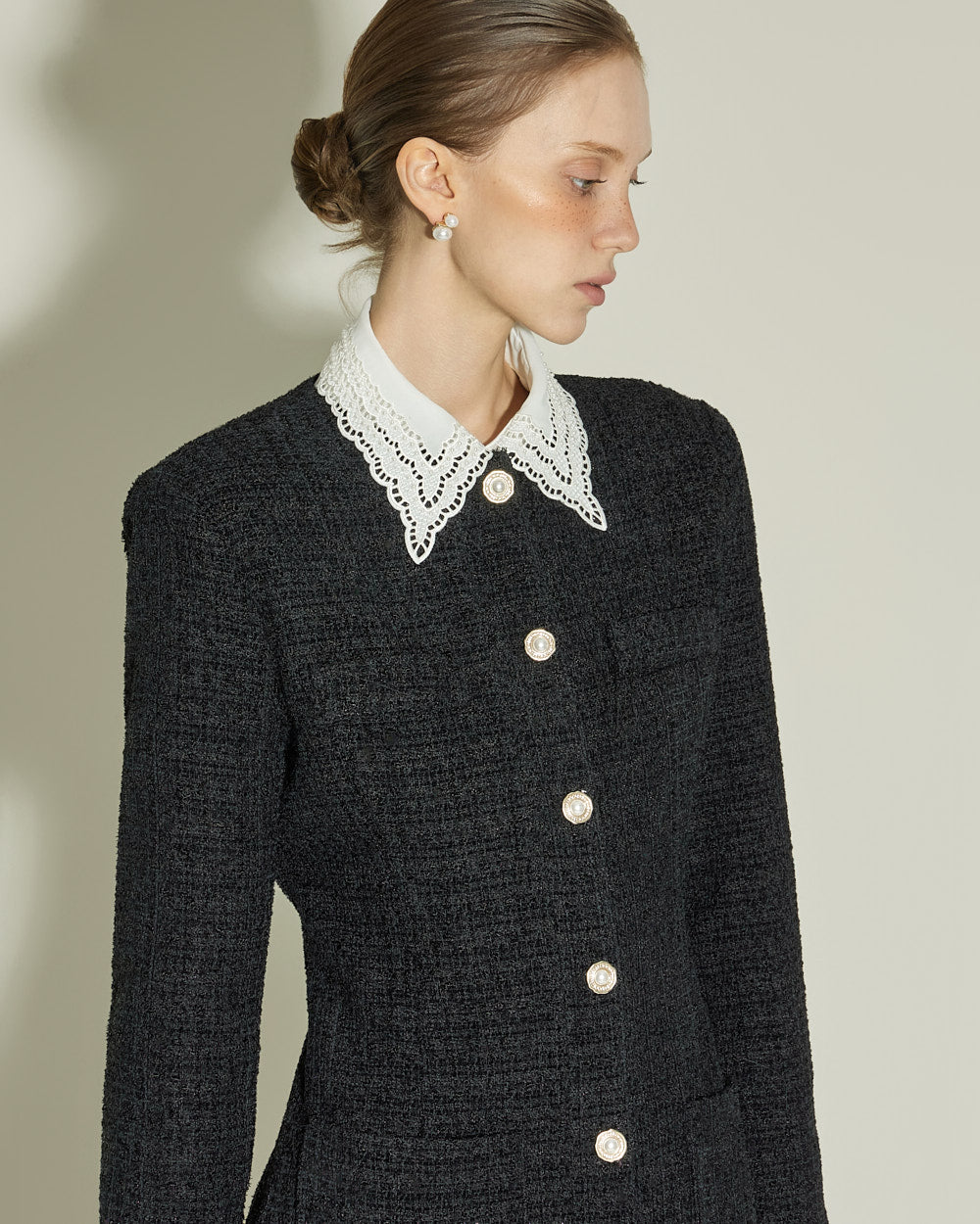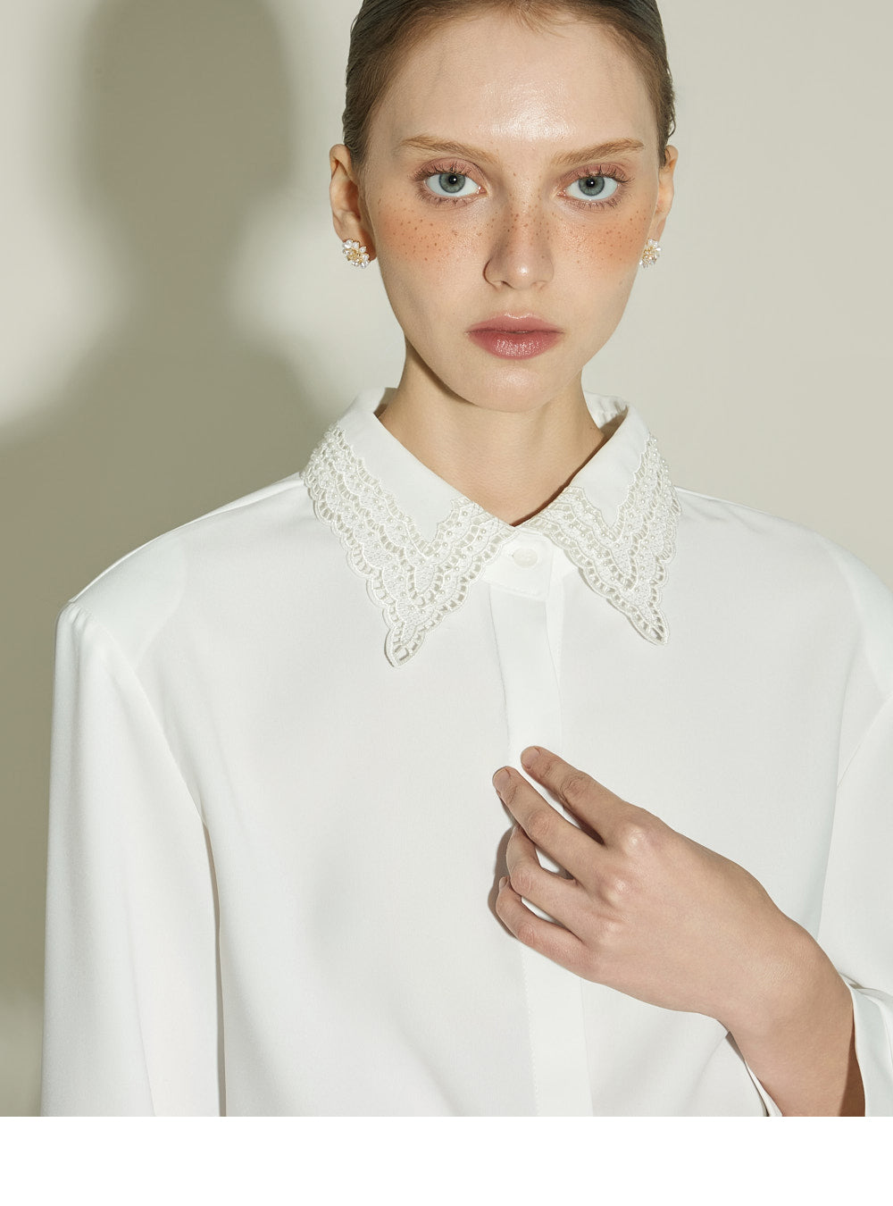 The perforated lace detailing along the collar adds a lovely, romantic touch,