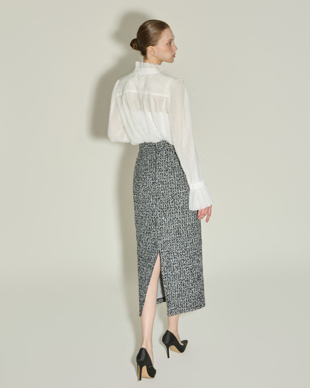 This elegant high-neck blouse features a frilled design.