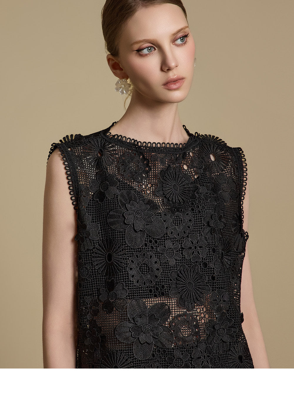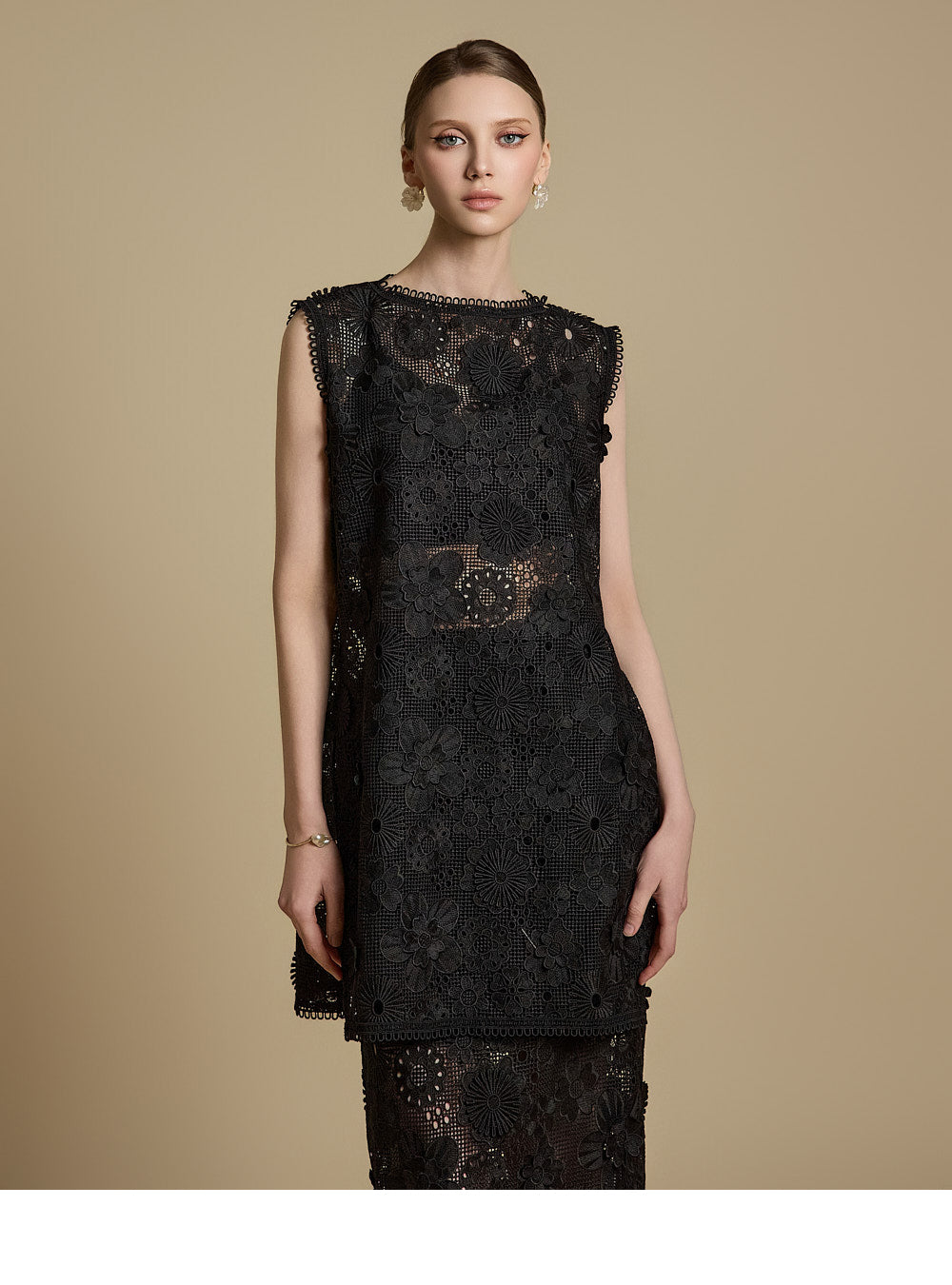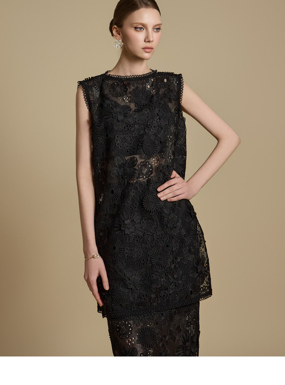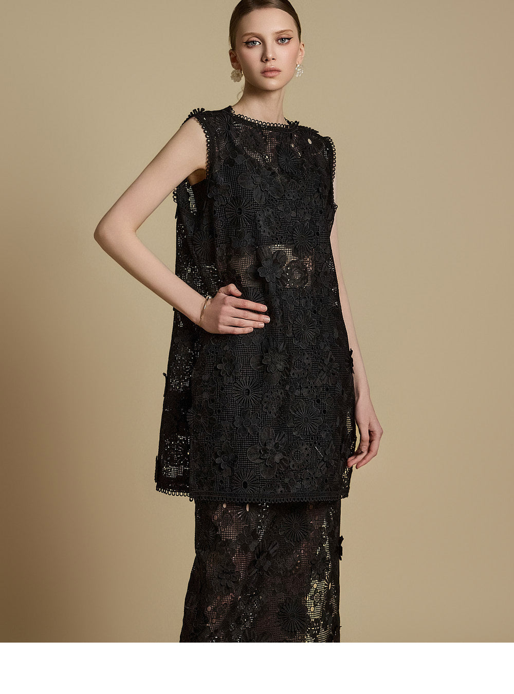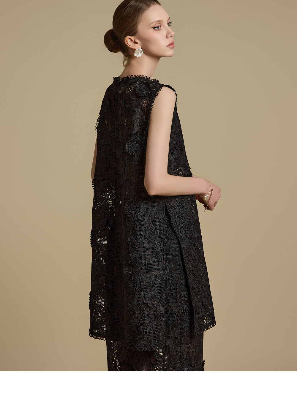 全体に施された繊細なレース刺繍がエレガントな雰囲気を醸し出す