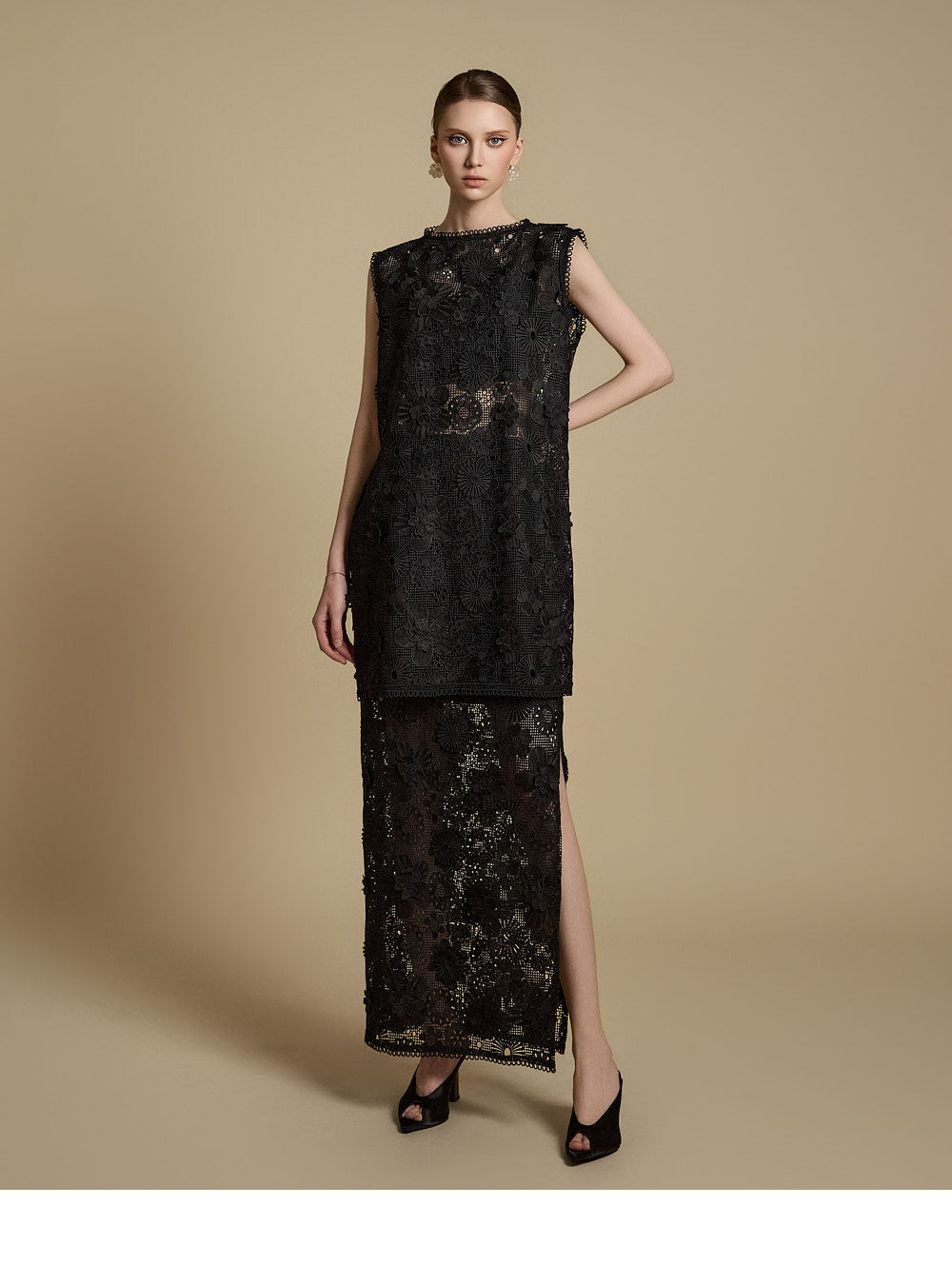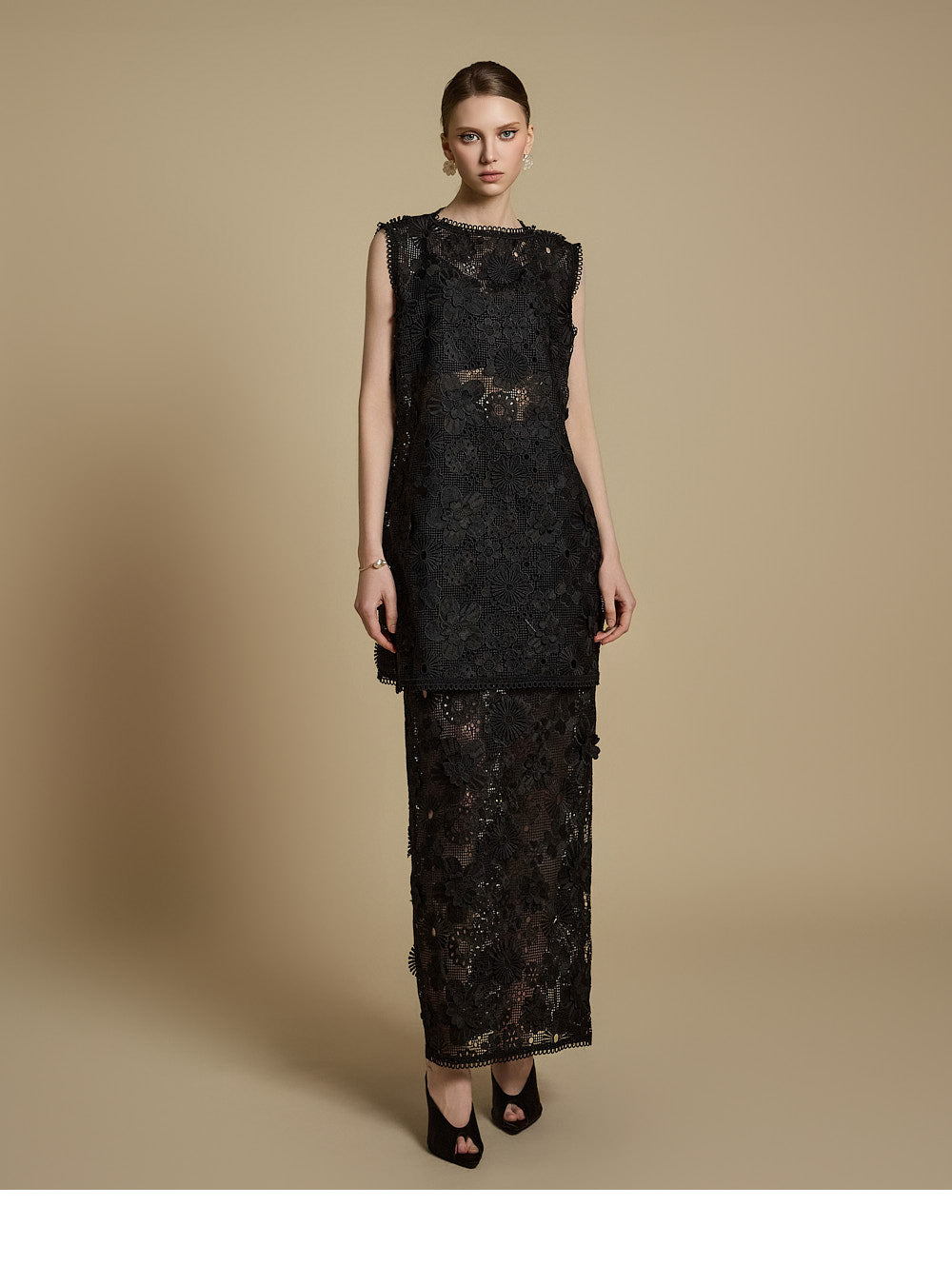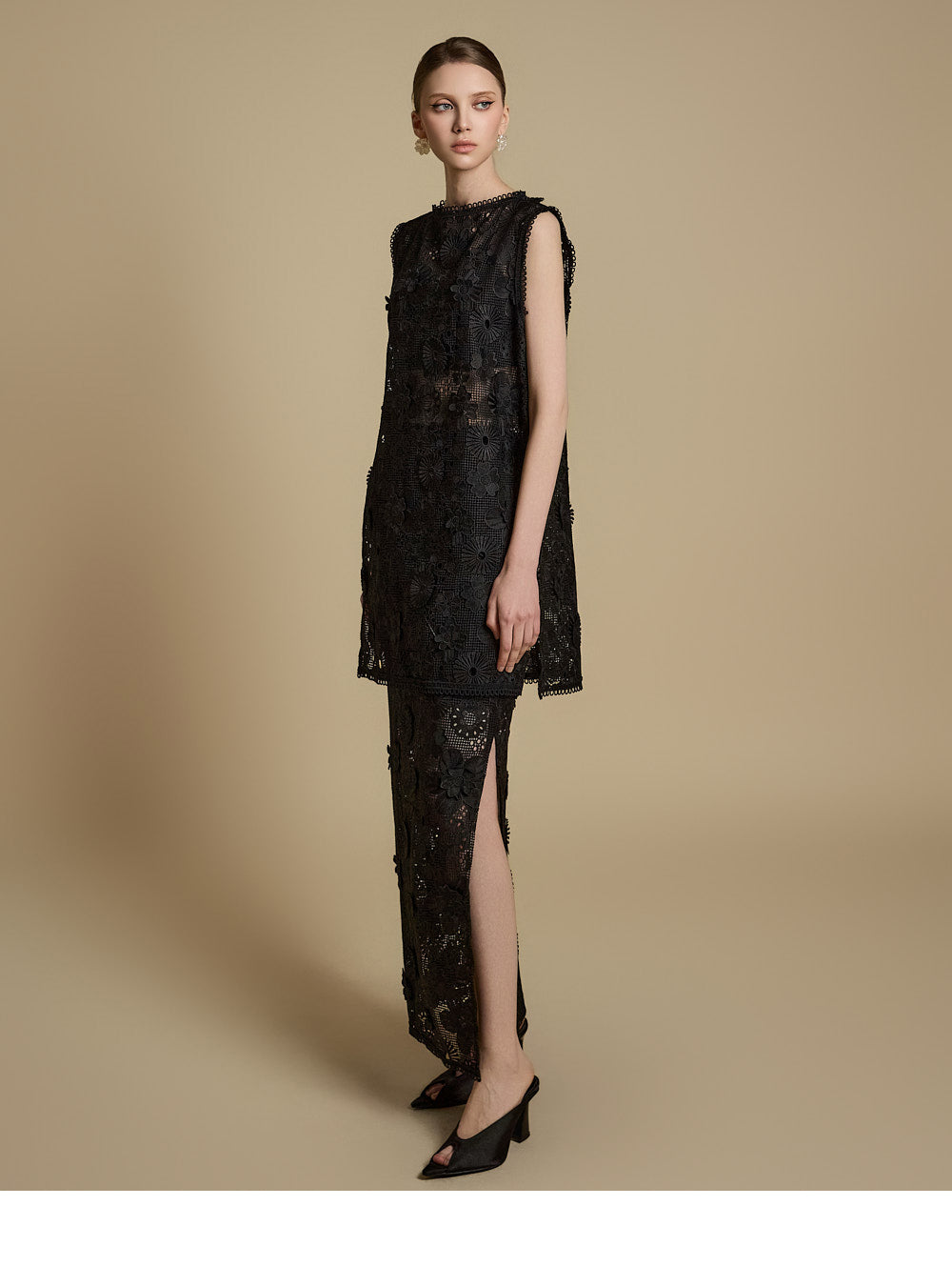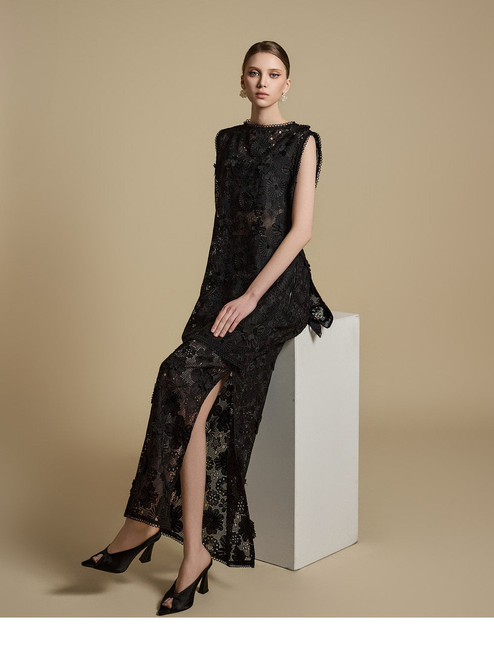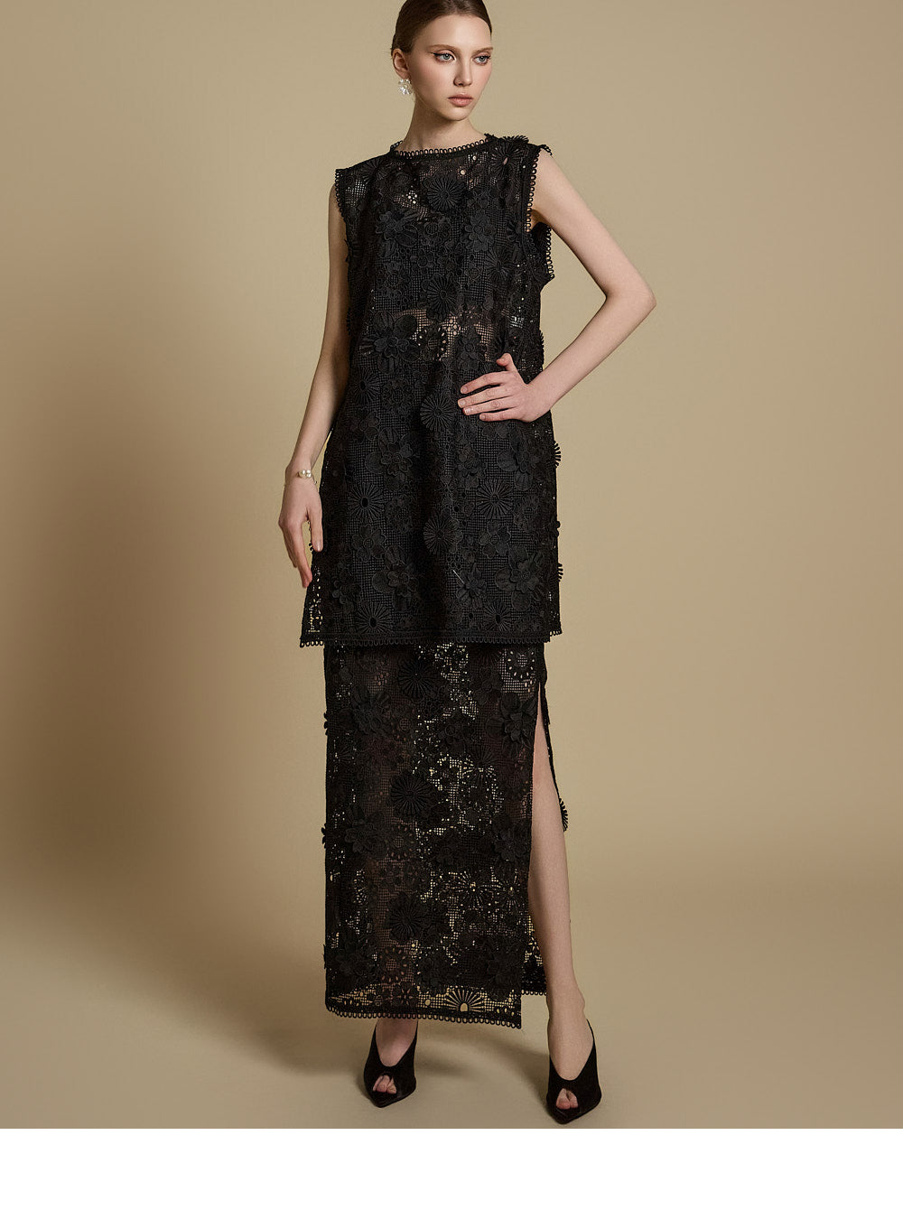 全体に施された繊細なレース刺繍がエレガントな雰囲気を醸し出す
