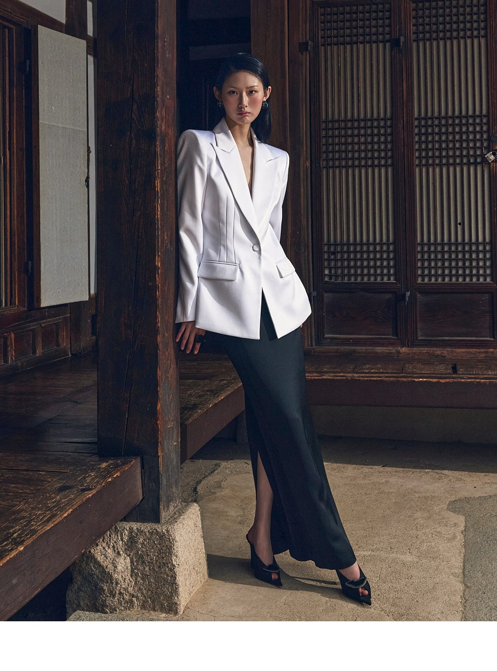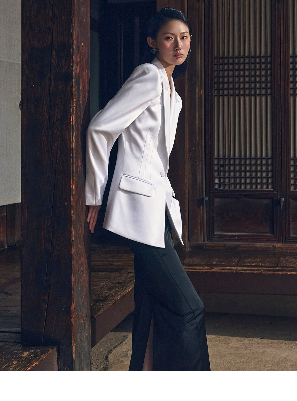 ウエストラインに施したピンタックディテールが着痩せ効果をプラスし、