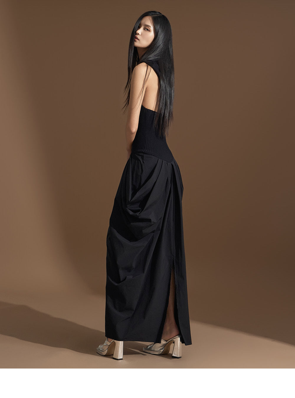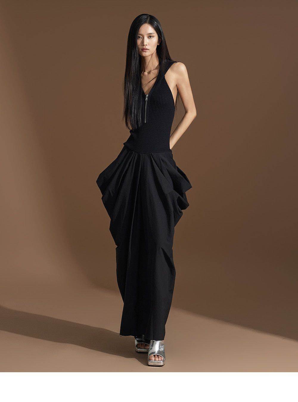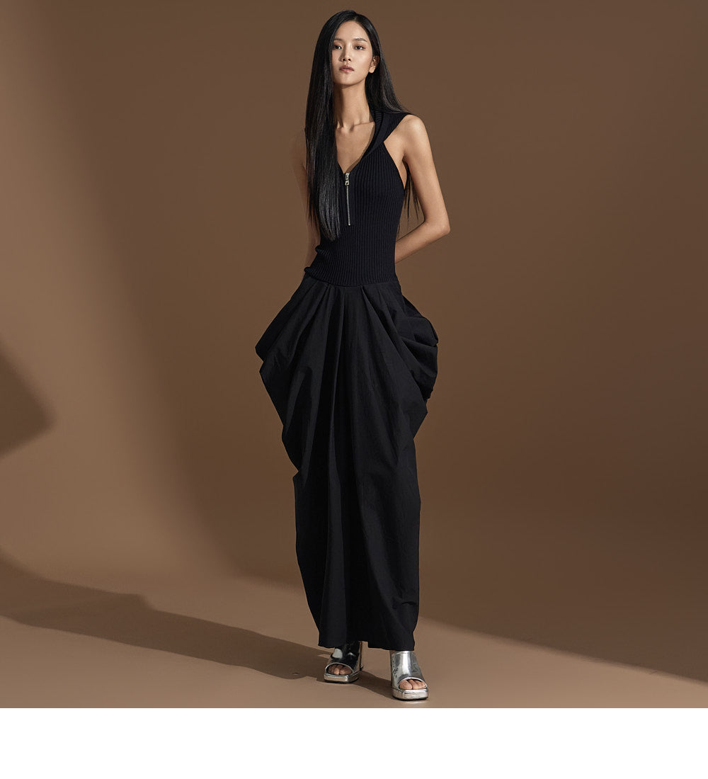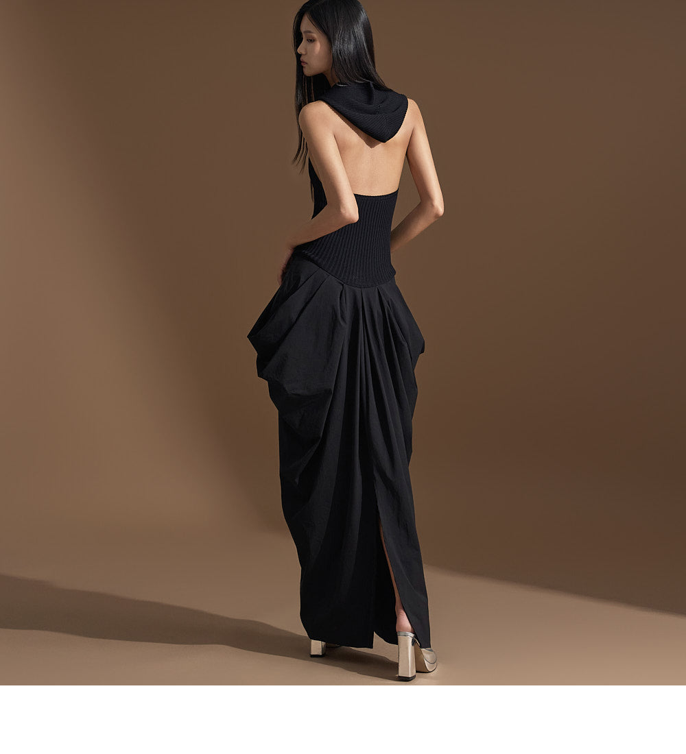 このユニークなドレープドレスは洗練された雰囲気を醸し出します。