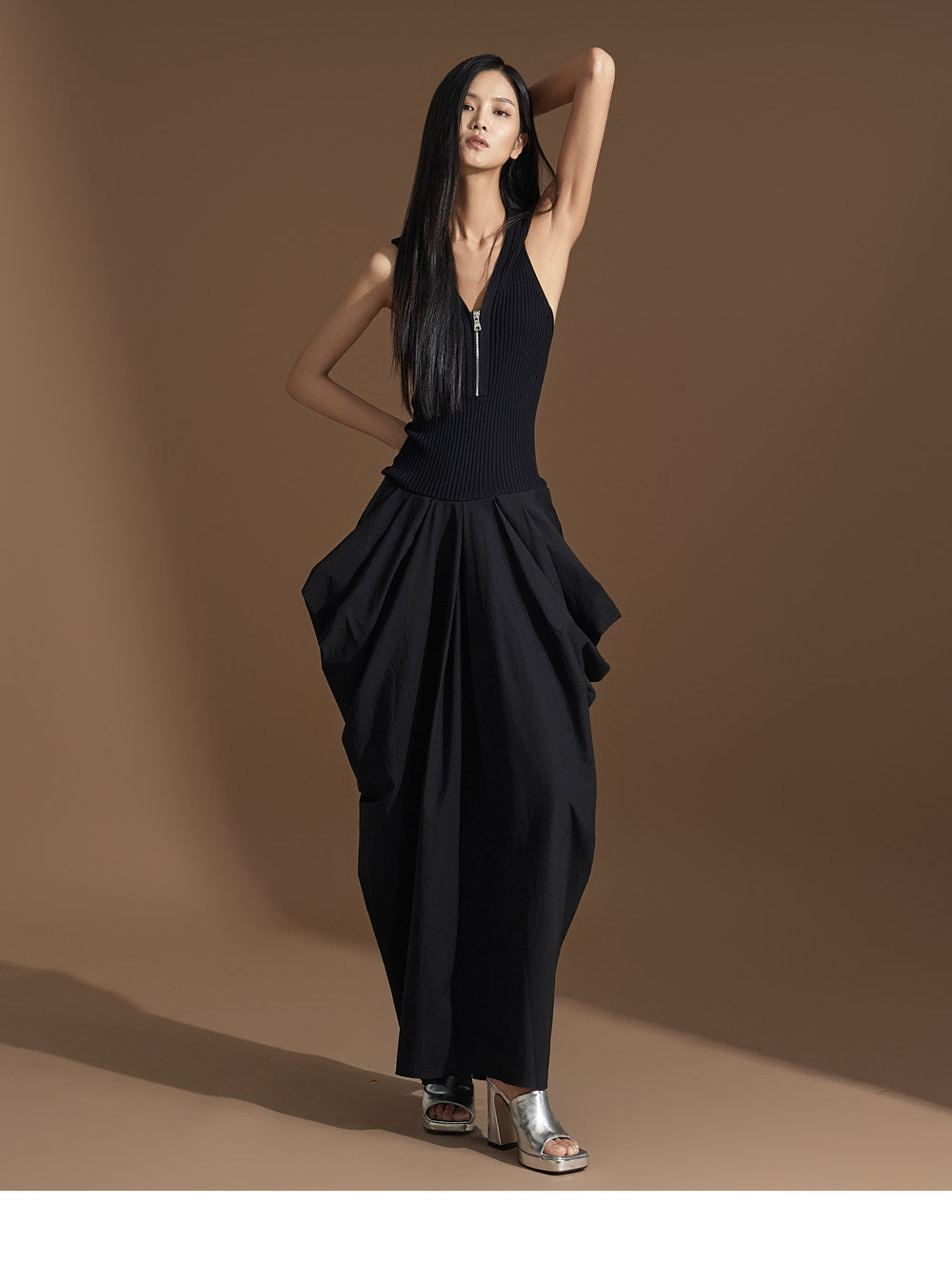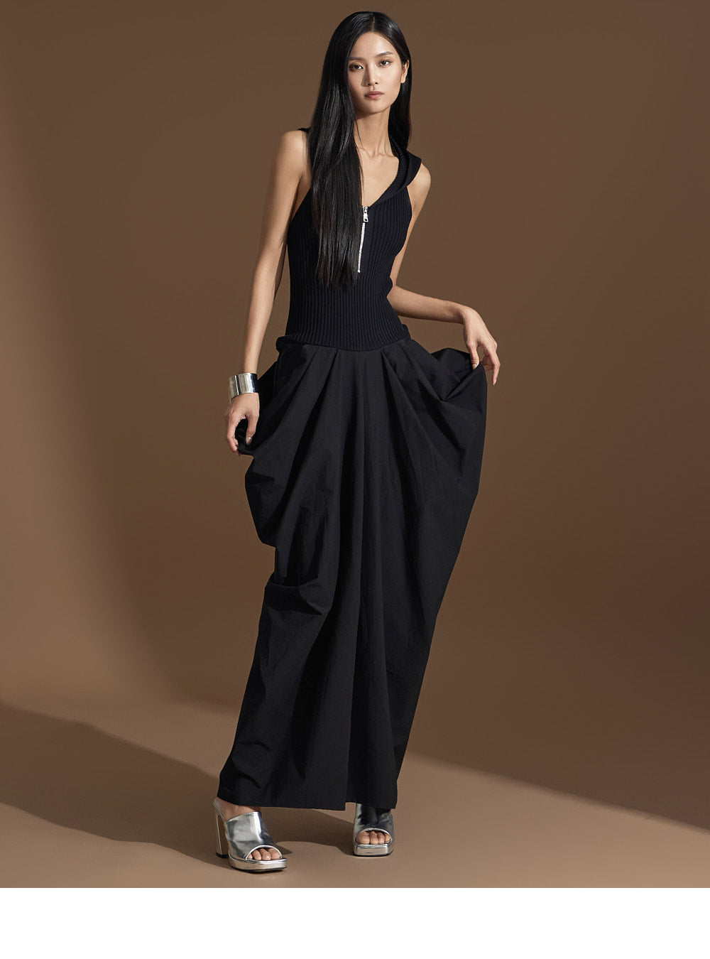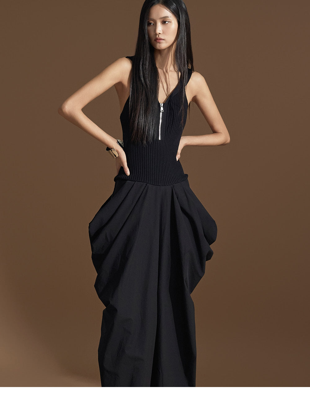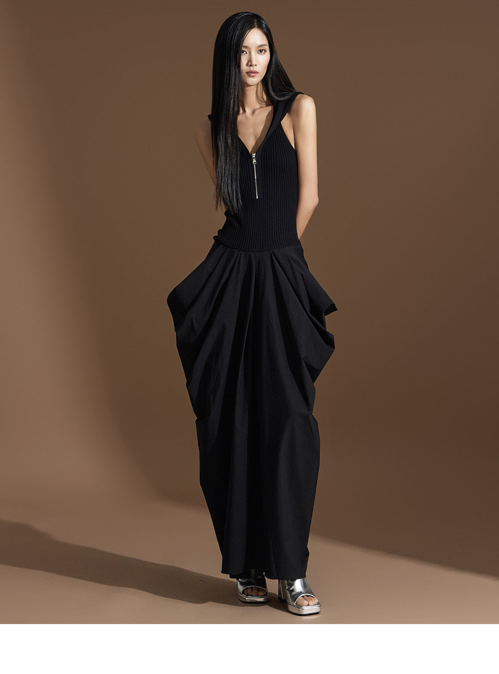 このユニークなドレープドレスは洗練された雰囲気を醸し出します。