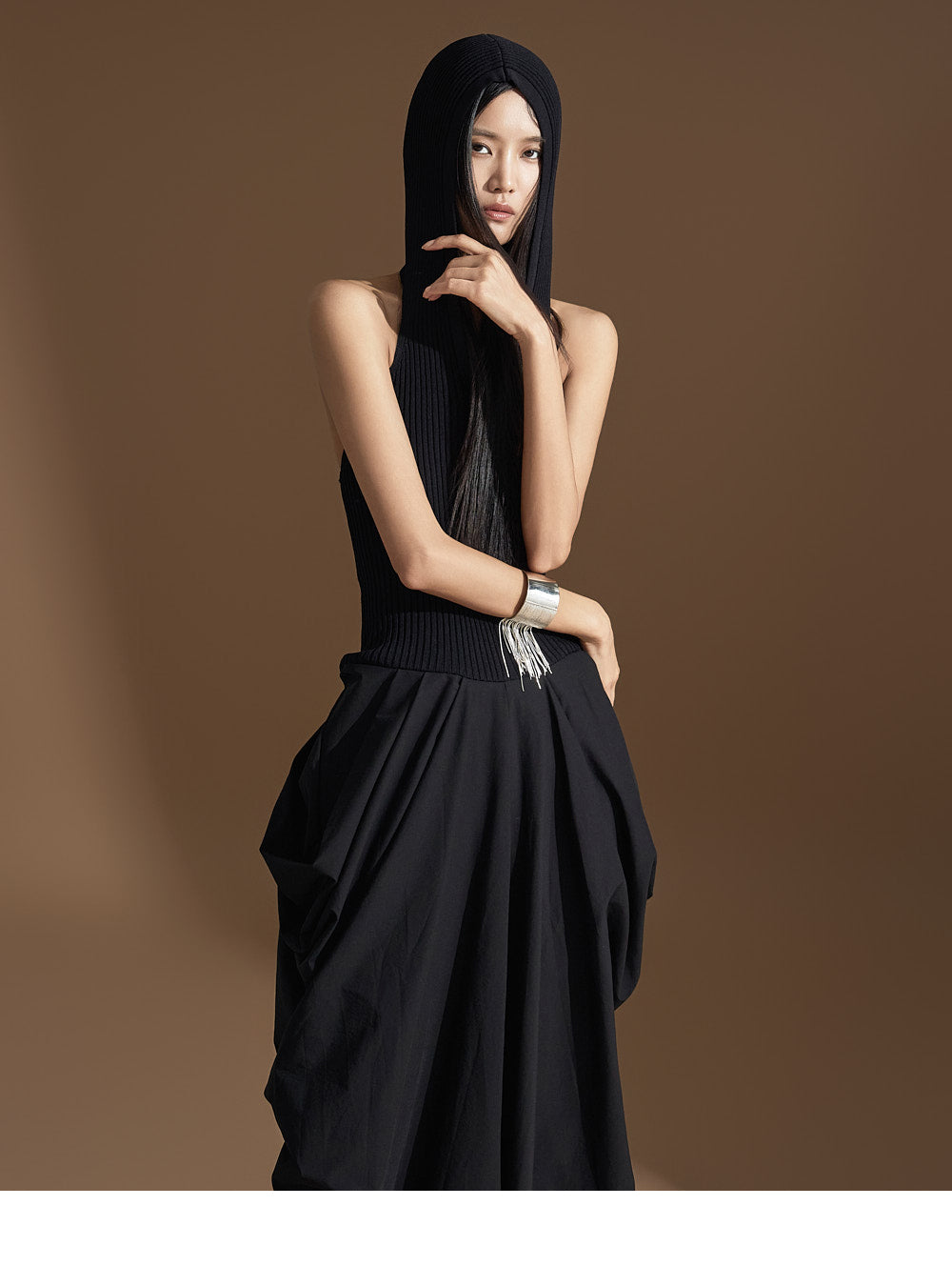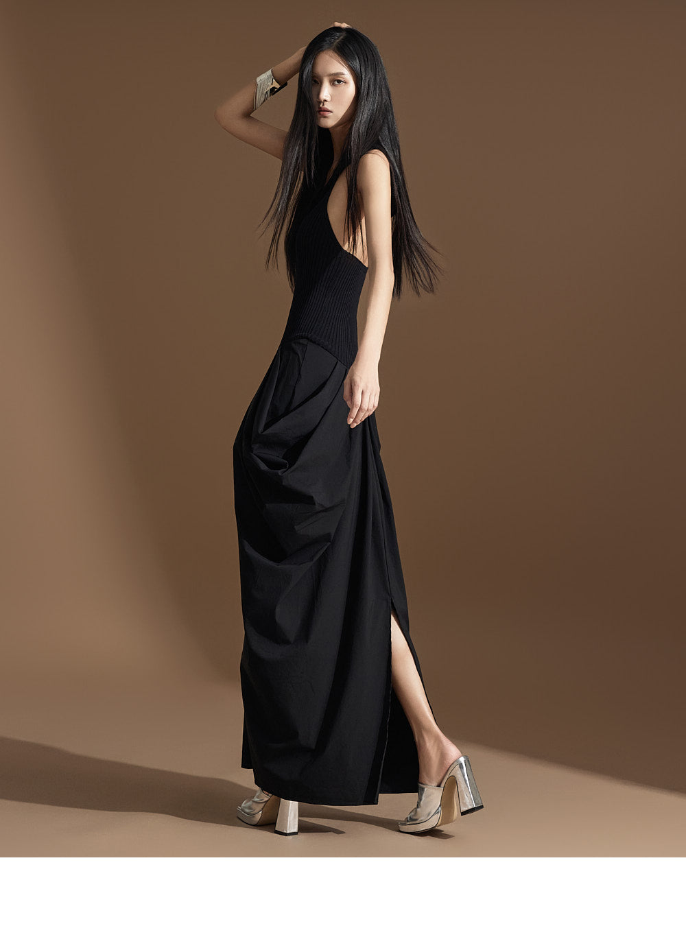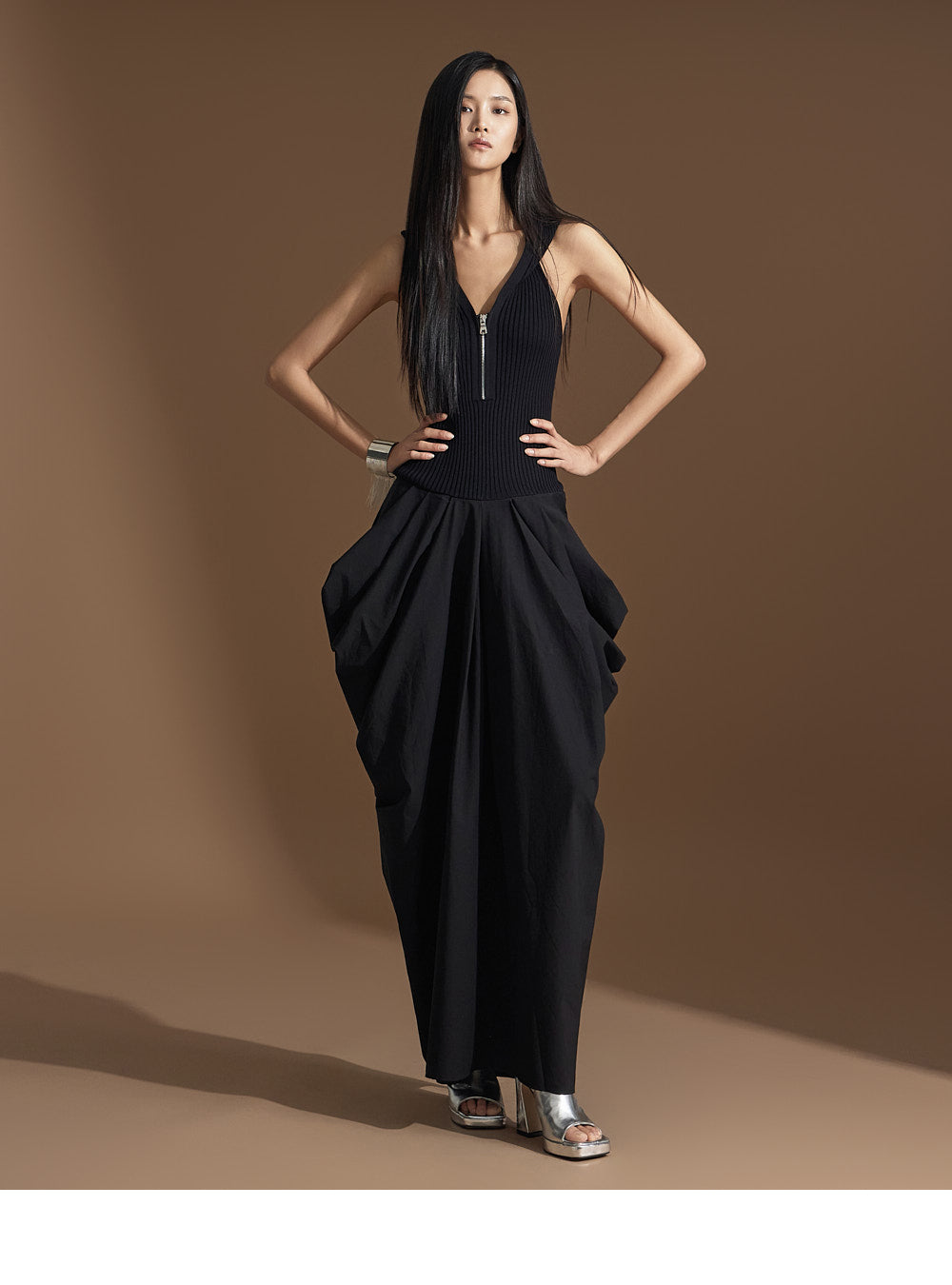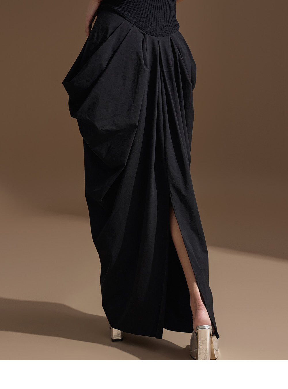 このユニークなドレープドレスは洗練された雰囲気を醸し出します。
