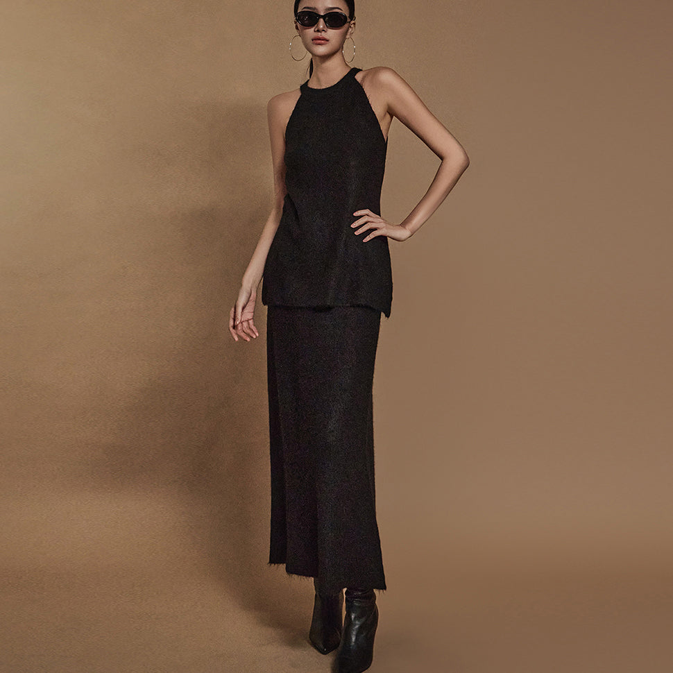 ホルターネックが上品な印象を与え、ノースリーブのデザインで動きやすさも抜群です。