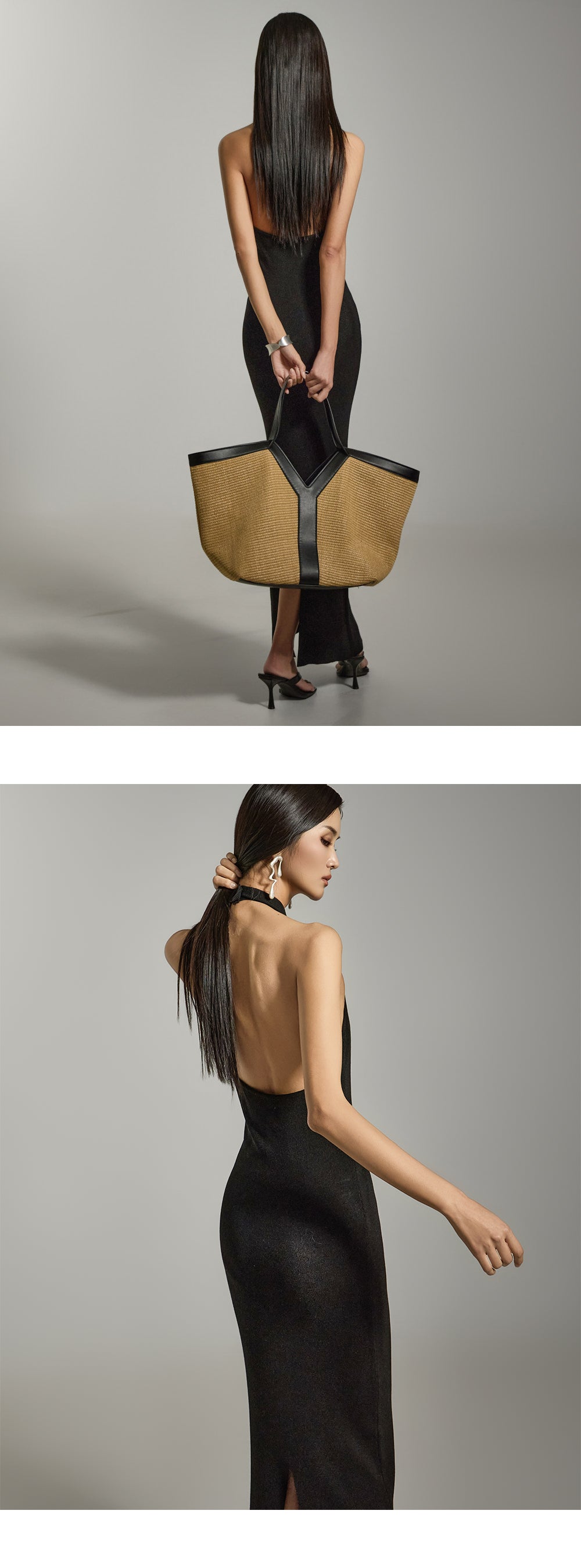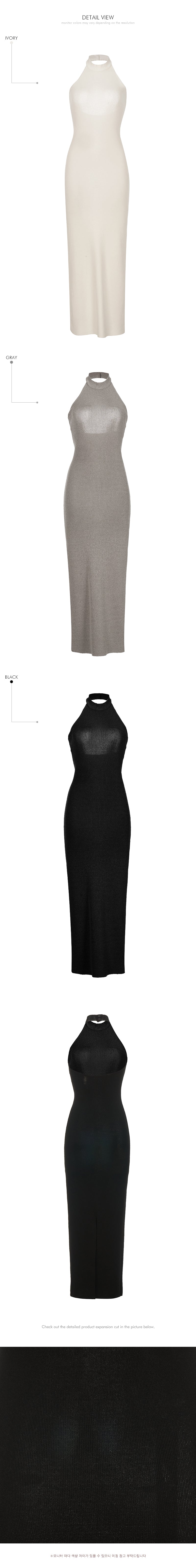 このホルターネックのロングドレスはエレガントでフェミニンな印象を与えます。