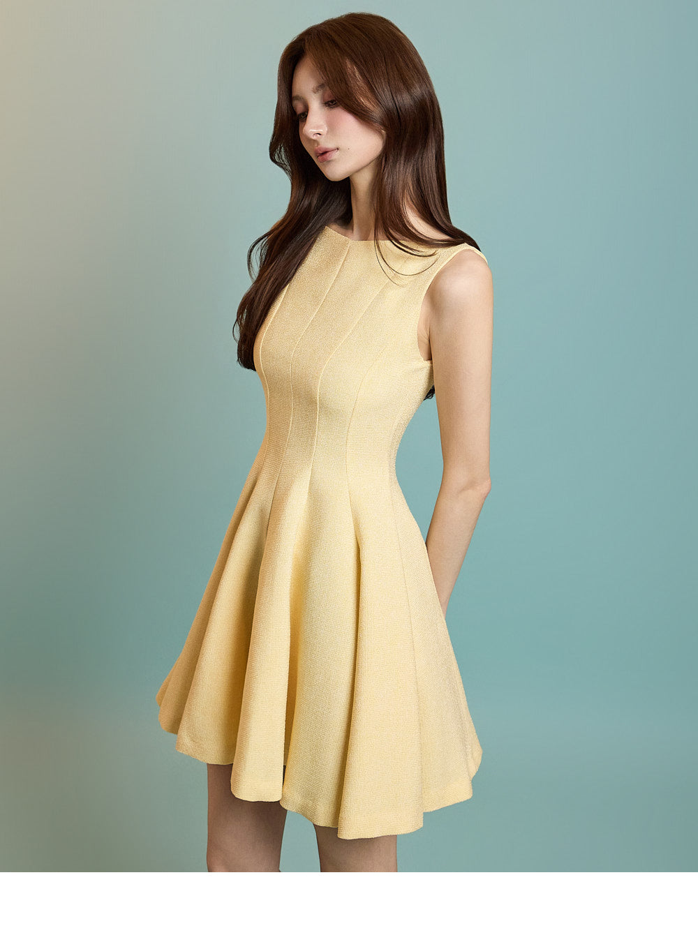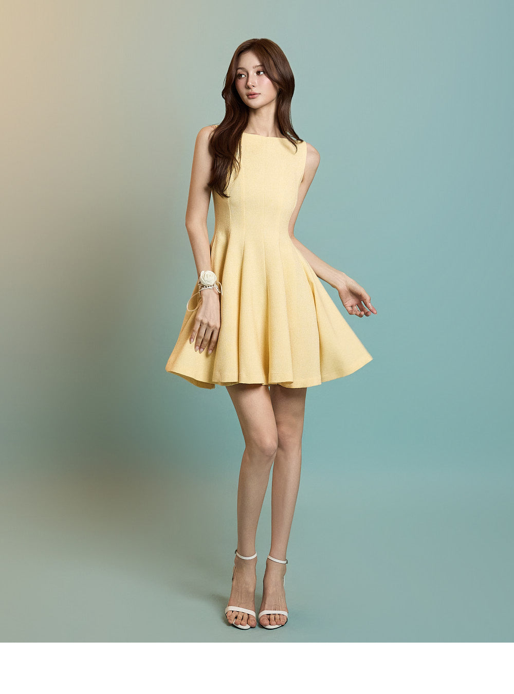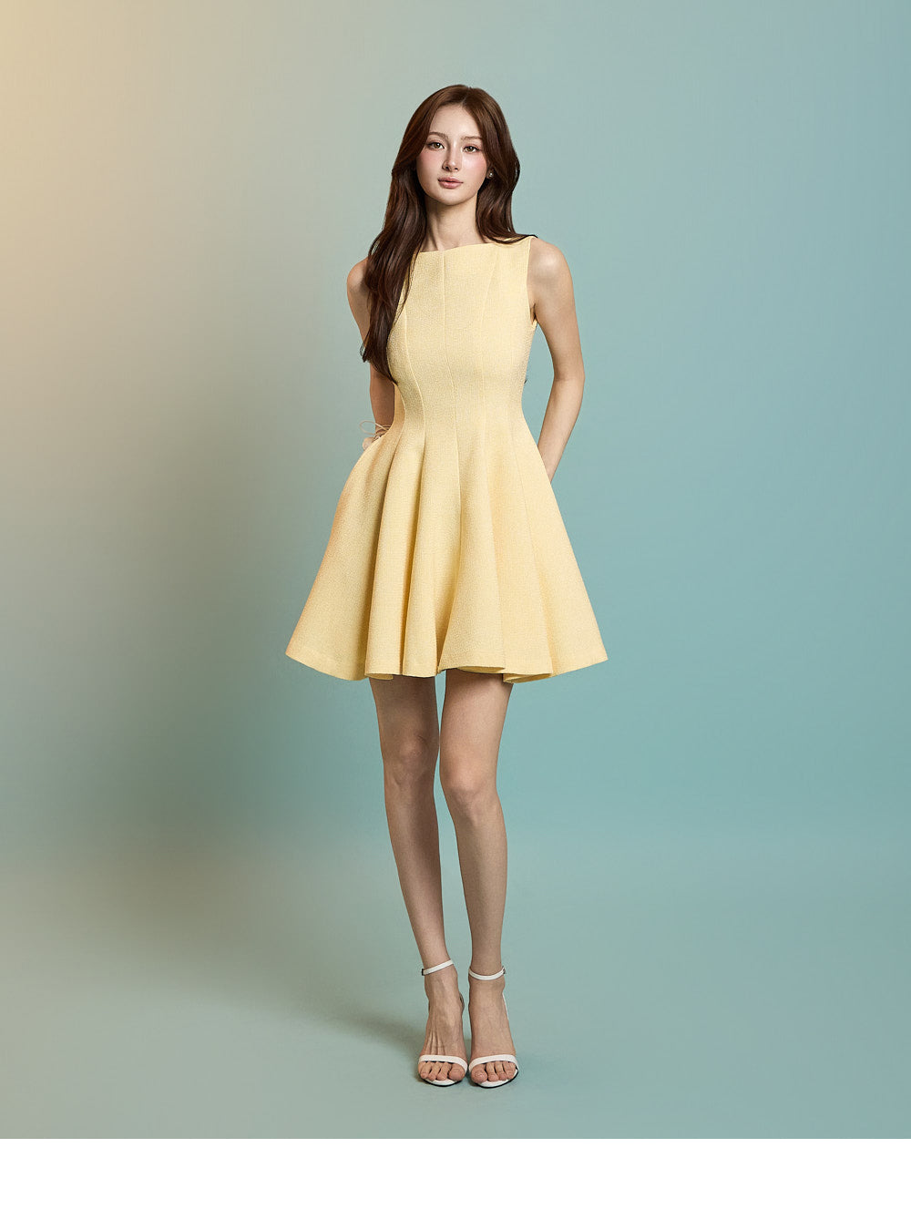 Aラインシルエットとミニ丈で、明るくフェミニンな印象に。