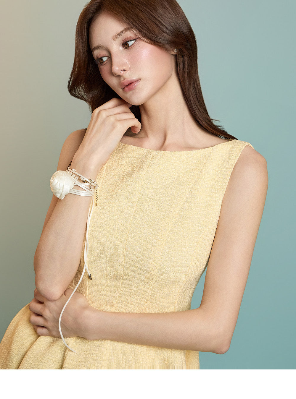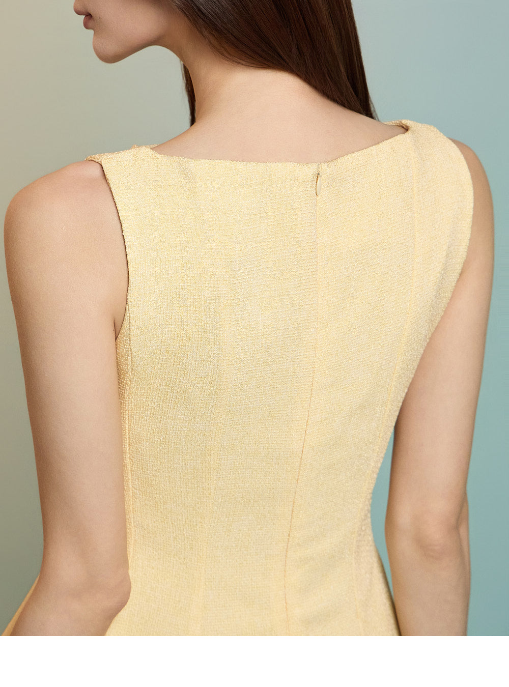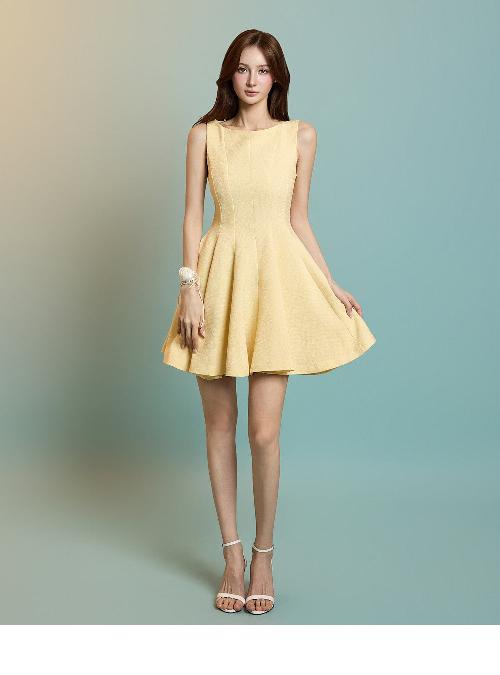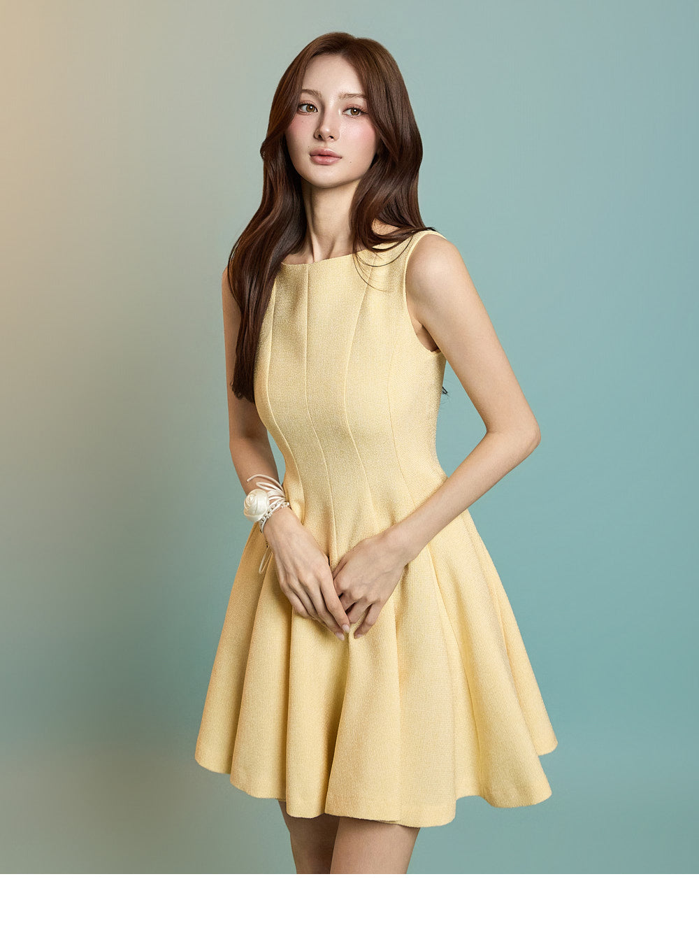 Aラインシルエットとミニ丈で、明るくフェミニンな印象に。