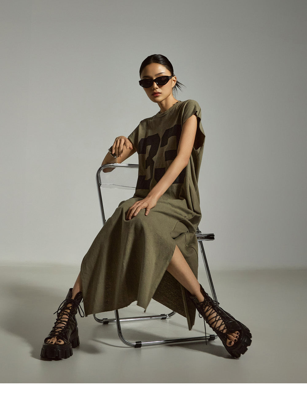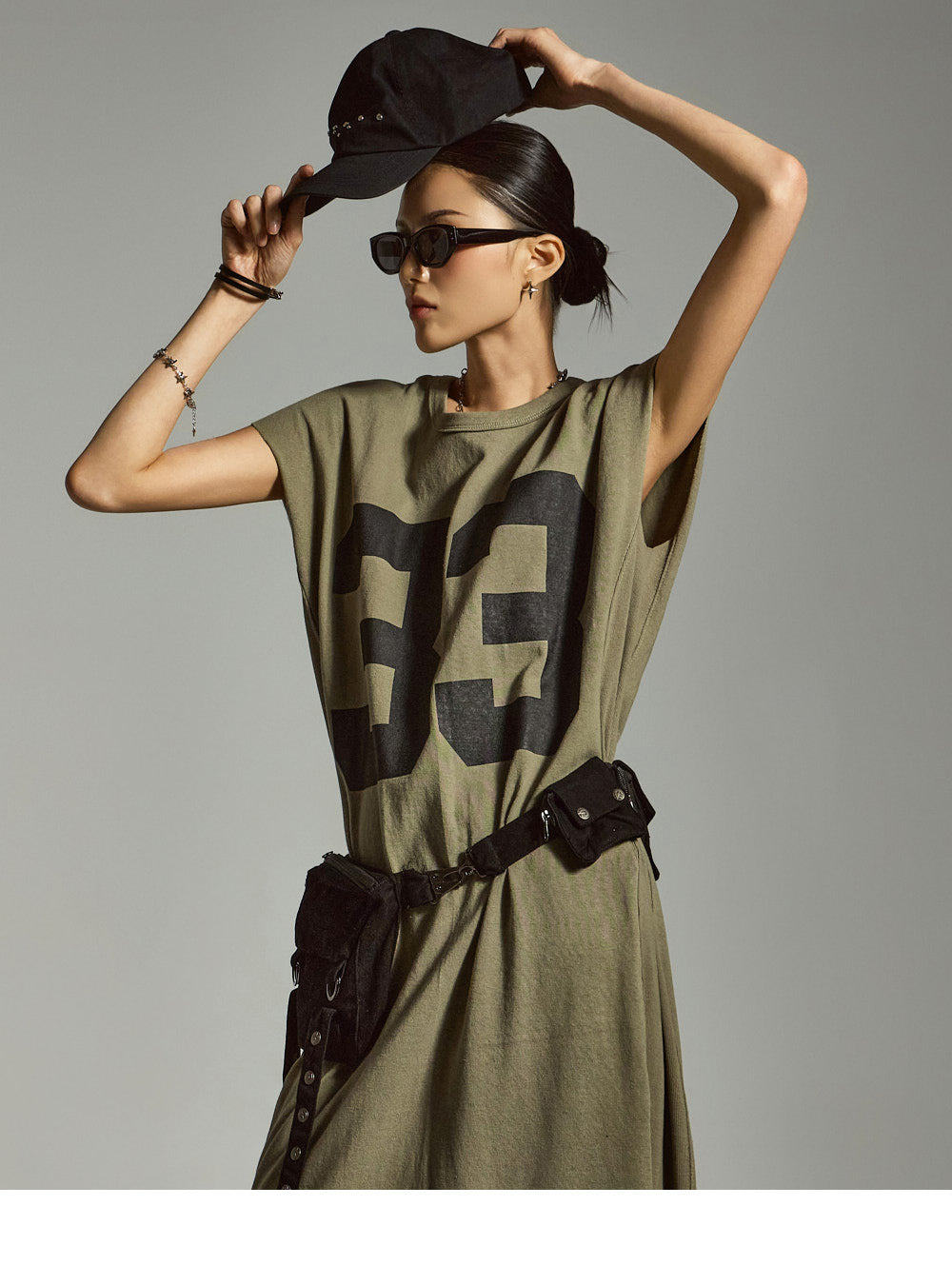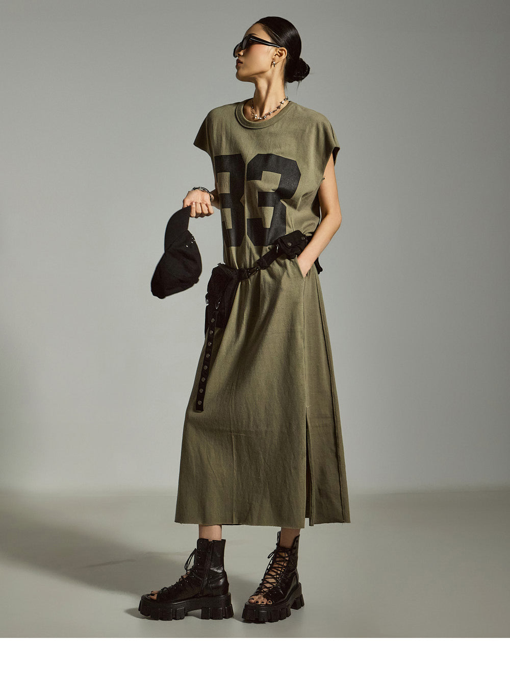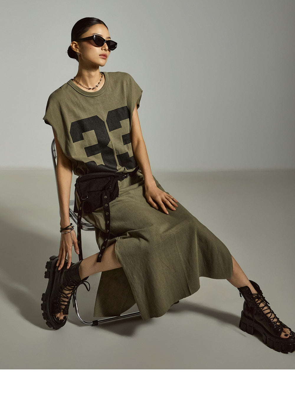 フロントのレタリングプリントと切りっぱなしのディテールが