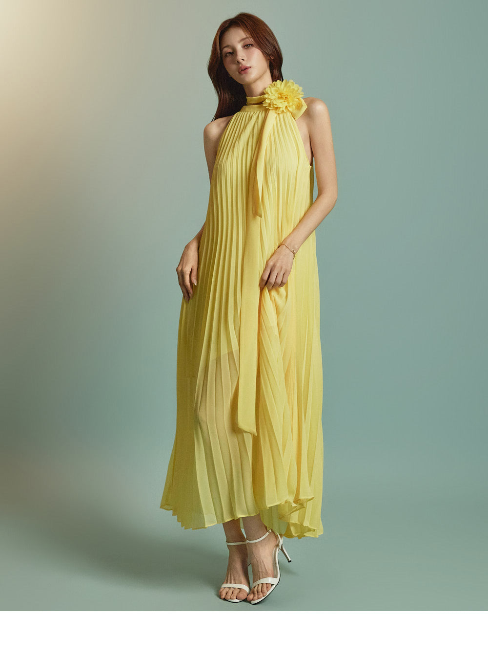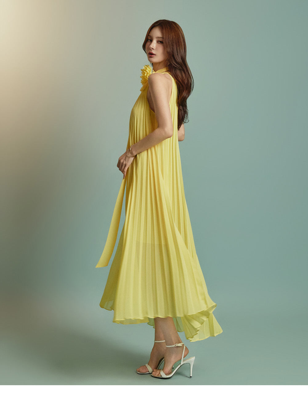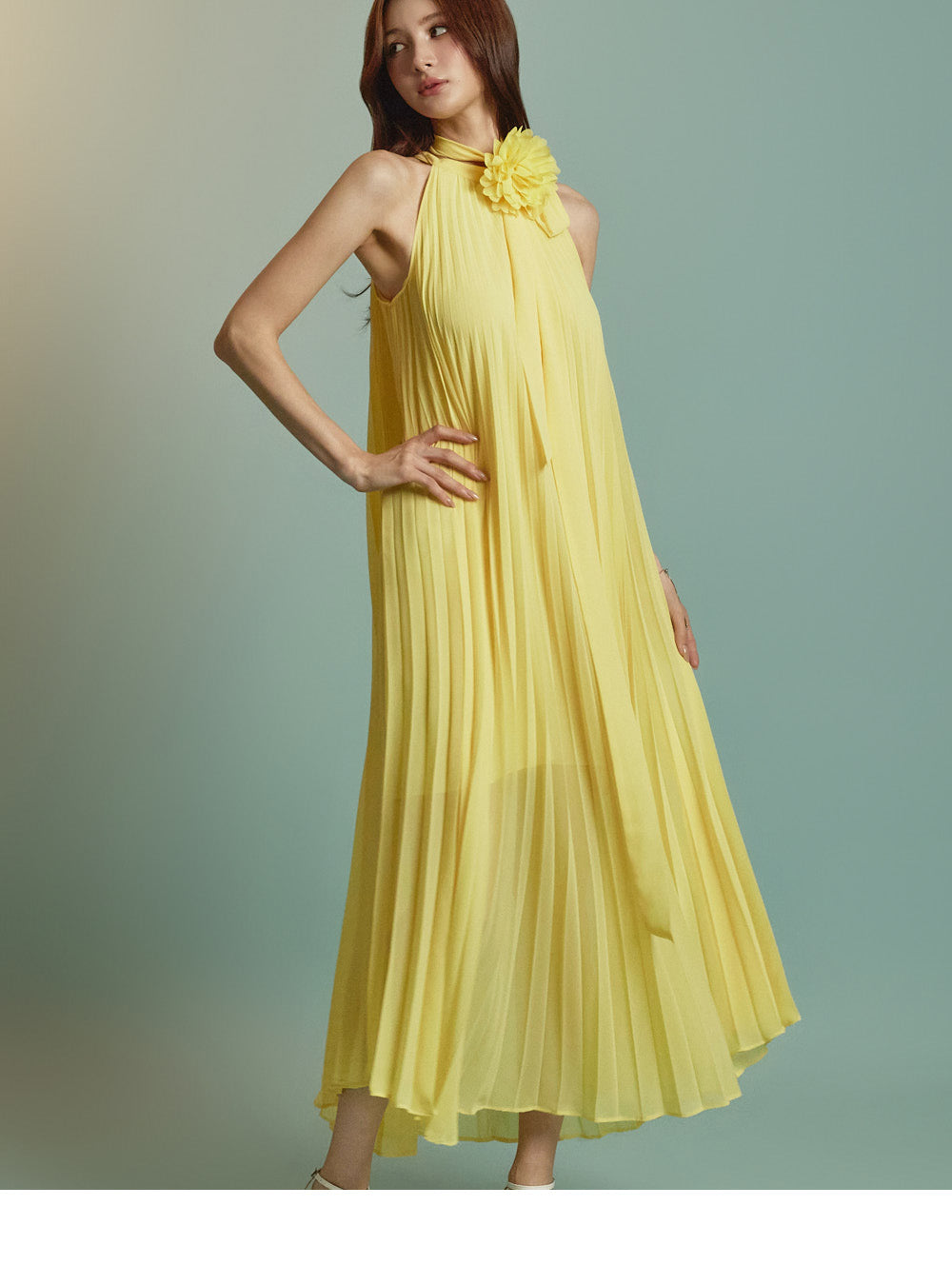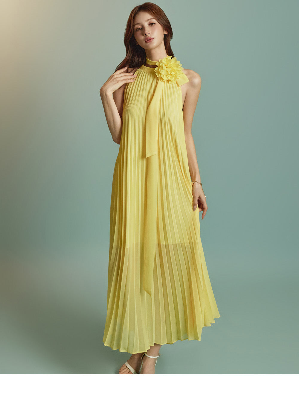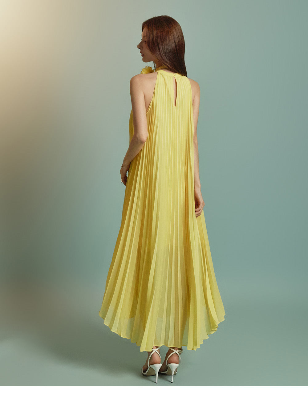 The halter-style, sleeveless cut beautifully highlights the shoulders and neckline, enhancing a gentle and elegant look.
