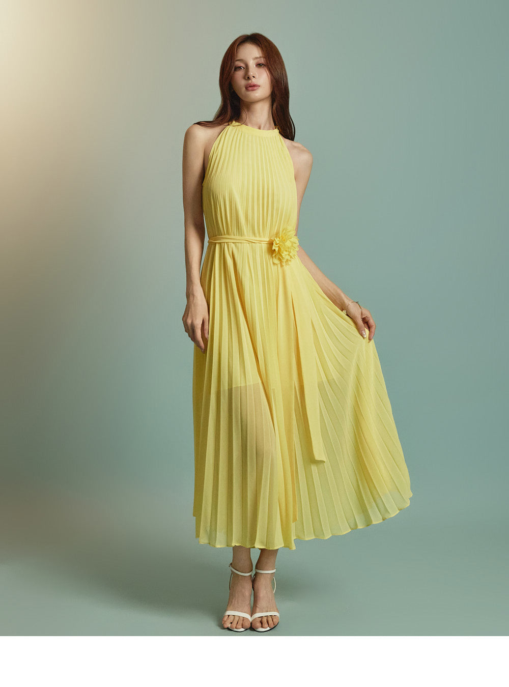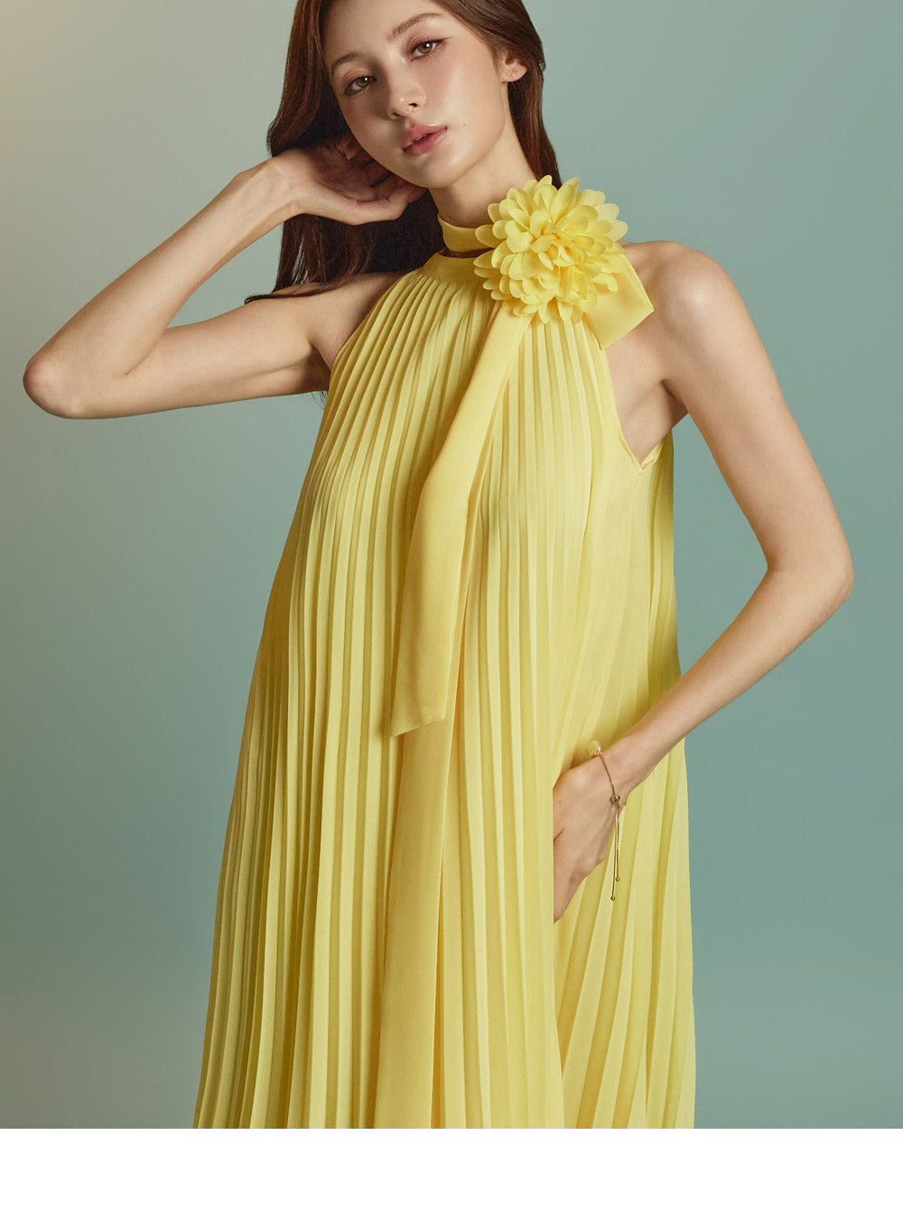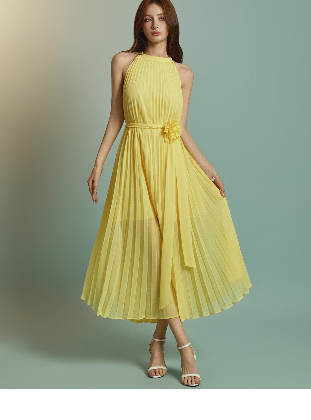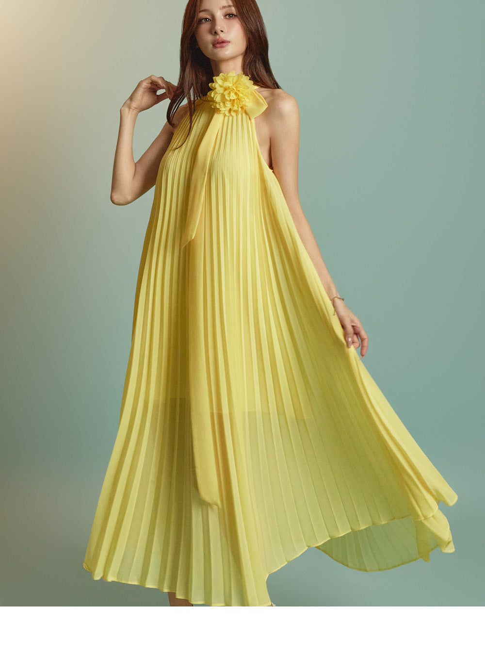 The halter-style, sleeveless cut beautifully highlights the shoulders and neckline, enhancing a gentle and elegant look.