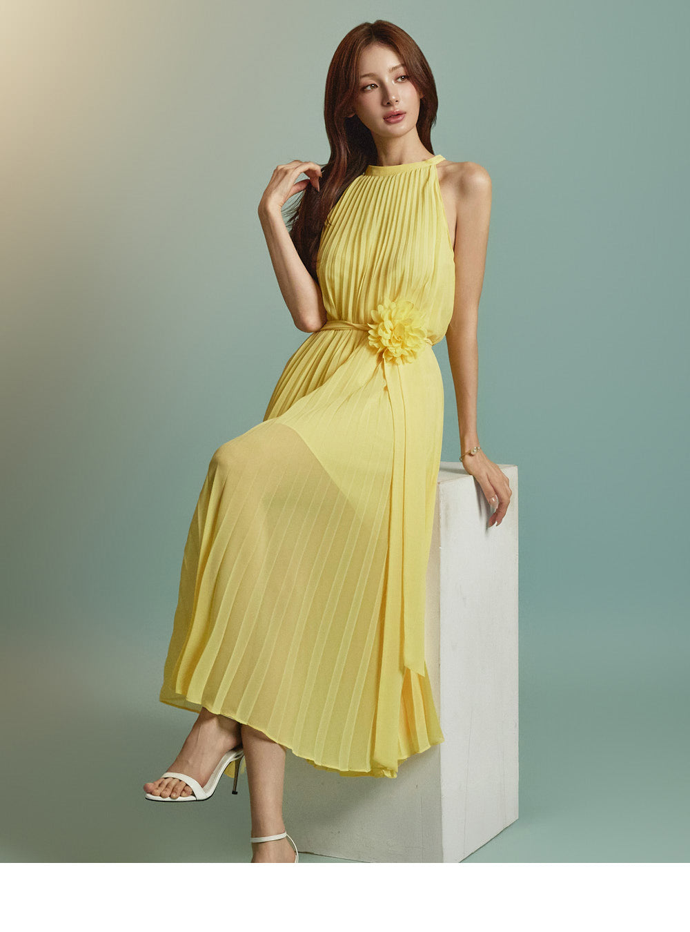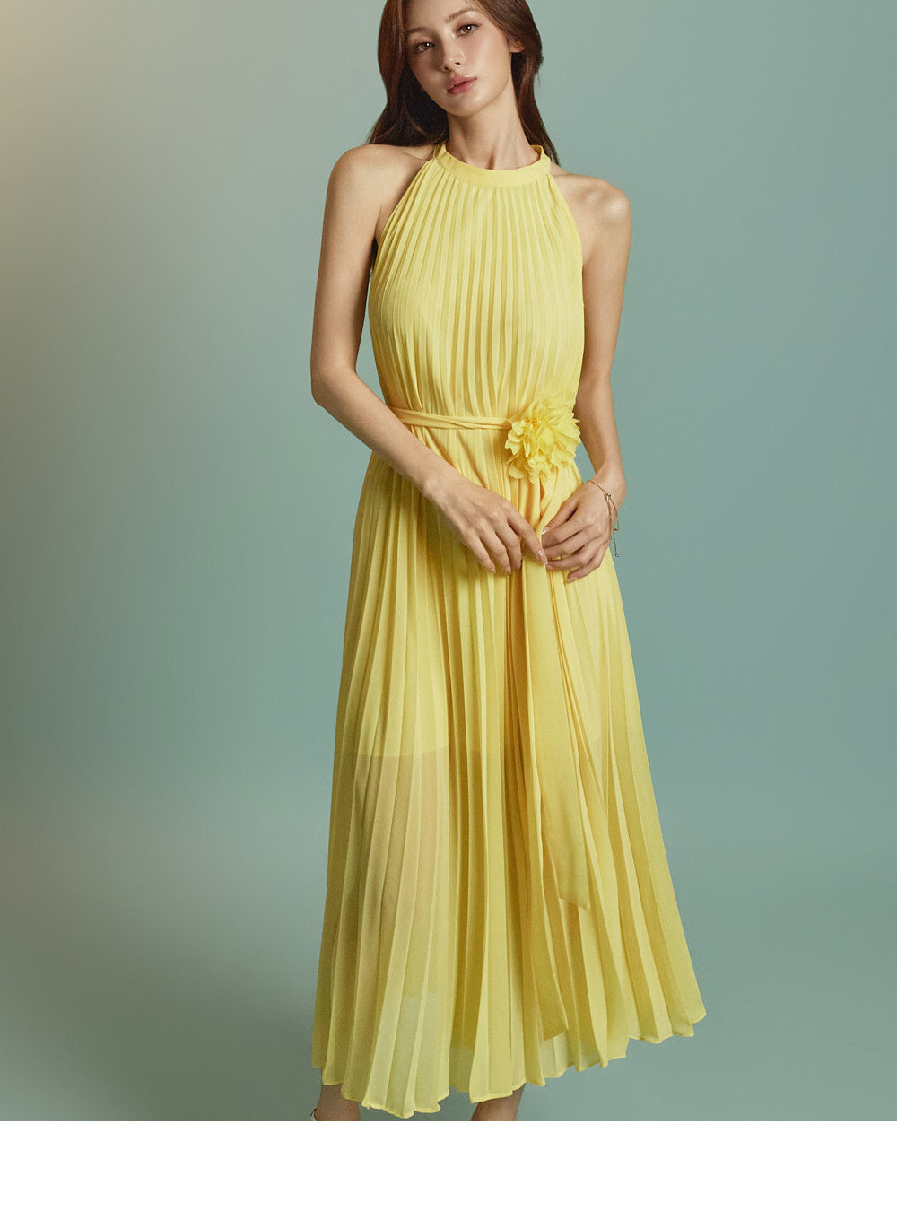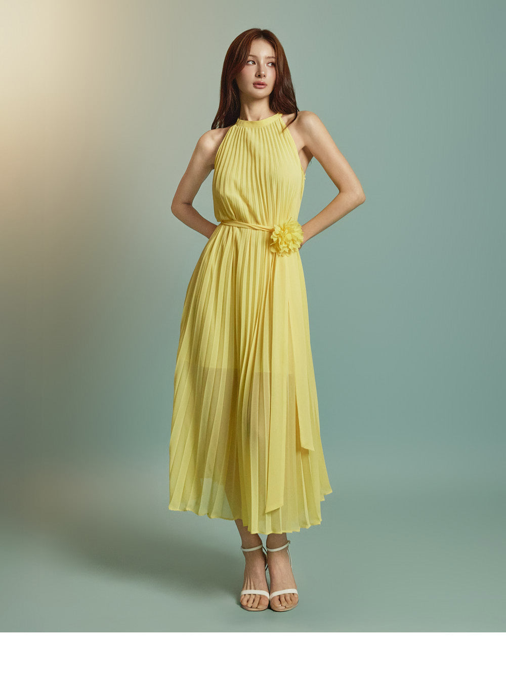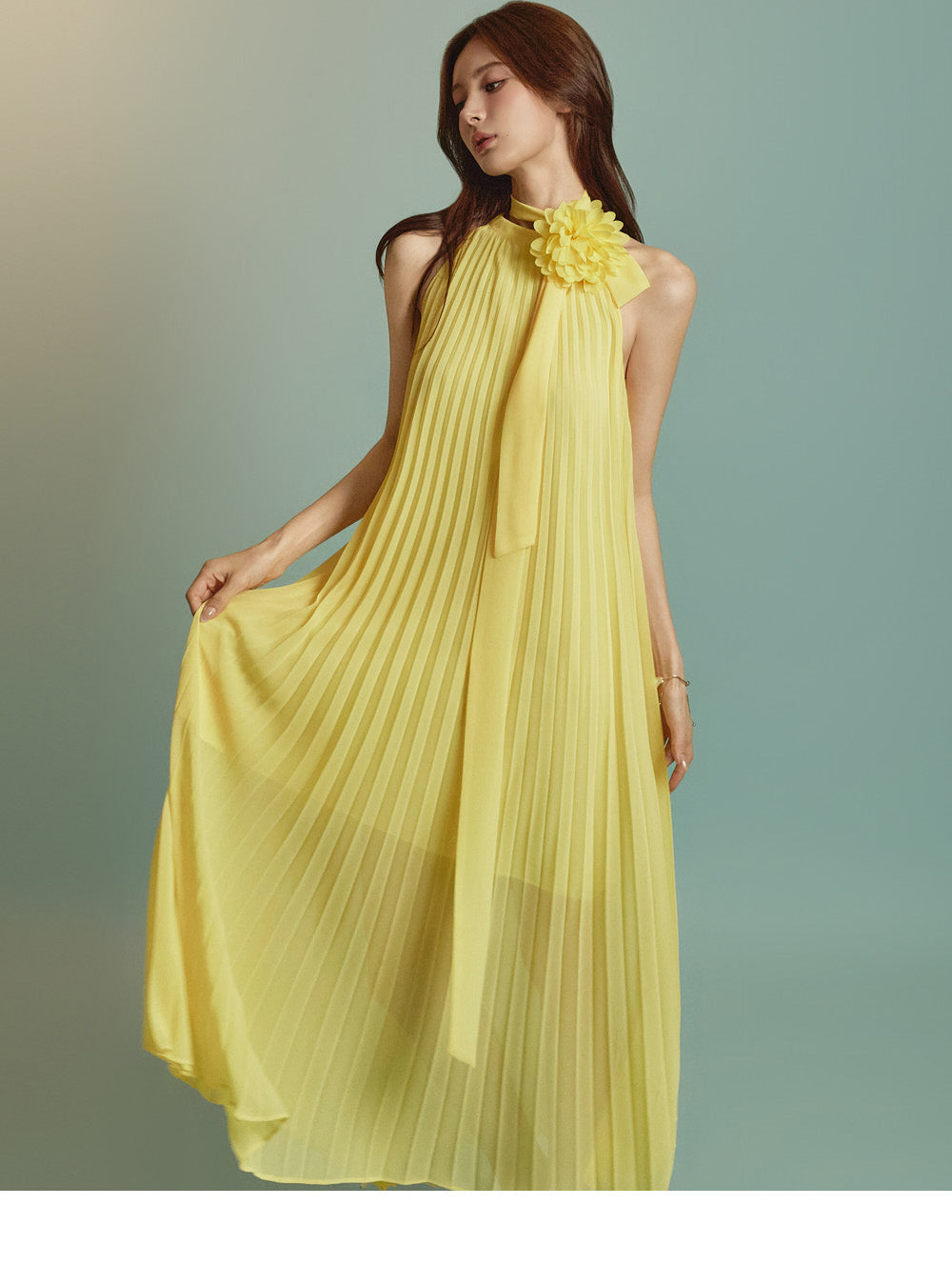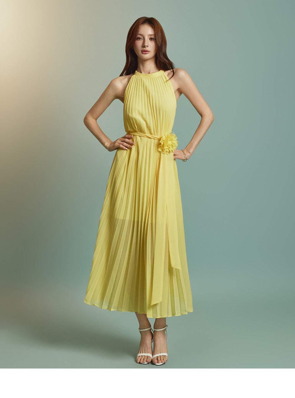 The halter-style, sleeveless cut beautifully highlights the shoulders and neckline, enhancing a gentle and elegant look.