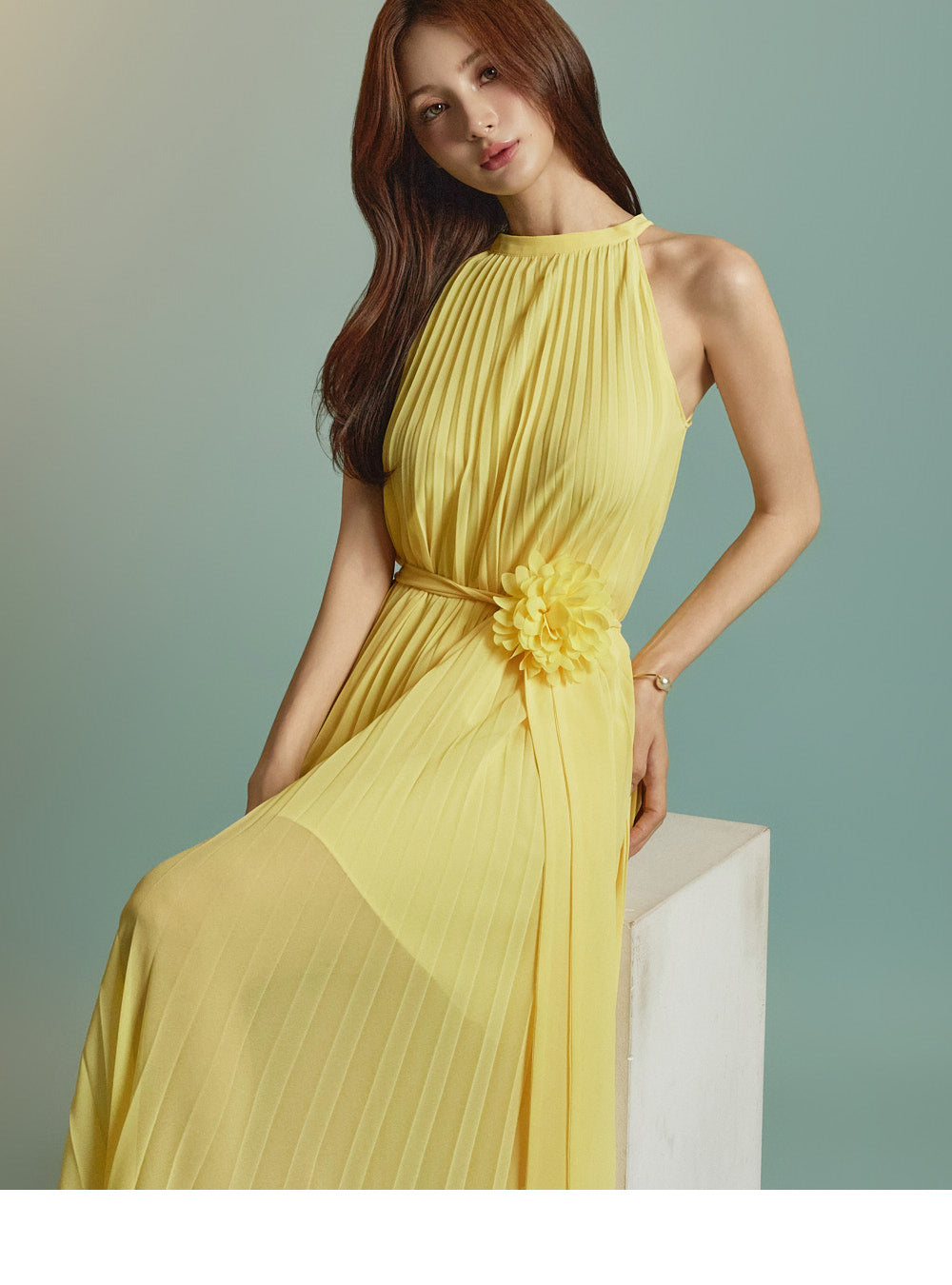 The dress features a pleated design that adds