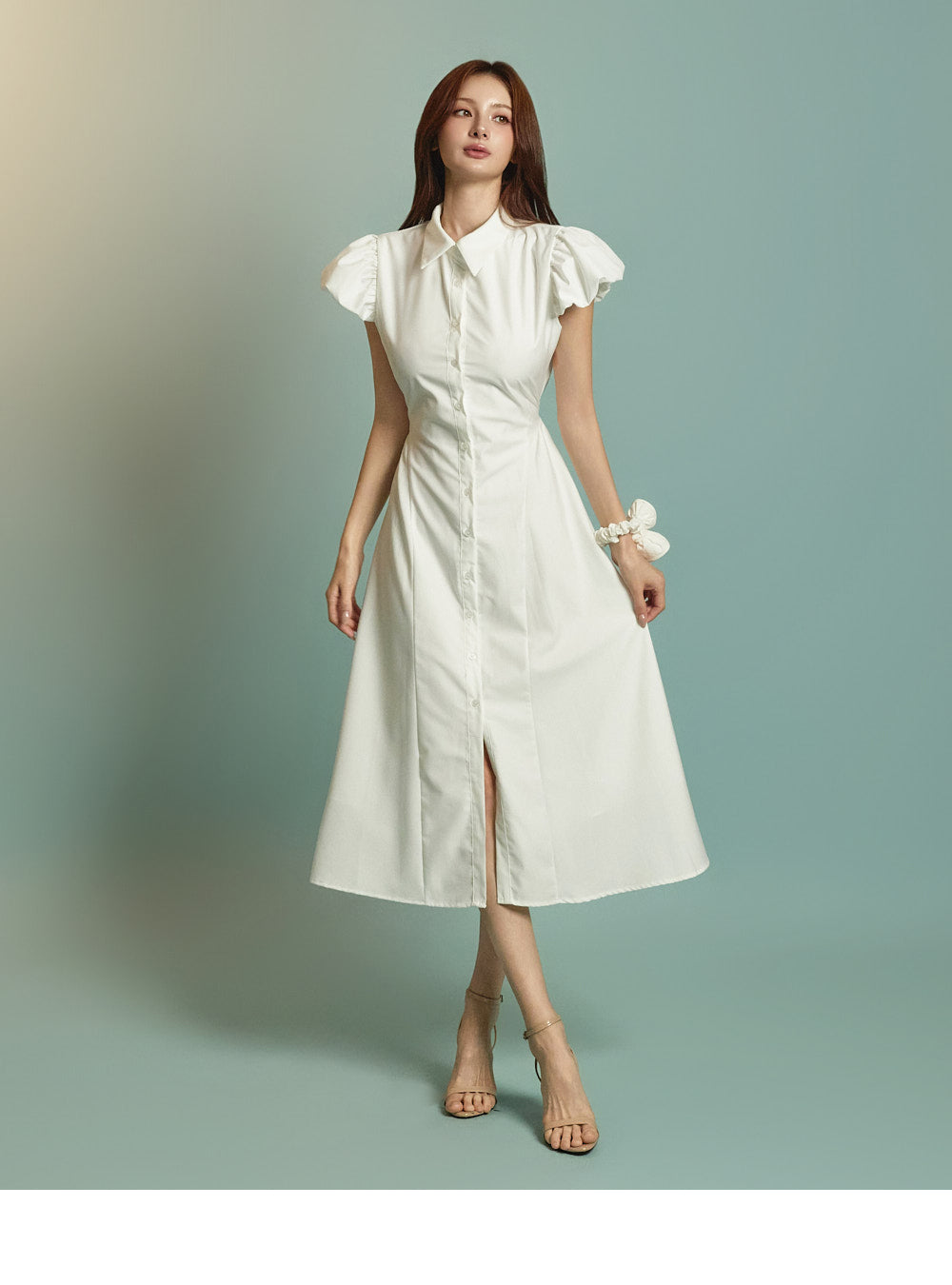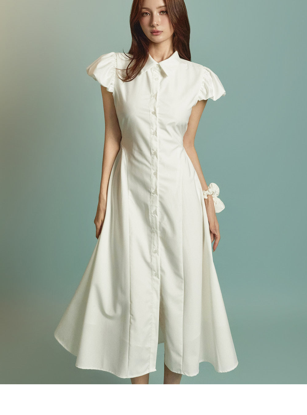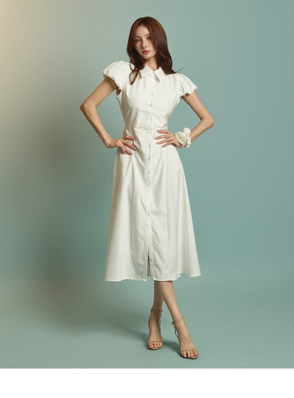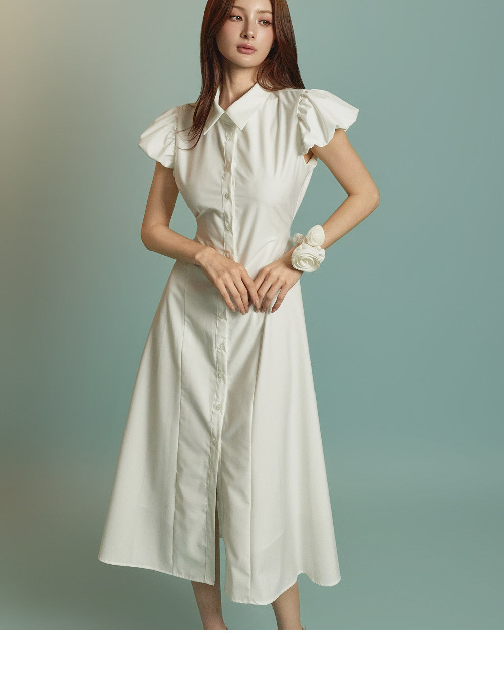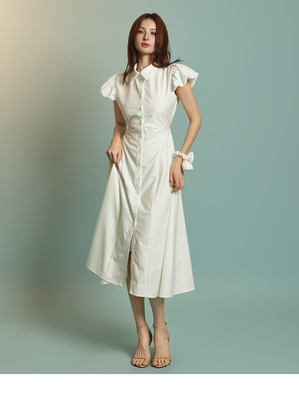 ミディ丈とボリュームのあるパフスリーブの組み合わせ