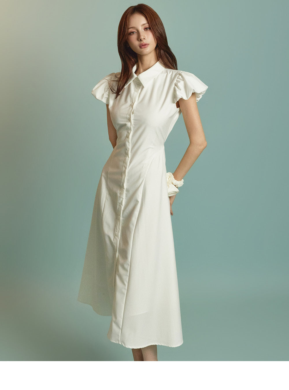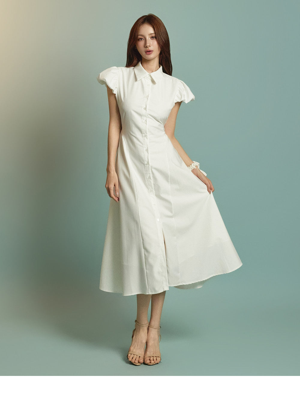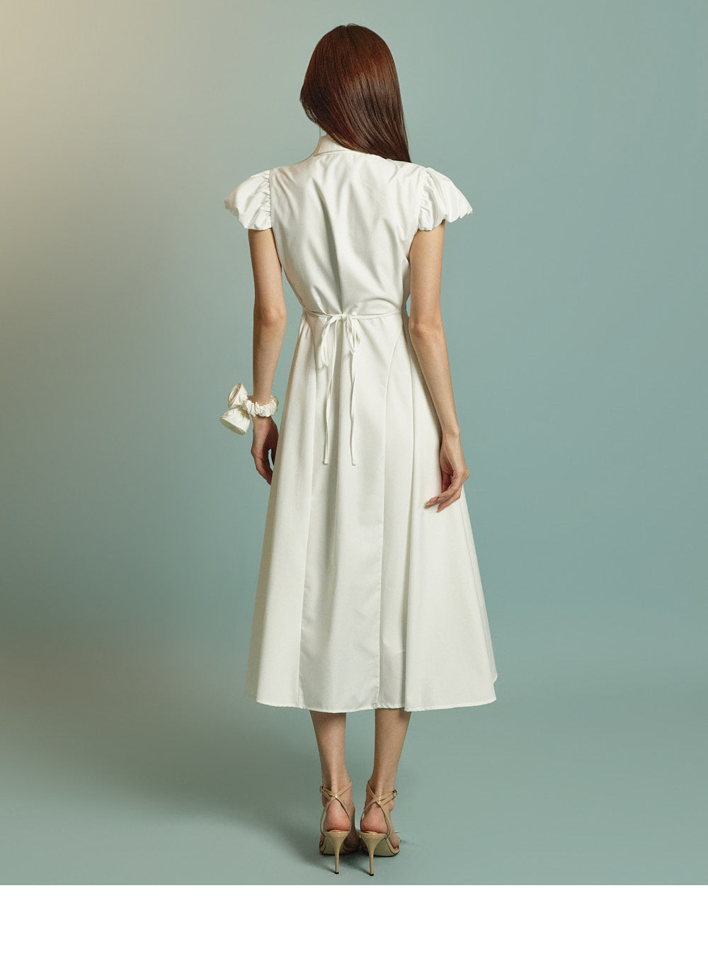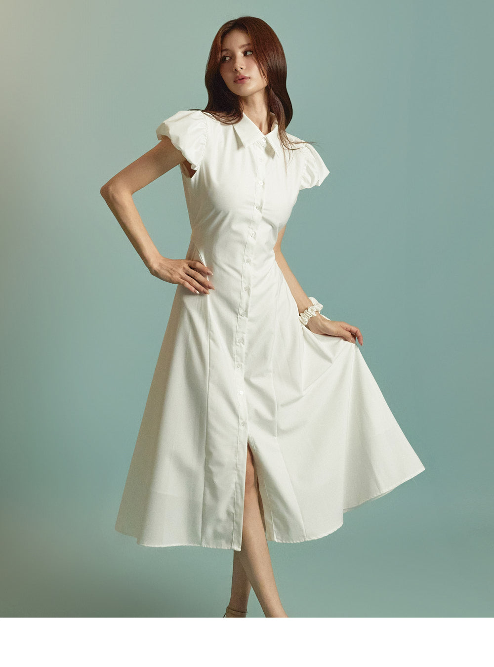 ミディ丈とボリュームのあるパフスリーブの組み合わせ