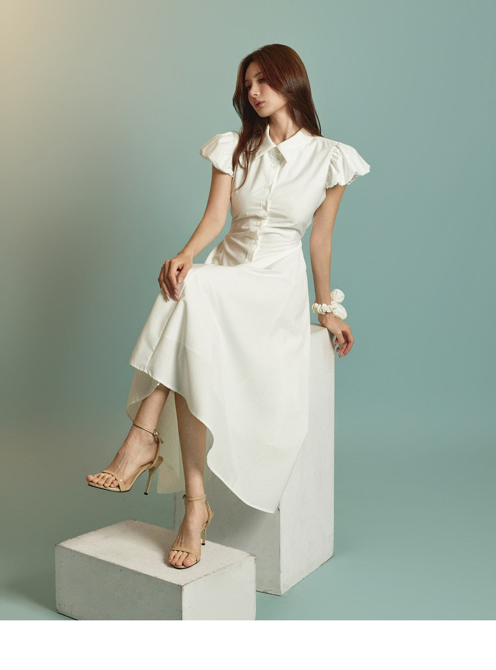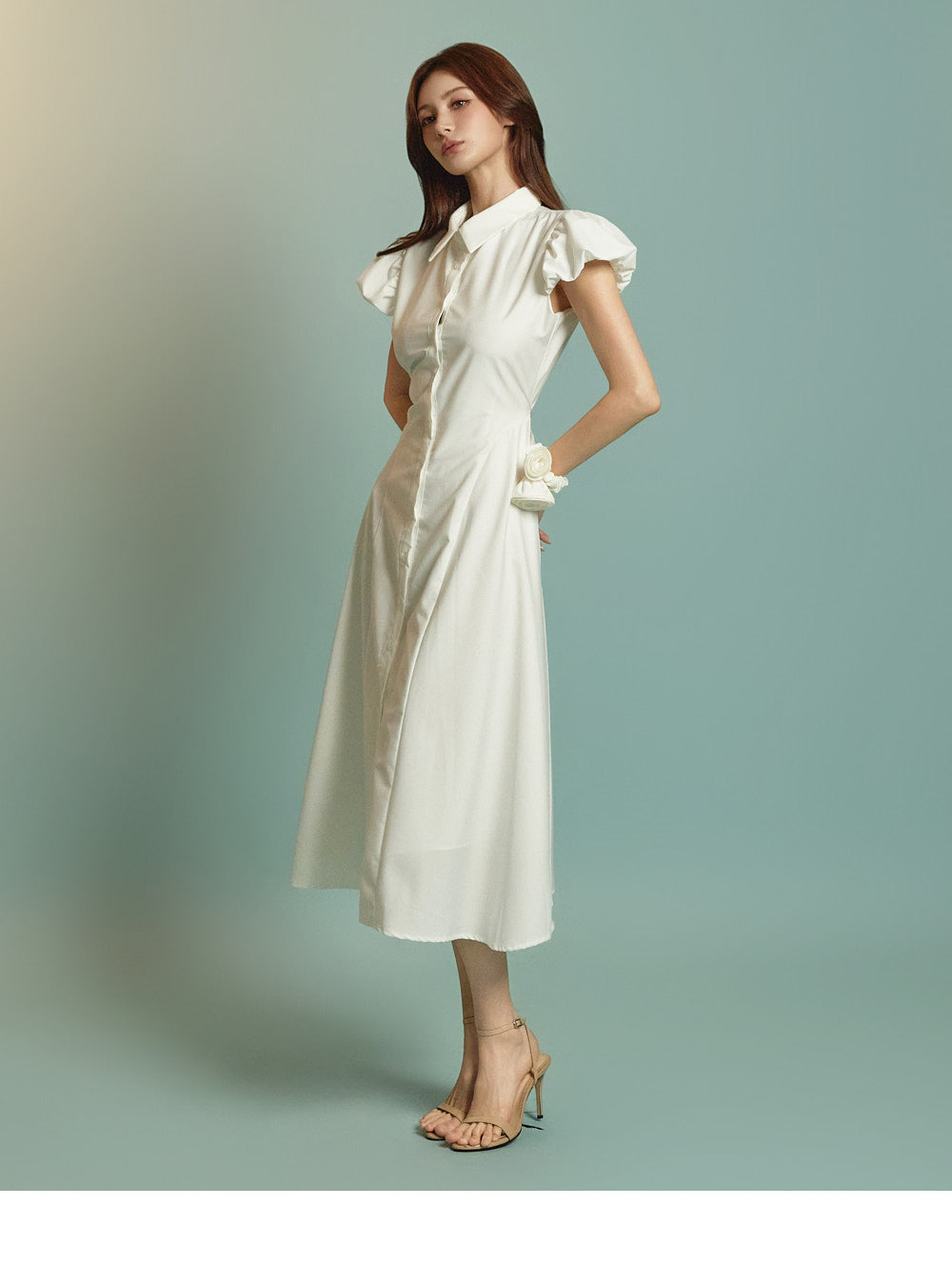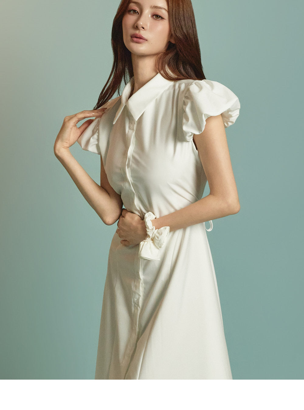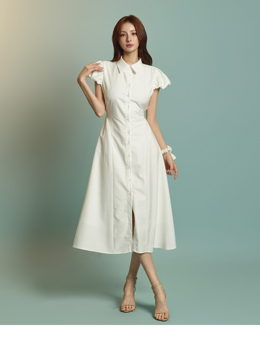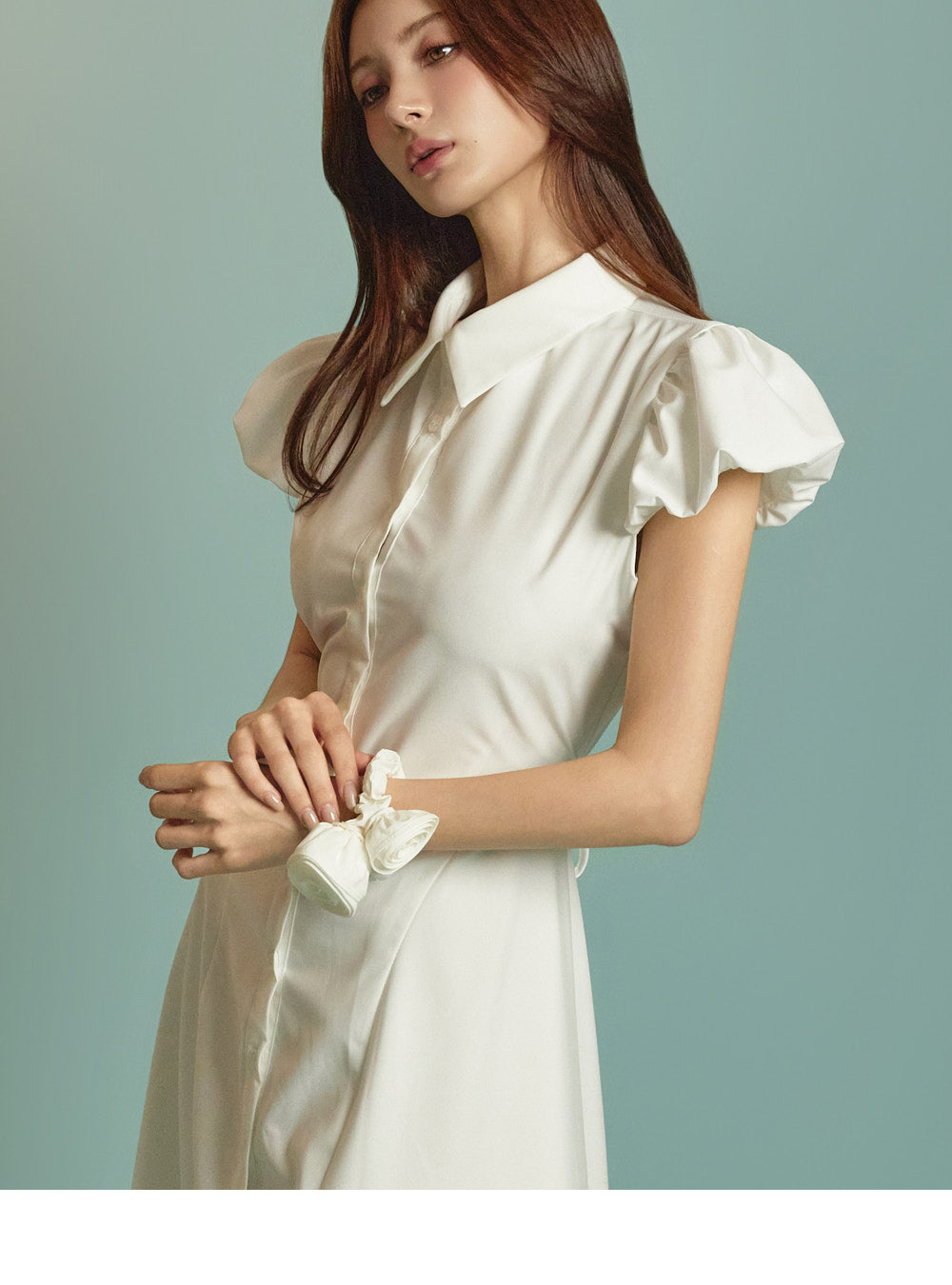 ミディ丈とボリュームのあるパフスリーブの組み合わせ