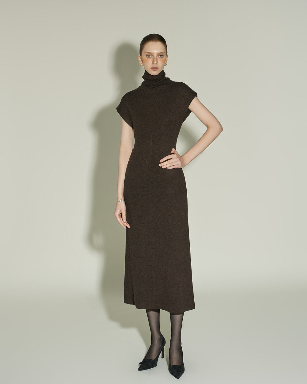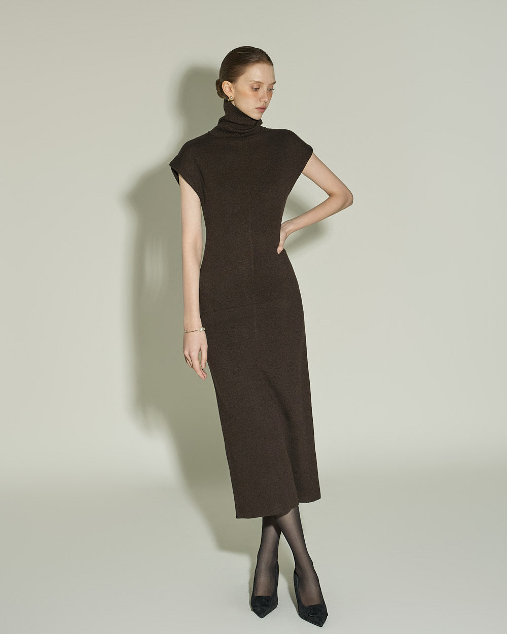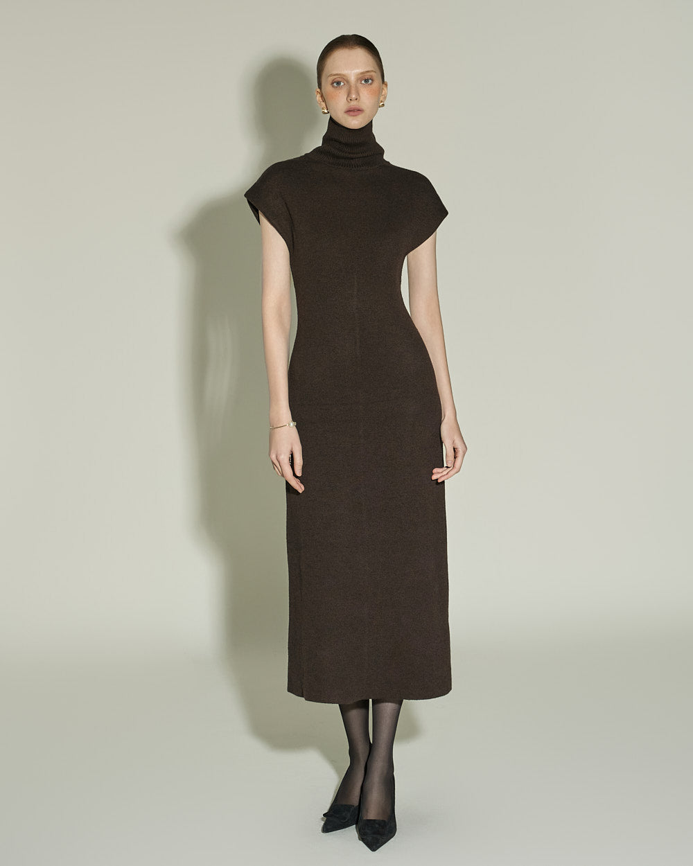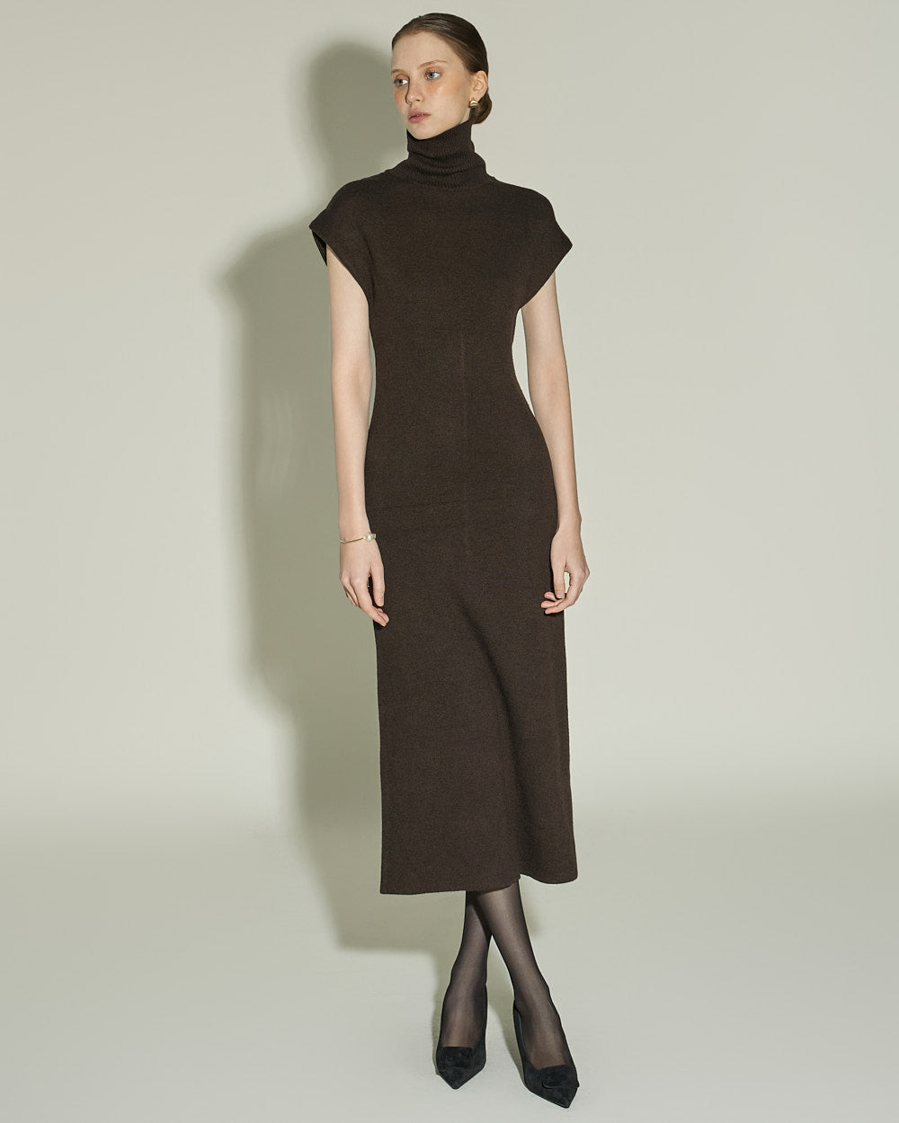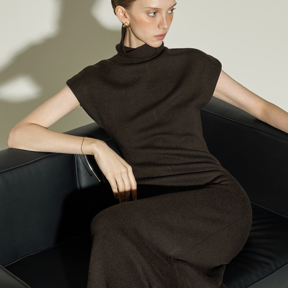 This high neck wool knit dress exudes a modern vibe.
