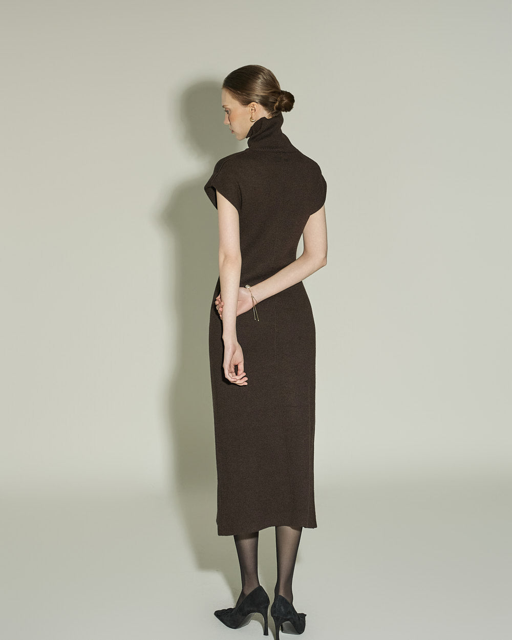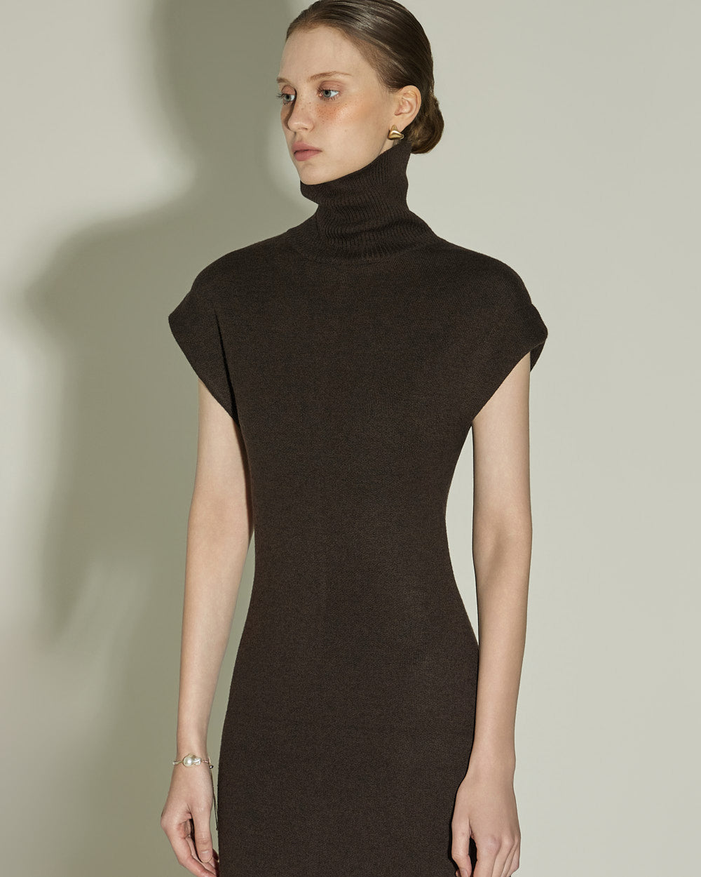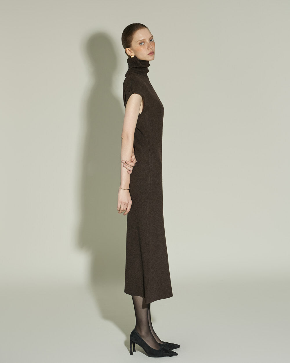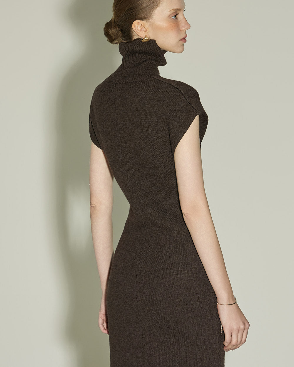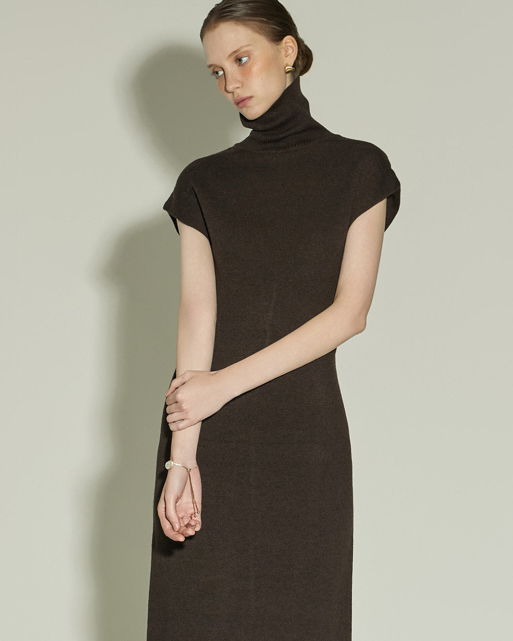 This high neck wool knit dress exudes a modern vibe.