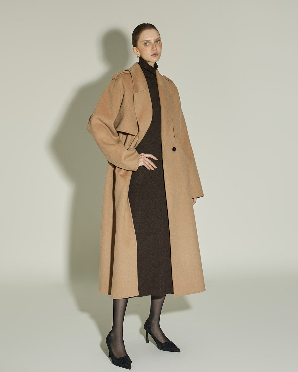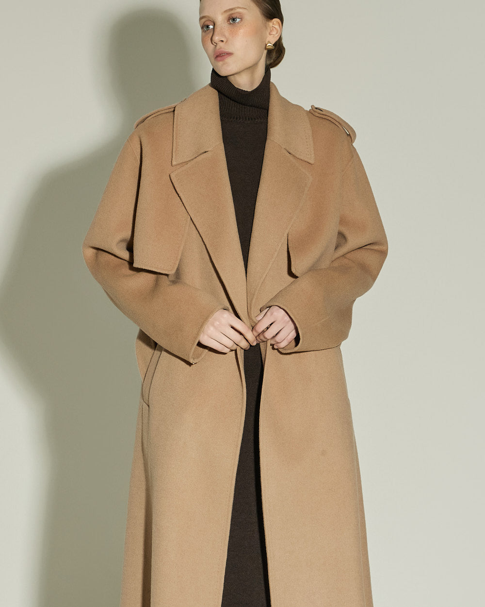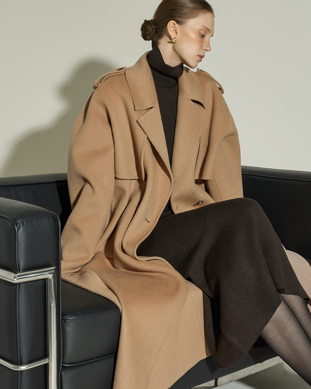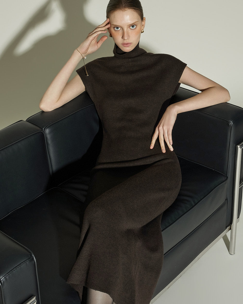 The 174cm model is wearing size ONE in DARK BROWN.