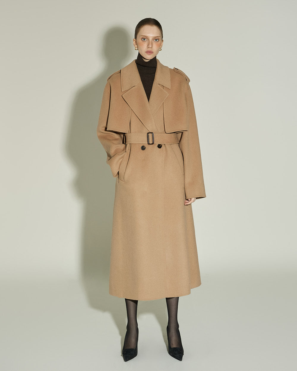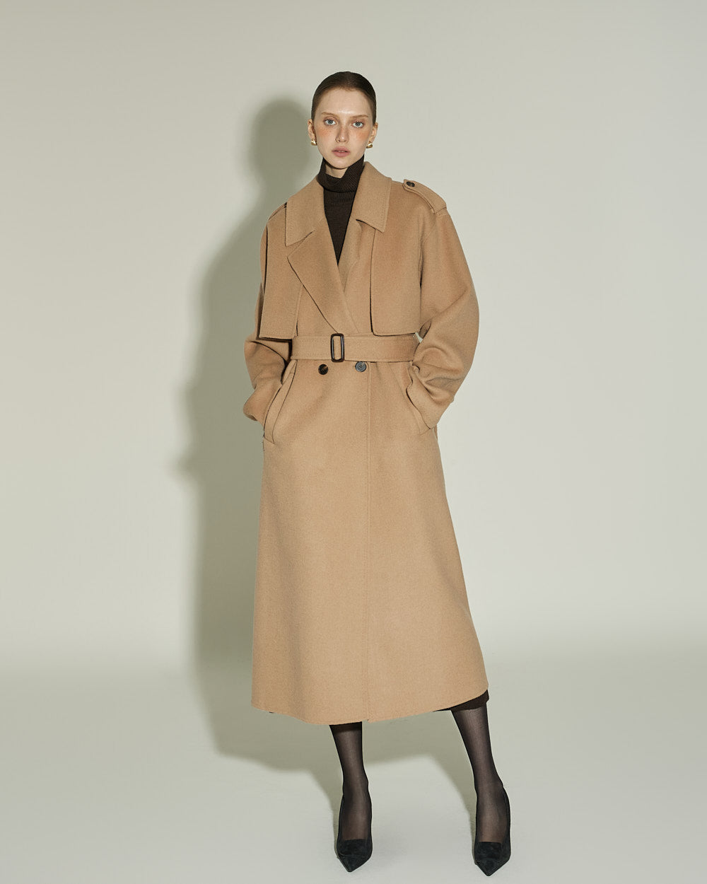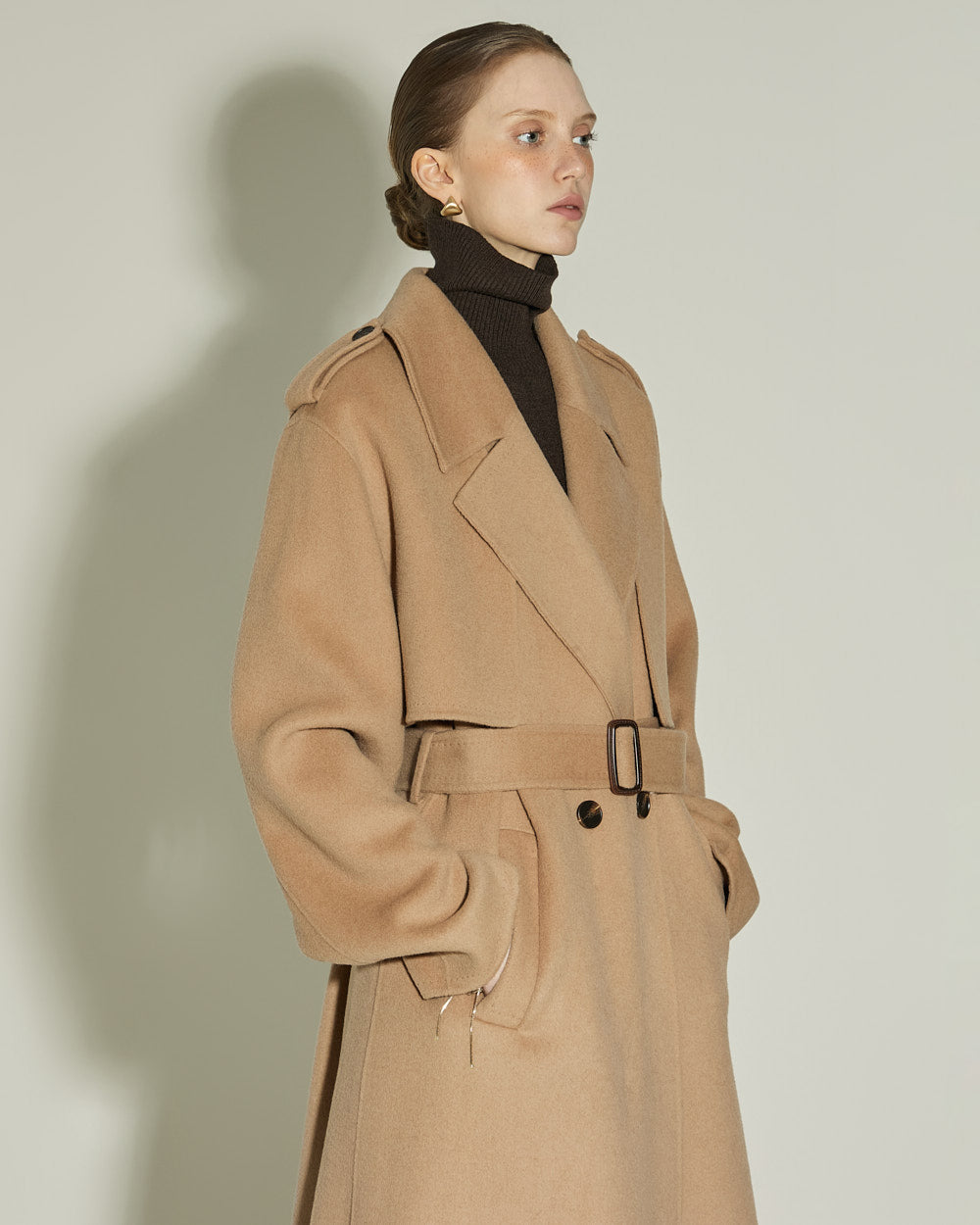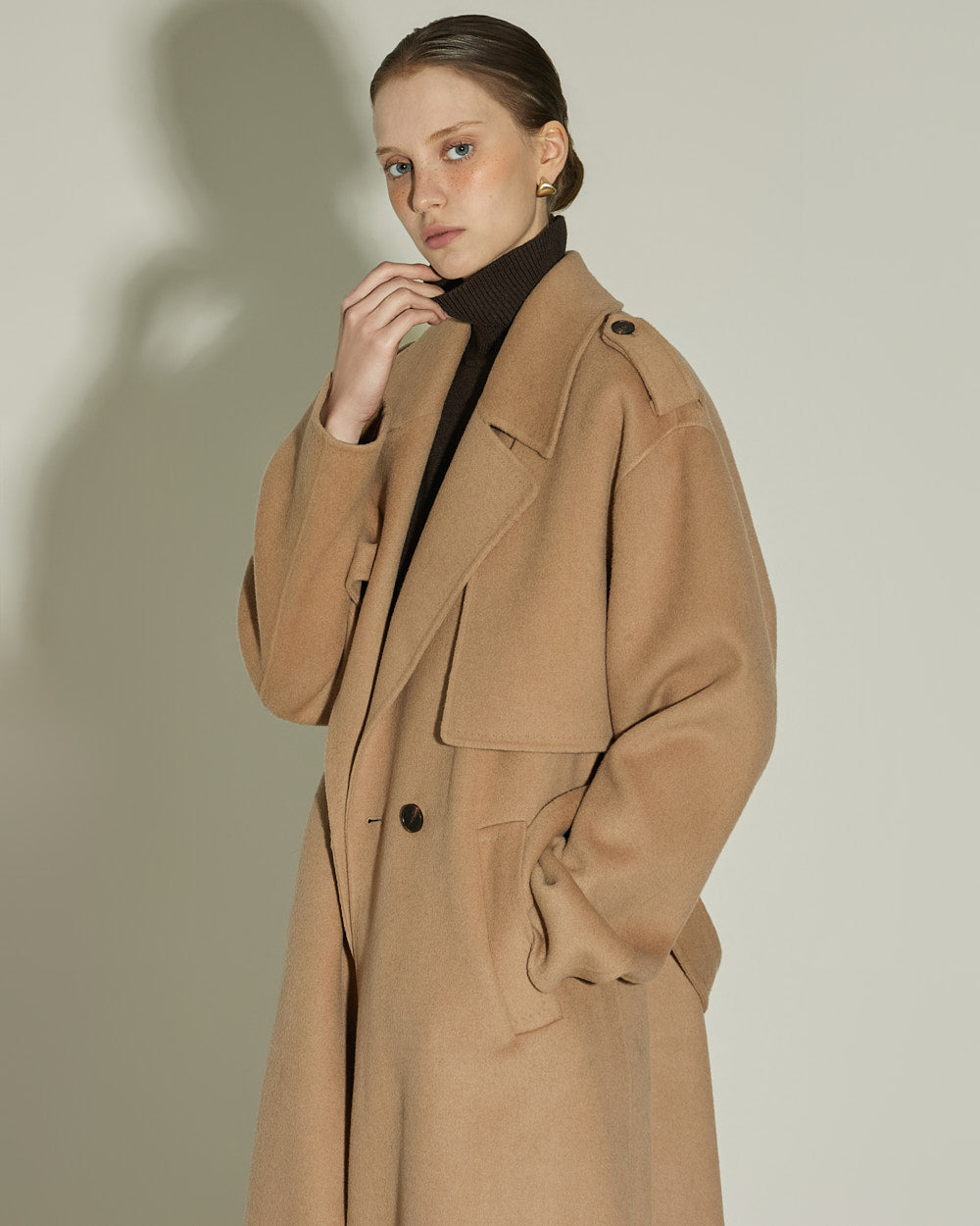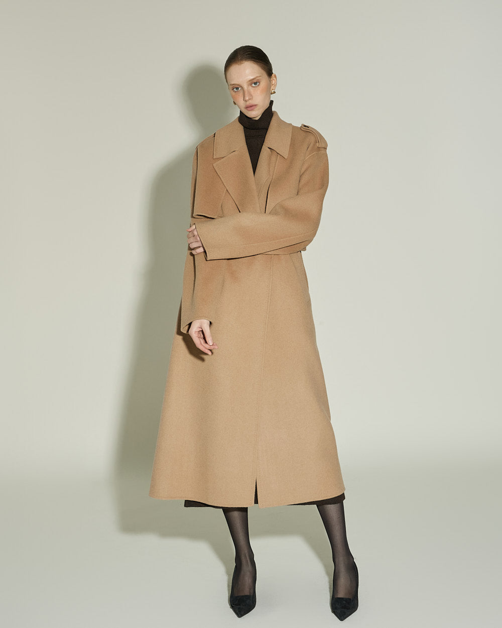 The 174cm model is wearing size ONE in DARK BROWN.