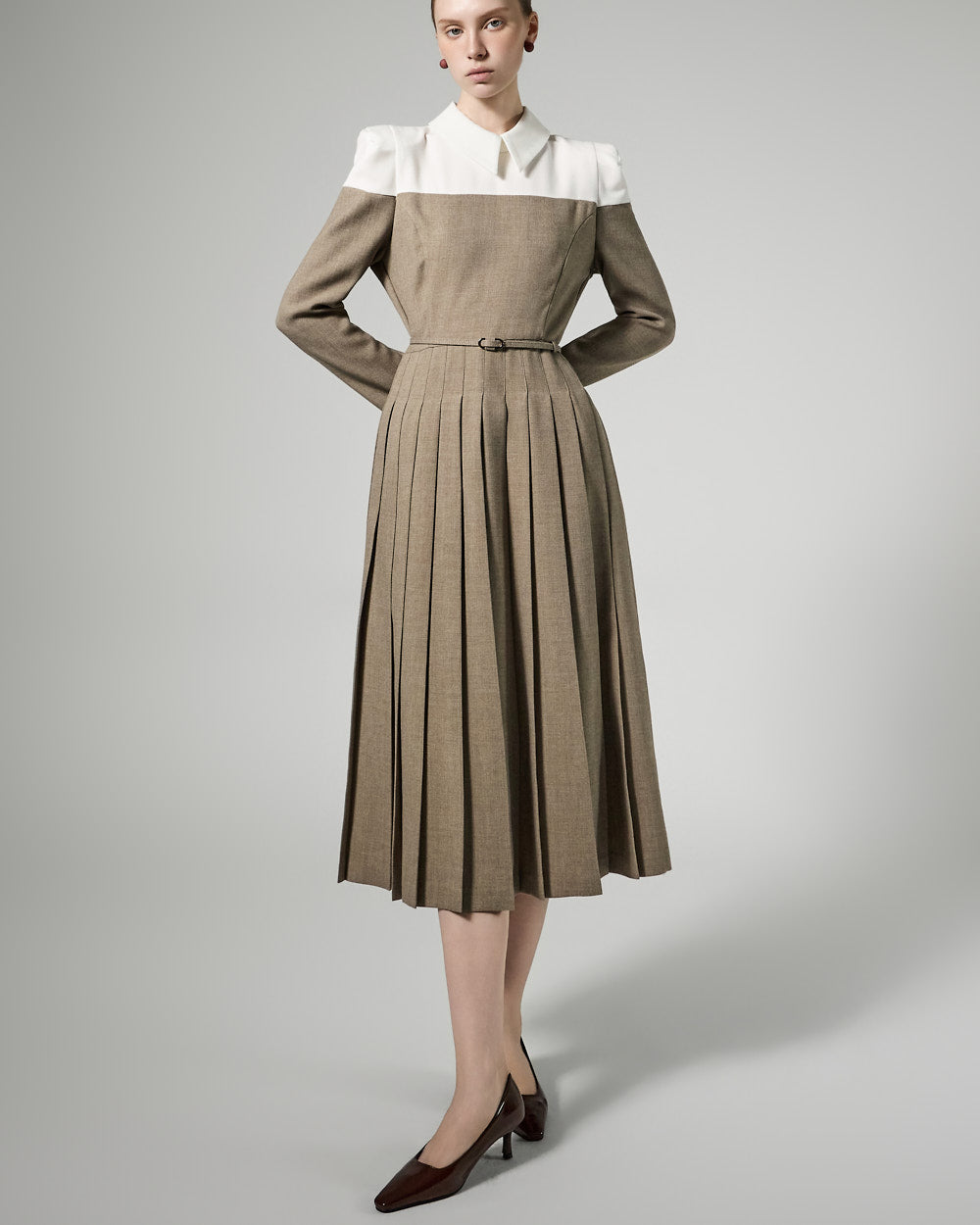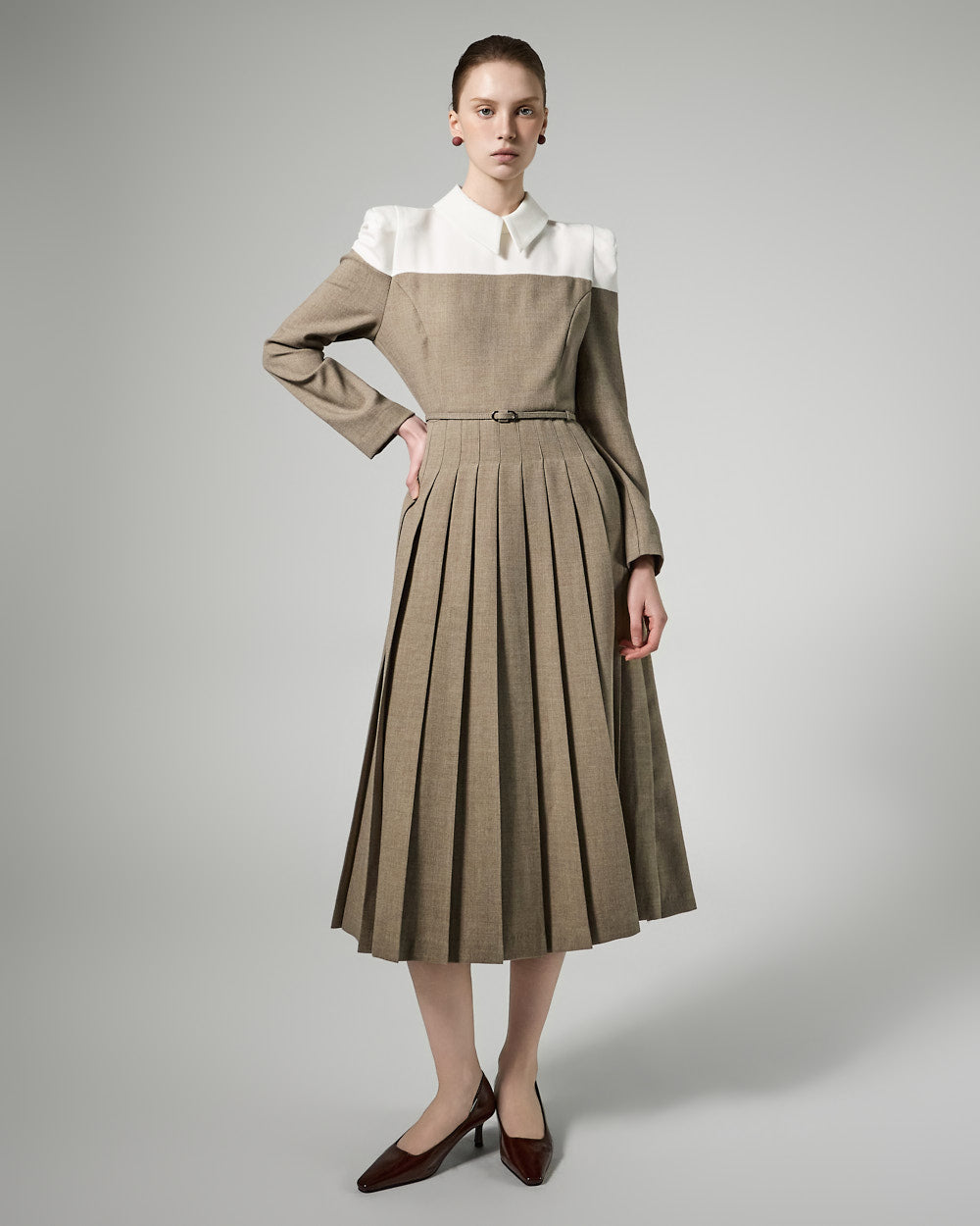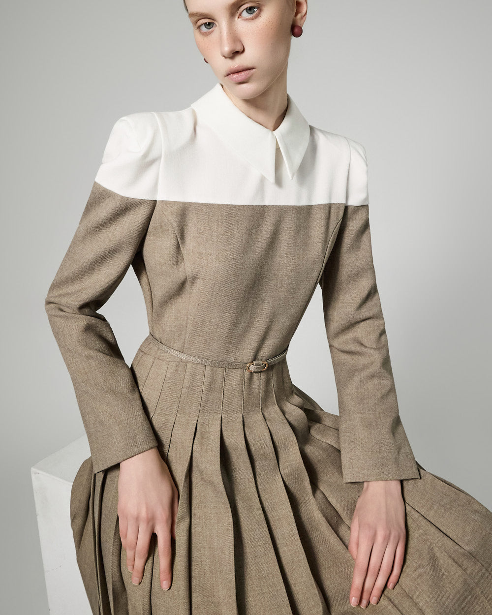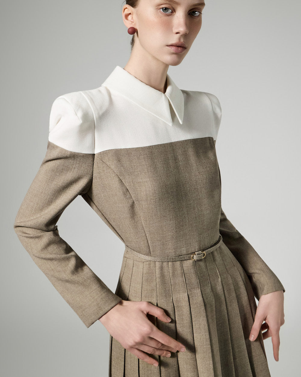 This two-tone dress with a belt set exudes a feminine and modern vibe.