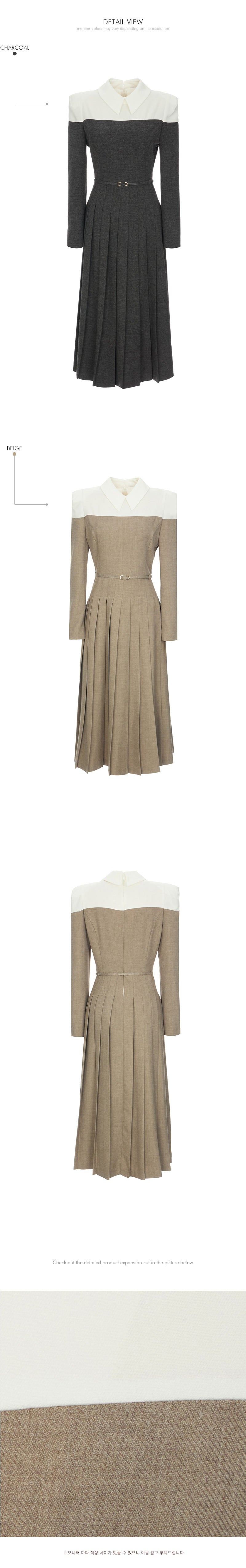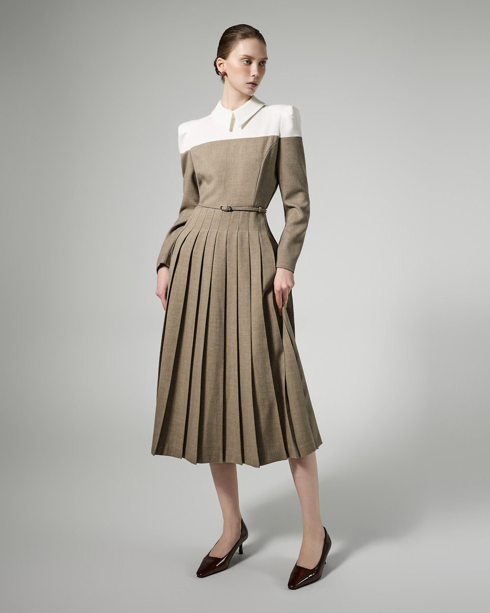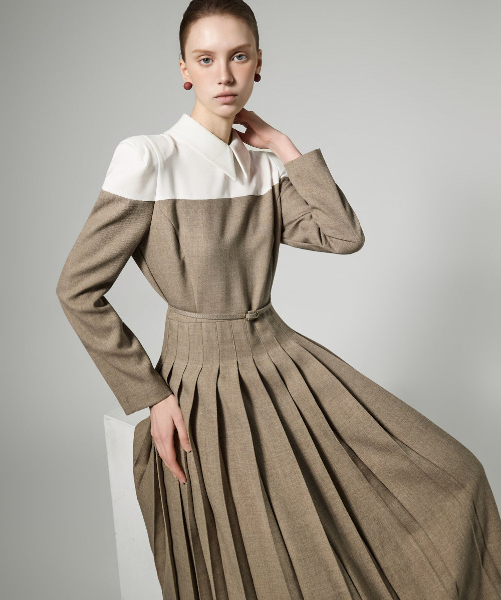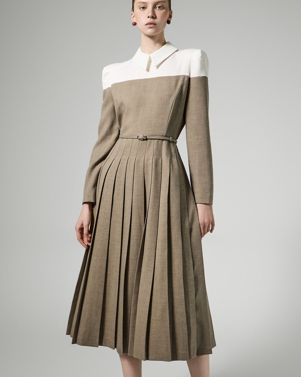 This two-tone dress with a belt set exudes a feminine and modern vibe.
