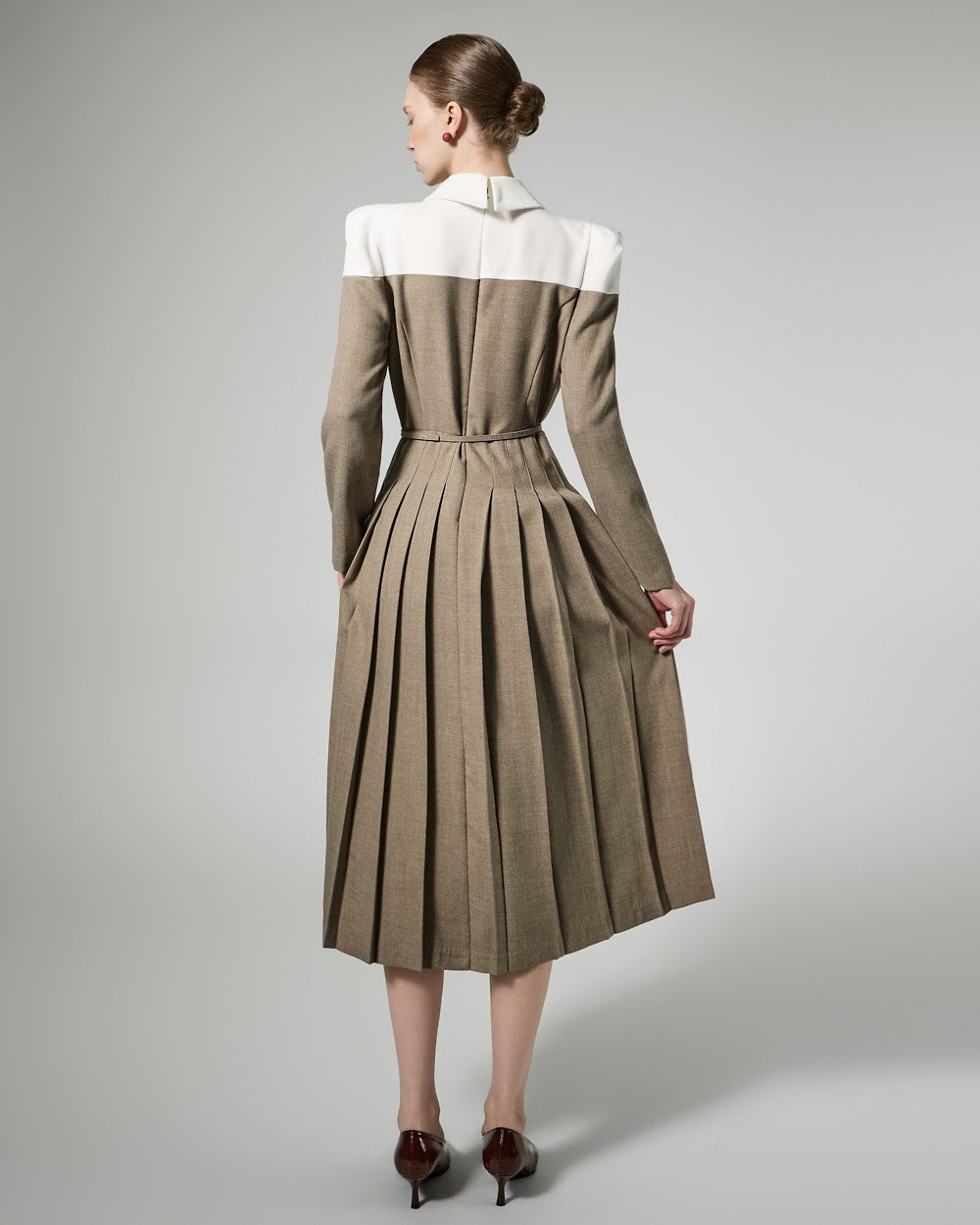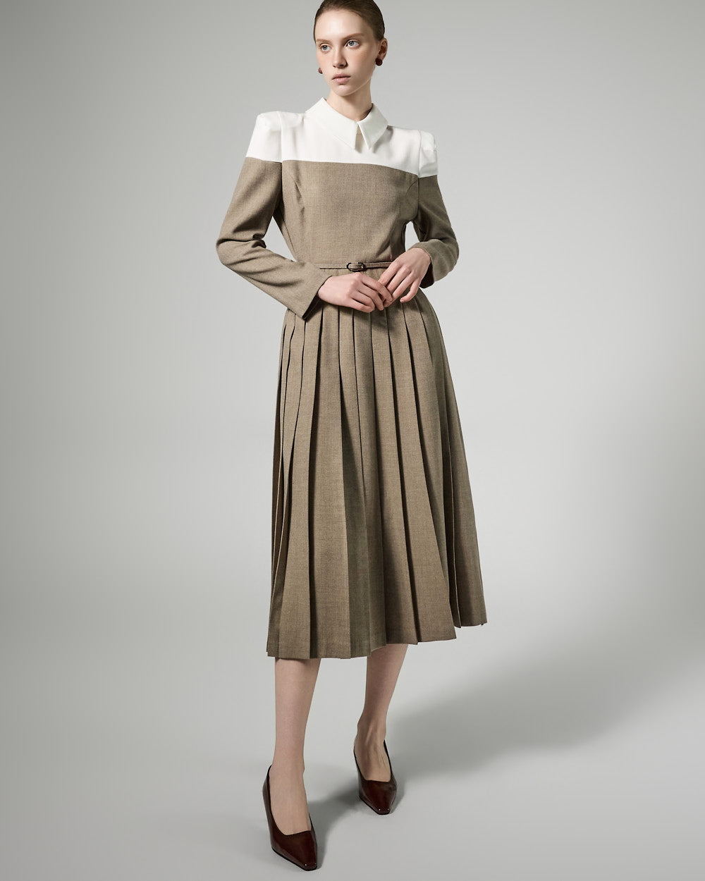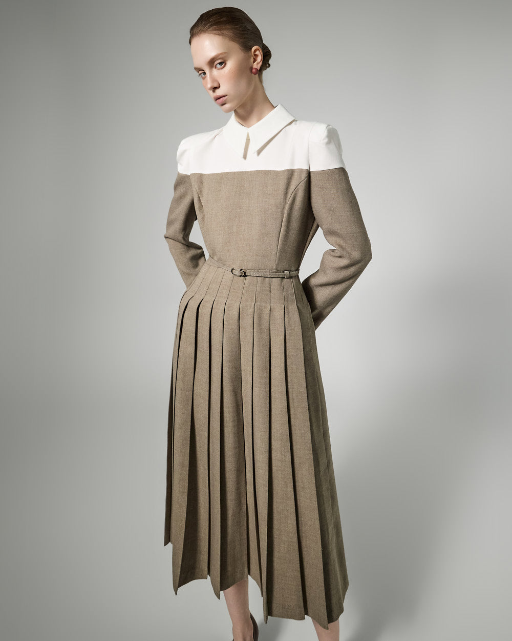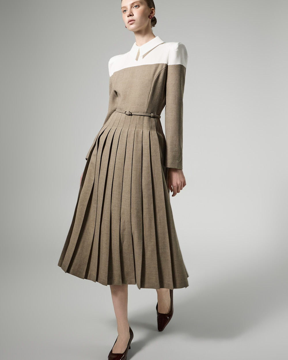 This two-tone dress with a belt set exudes a feminine and modern vibe.
