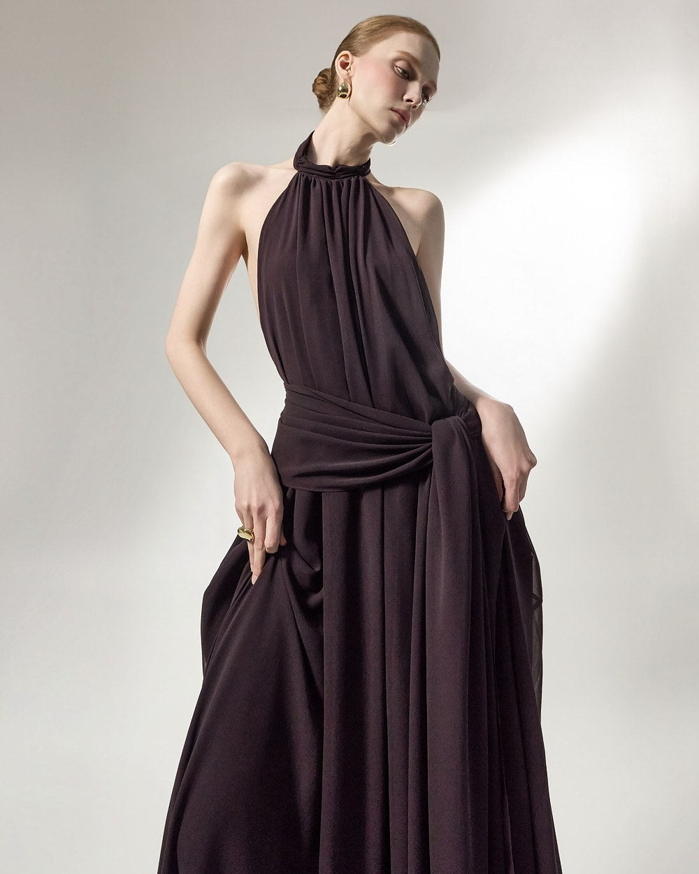 The halter neck design emphasizes a feminine neckline,