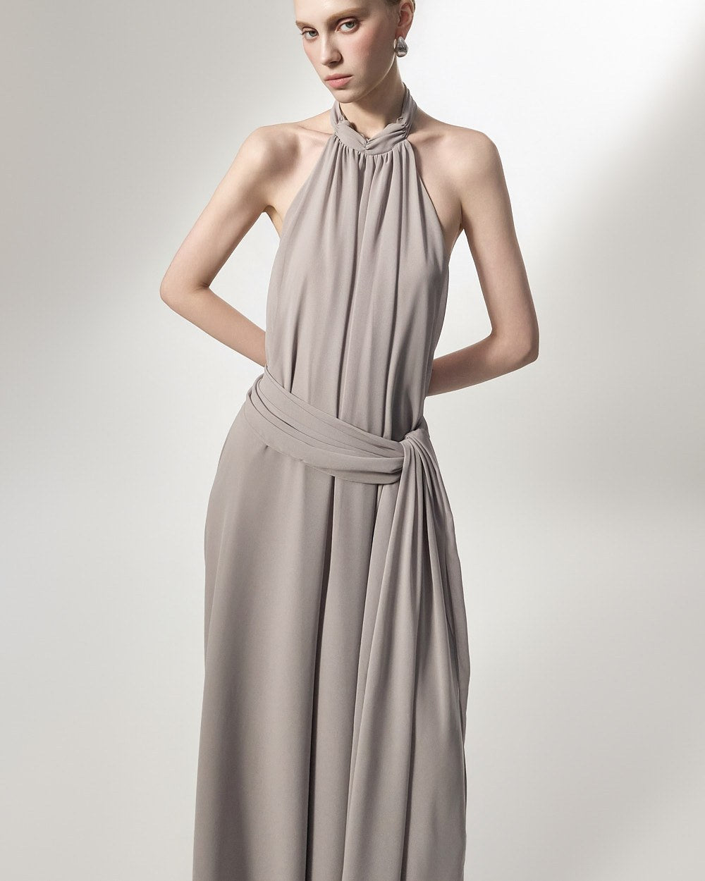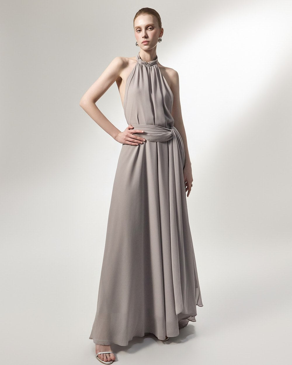 The halter neck design emphasizes a feminine neckline,