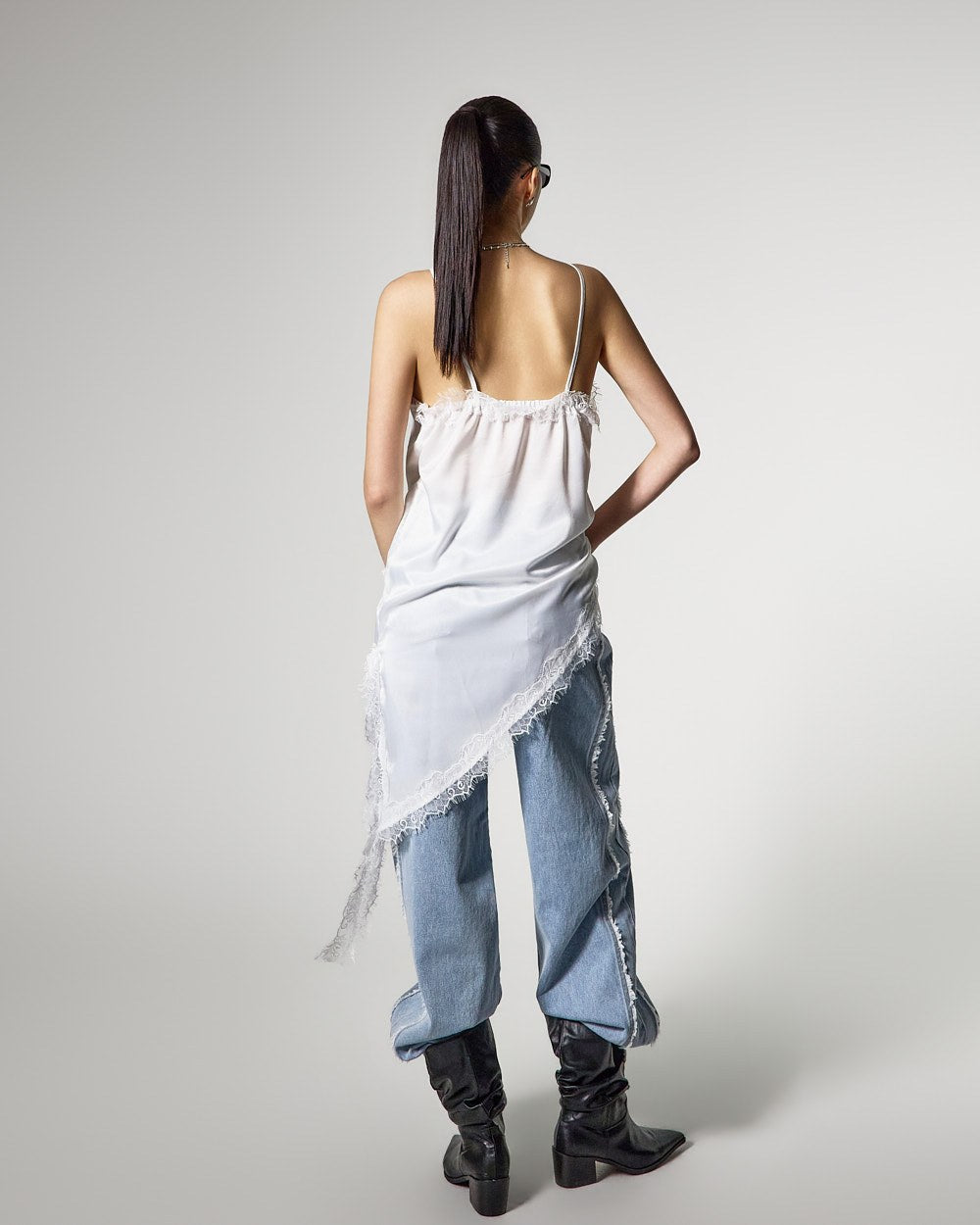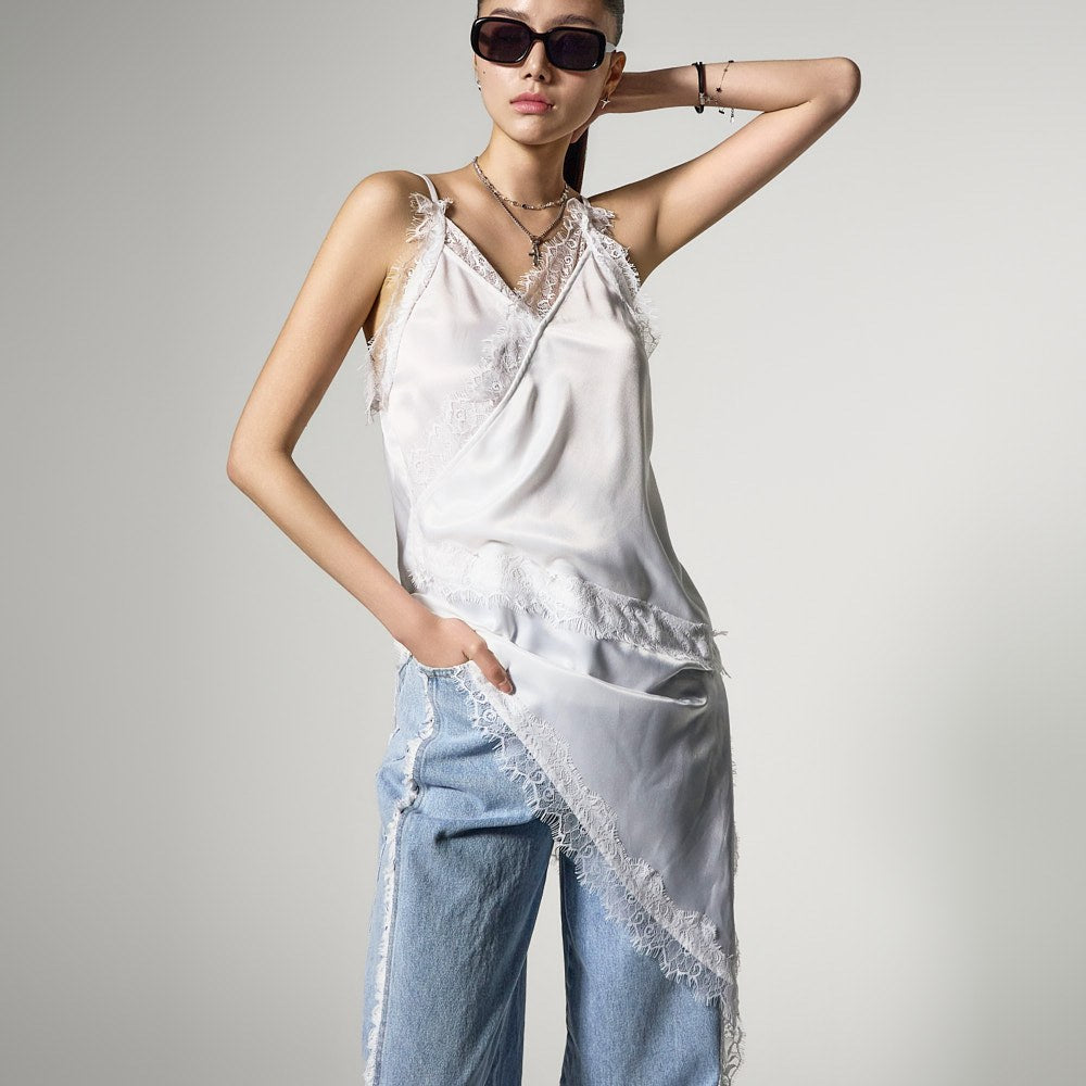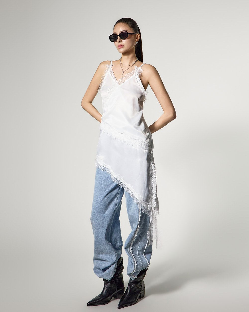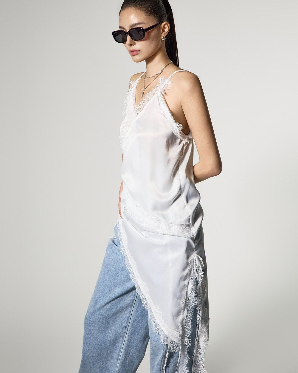 アシンメトリーなヘムラインで、スタイリッシュでおしゃれなシルエットを完成させます。