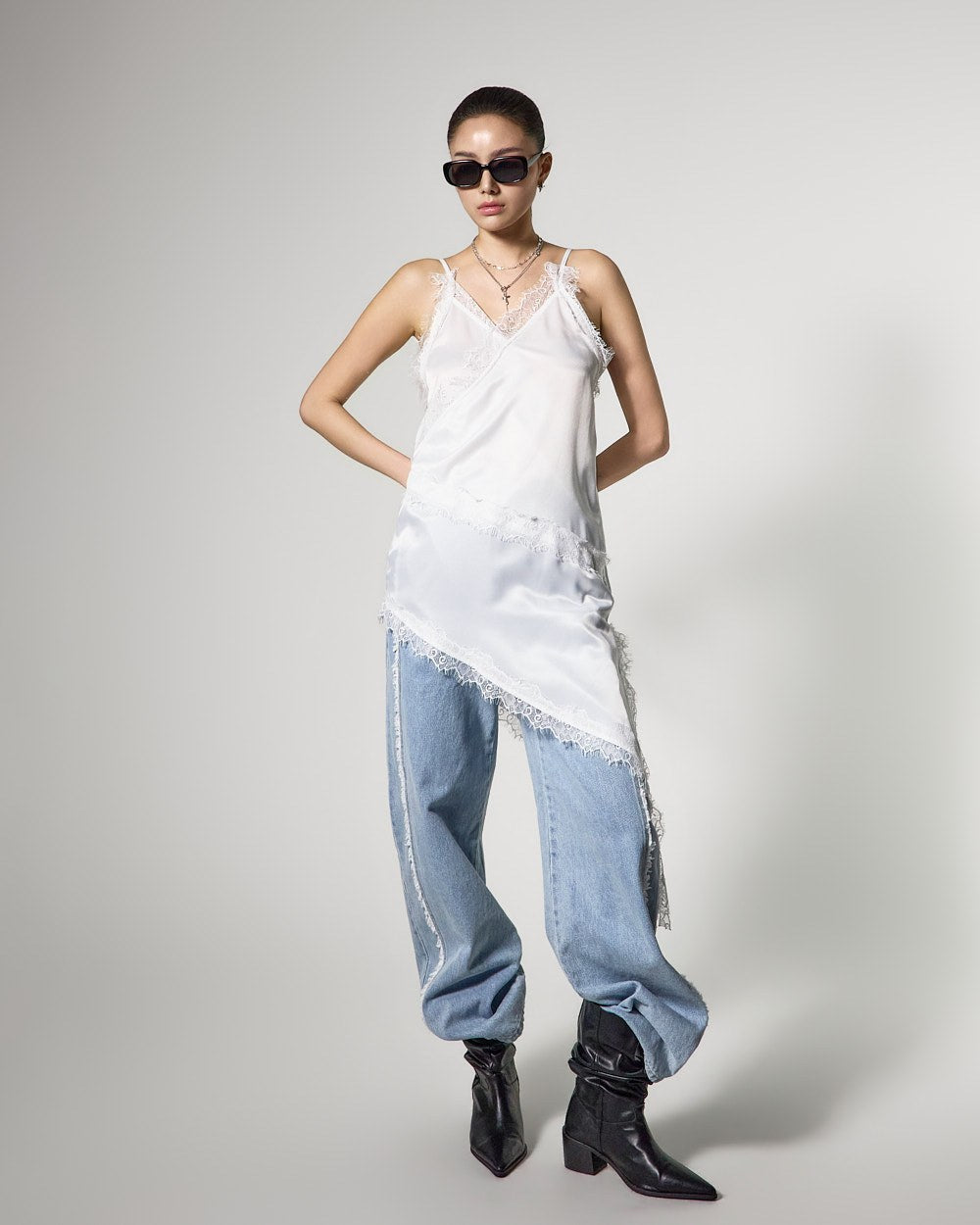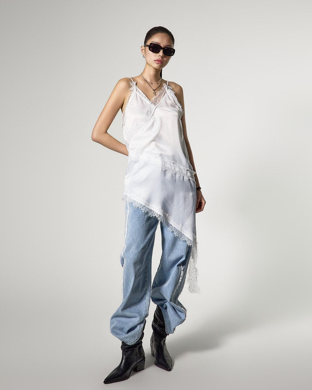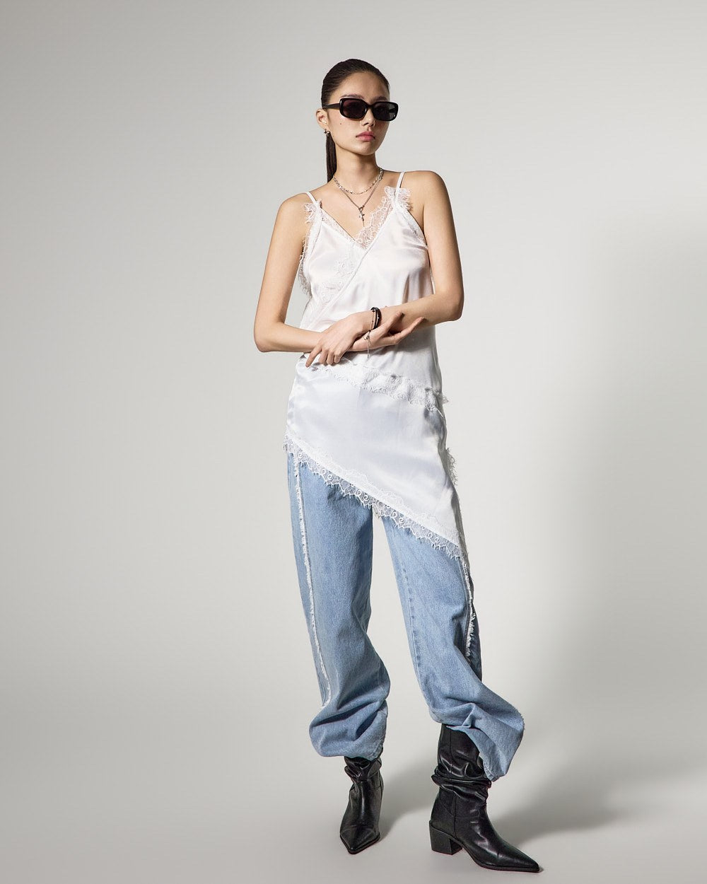 アシンメトリーなヘムラインで、スタイリッシュでおしゃれなシルエットを完成させます。