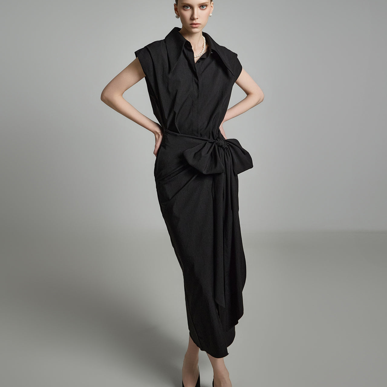 アシンメトリーな長さとノースリーブのシャツデザインが組み合わさって
