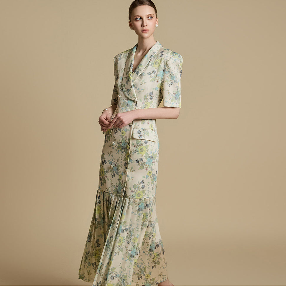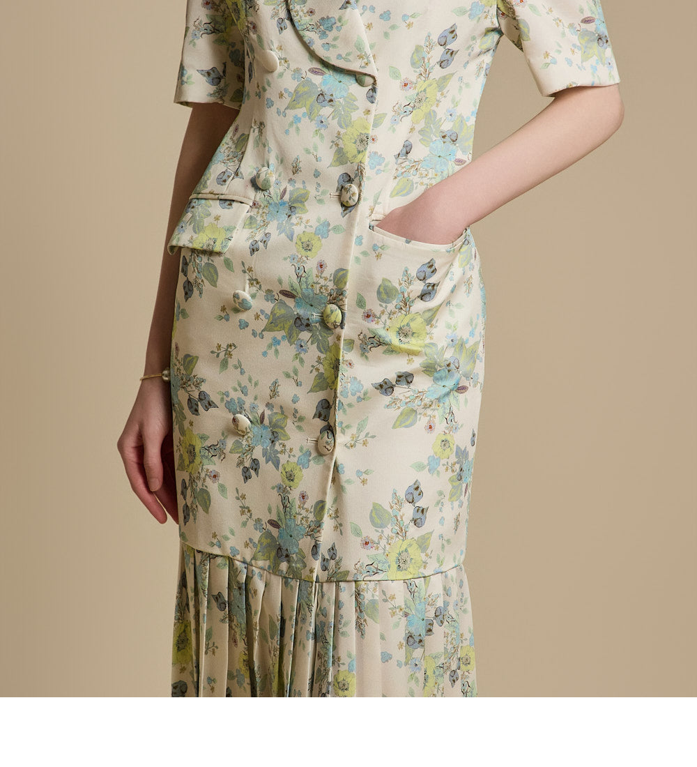 このエレガントな花柄プリーツドレスは、洗練されたスタイリッシュな印象を与えます。