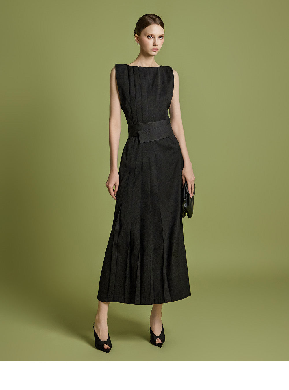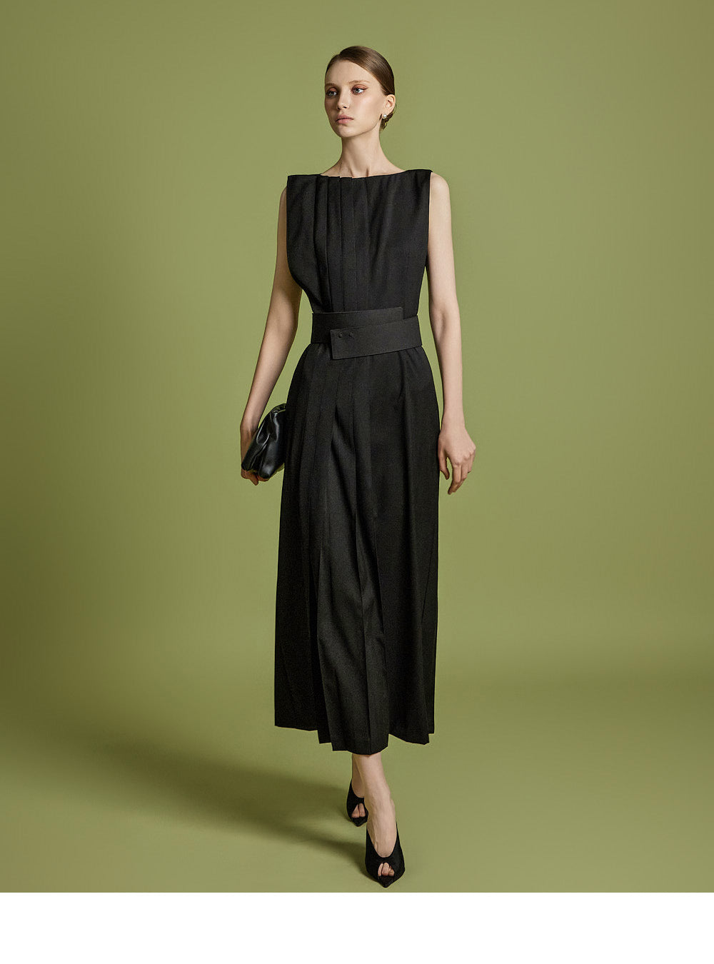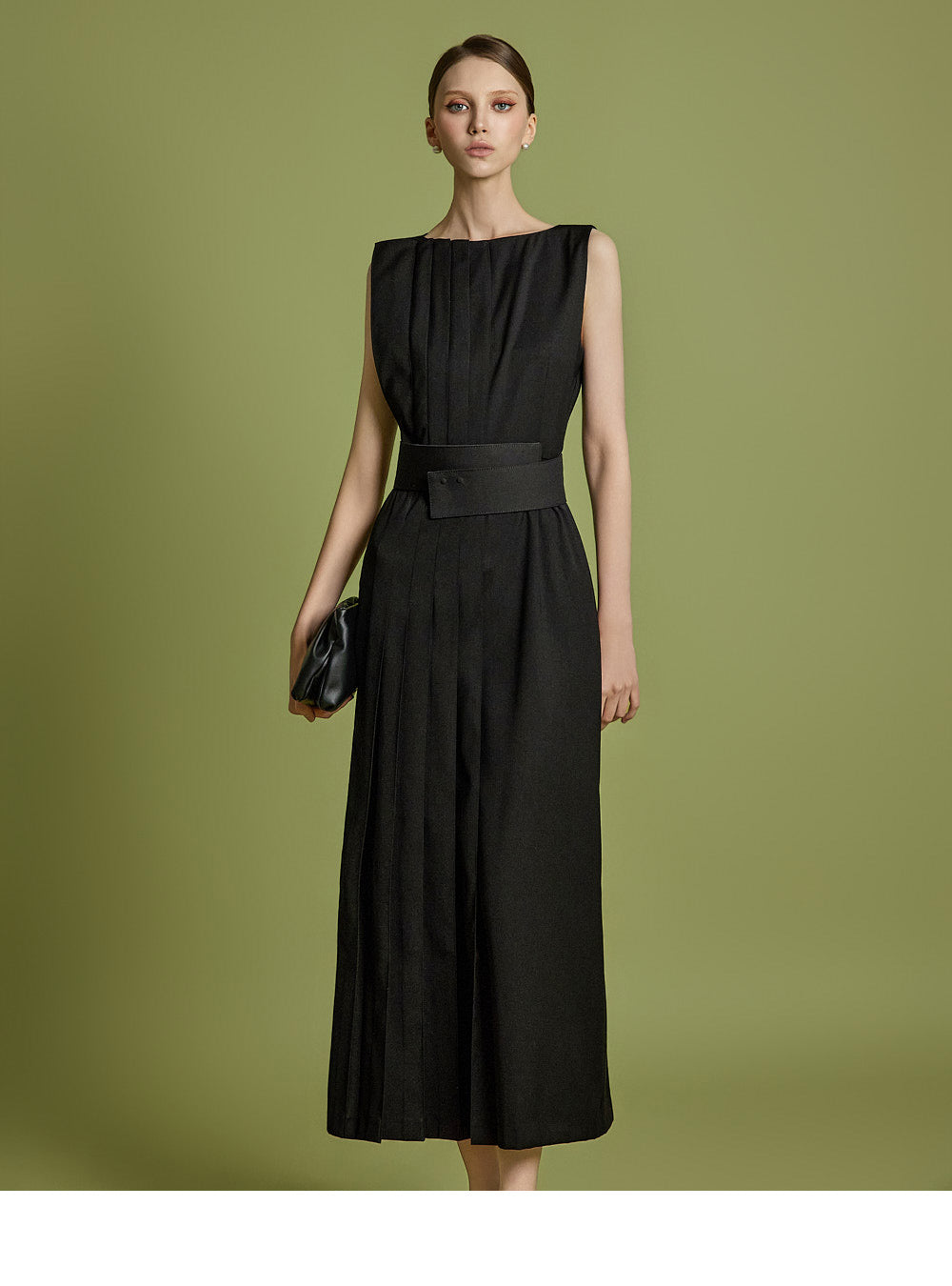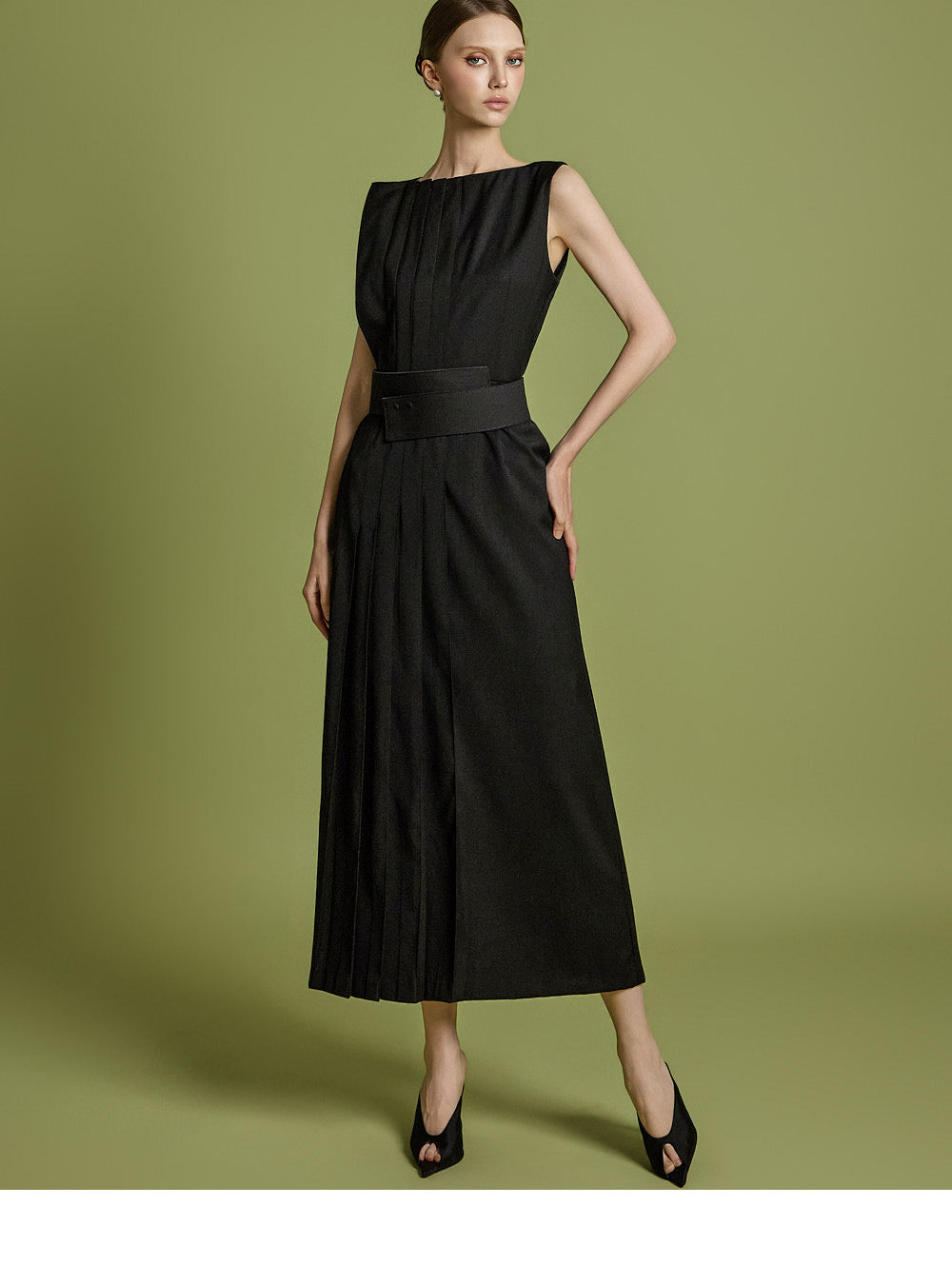 ベルトがセットされたプリーツワンピースは洗練された雰囲気。