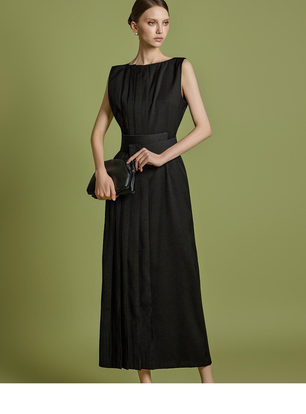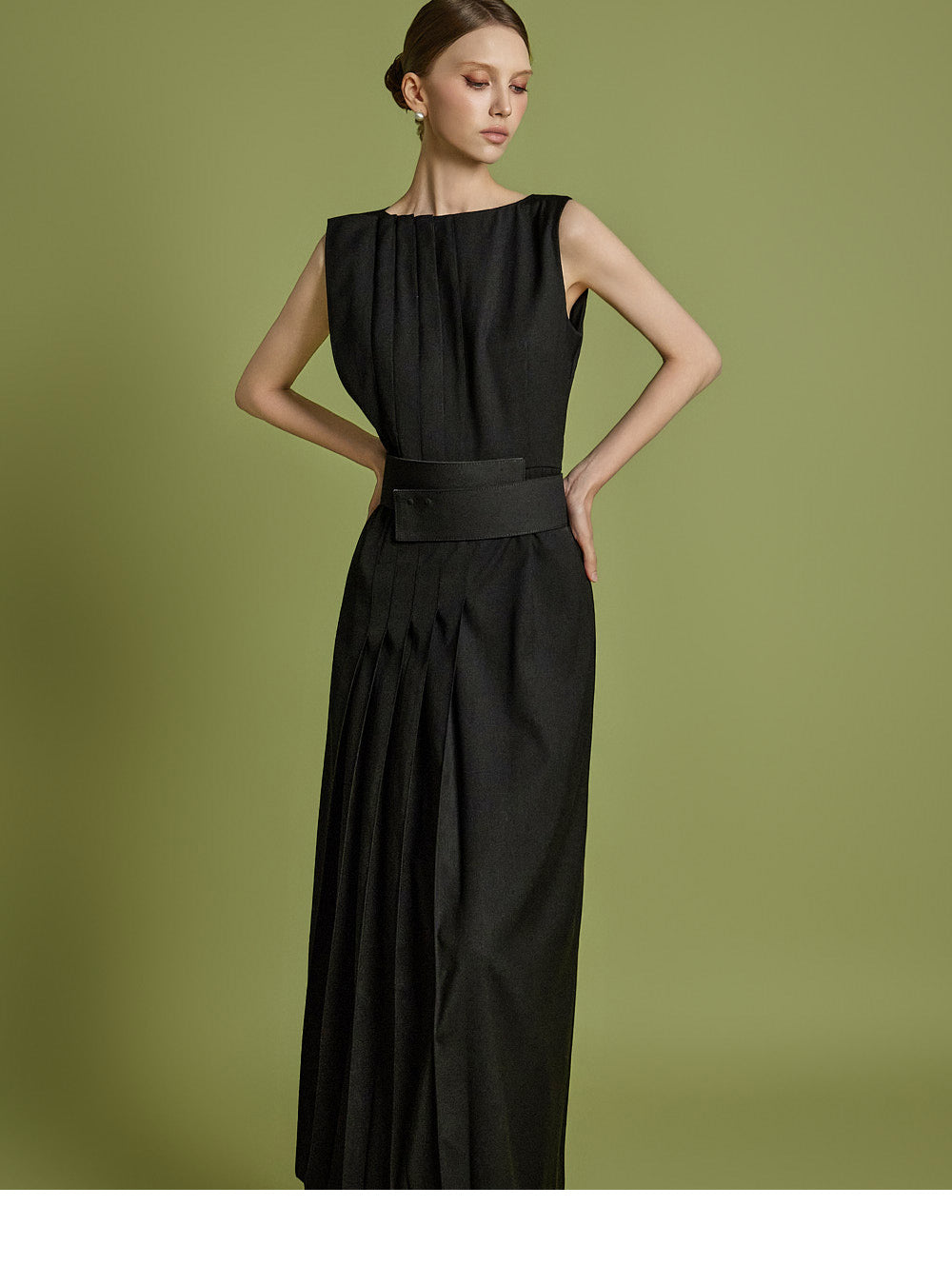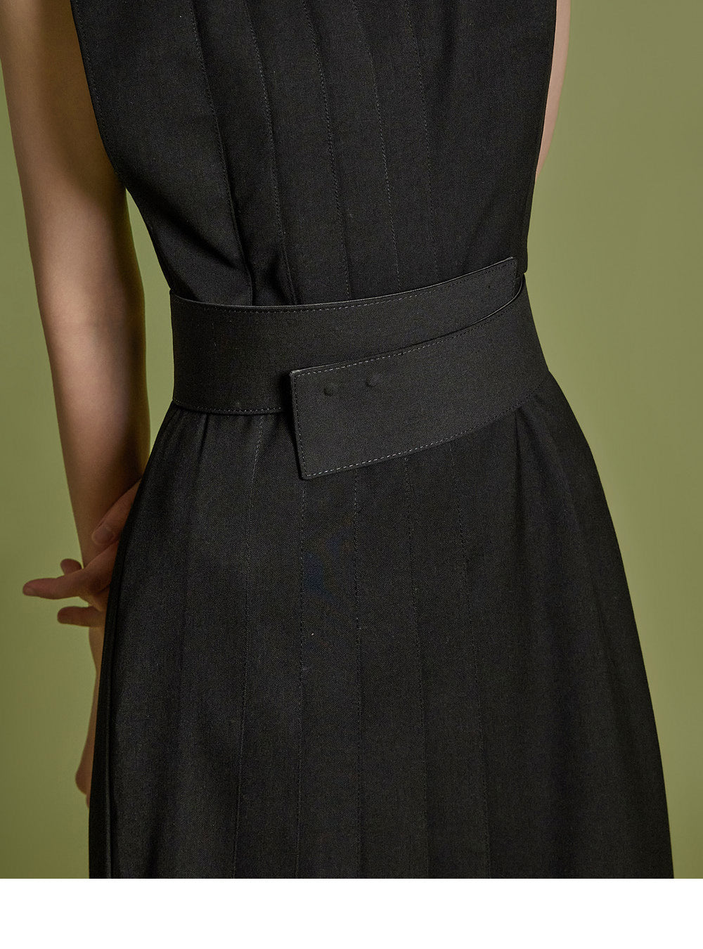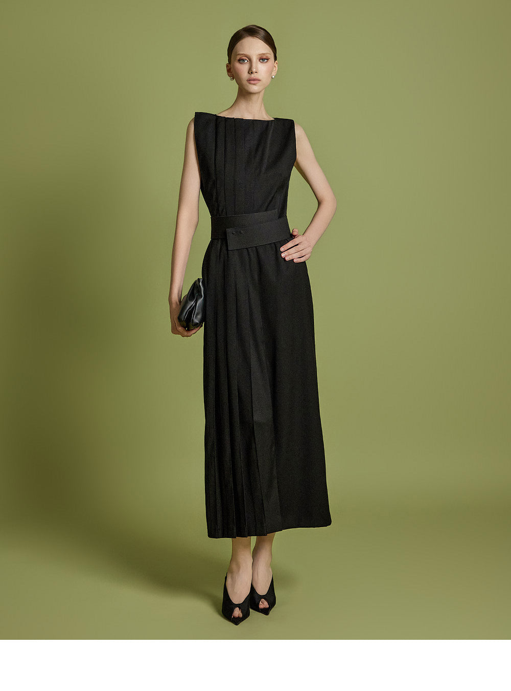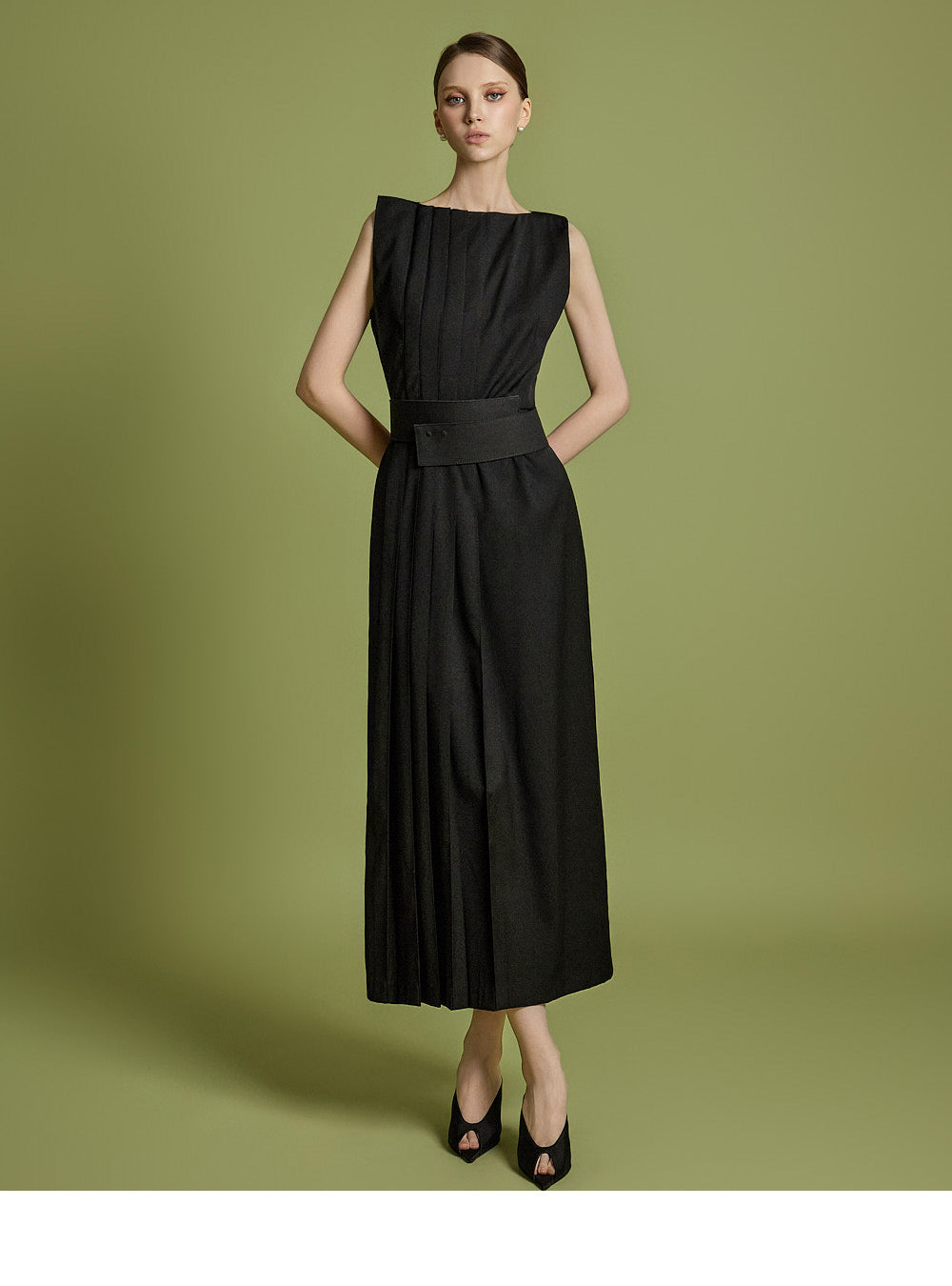 ベルトがセットされたプリーツワンピースは洗練された雰囲気。