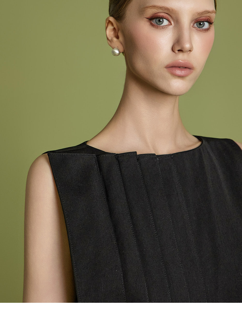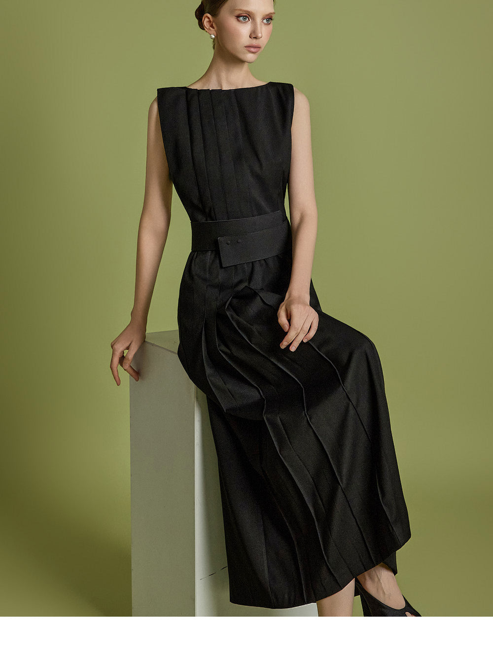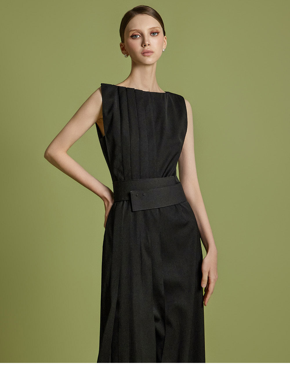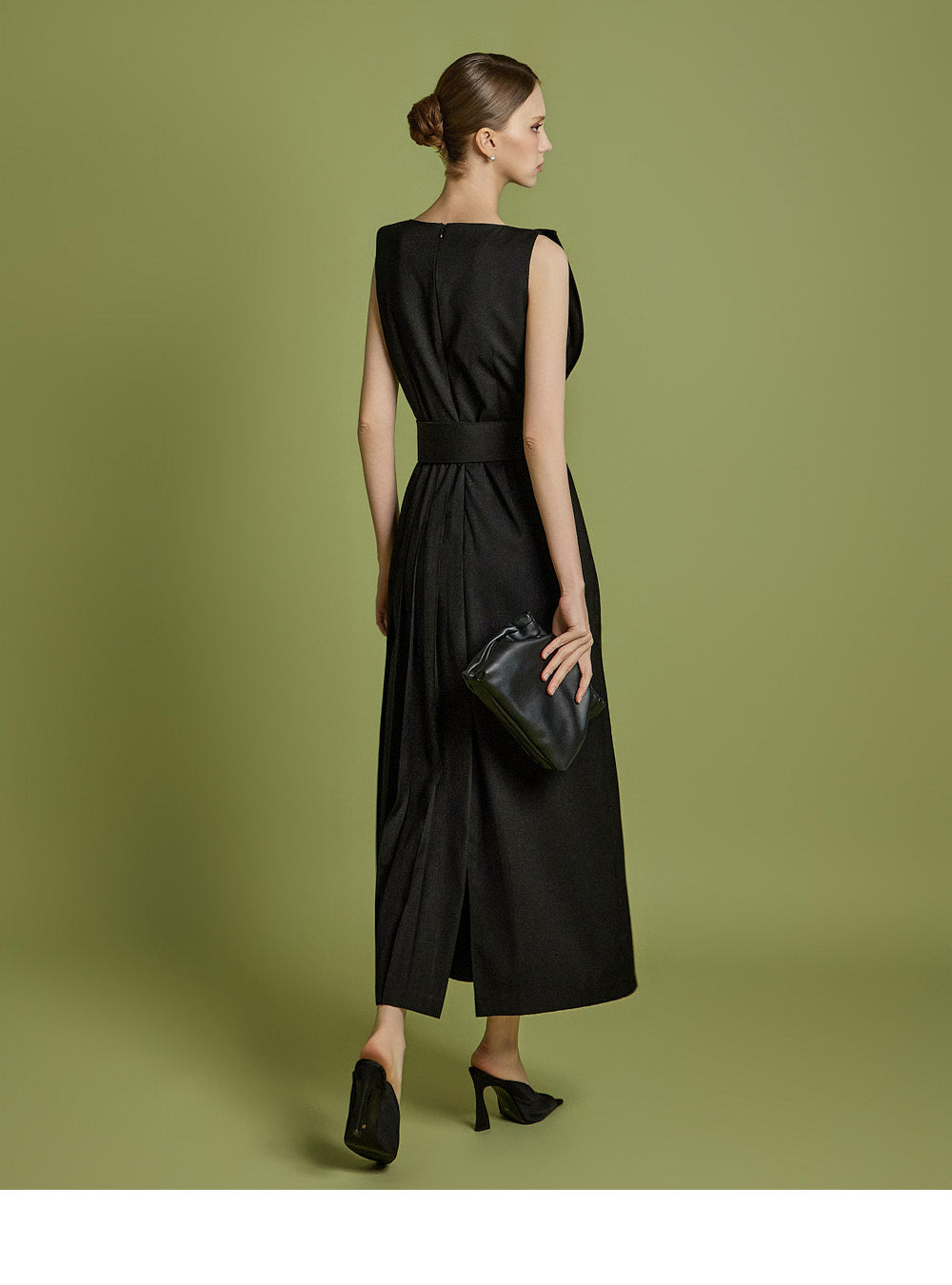 ベルトがセットされたプリーツワンピースは洗練された雰囲気。