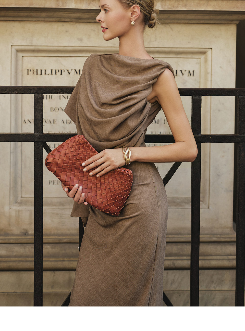 重ねたスカーフのようなフロントのドレープディテールがボリュームとエレガントさをプラス。