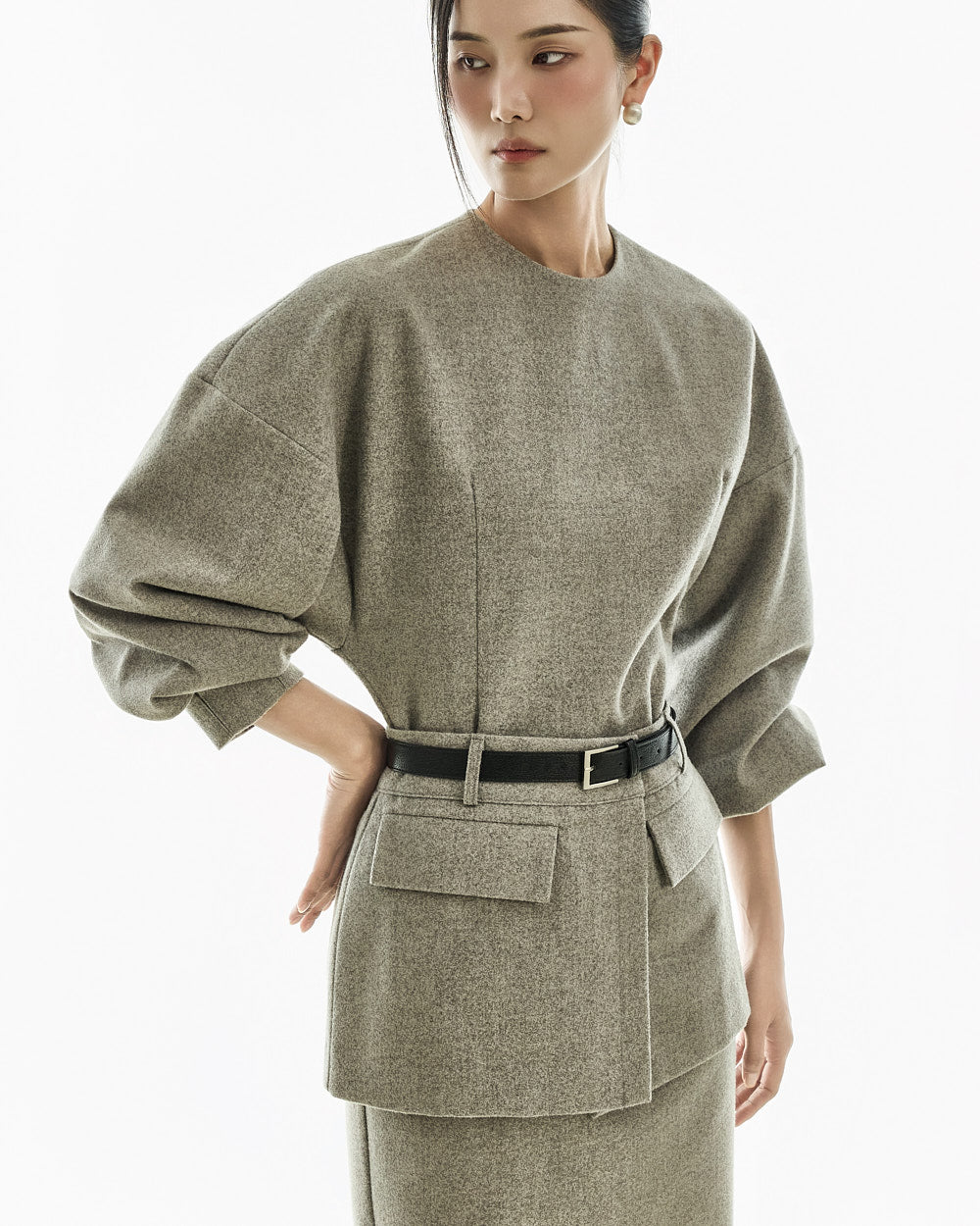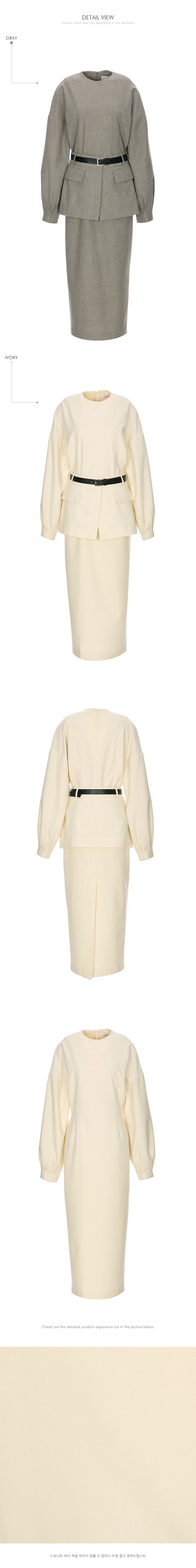 The ivory version features a gold buckle belt, and the gray version features a silver buckle belt.