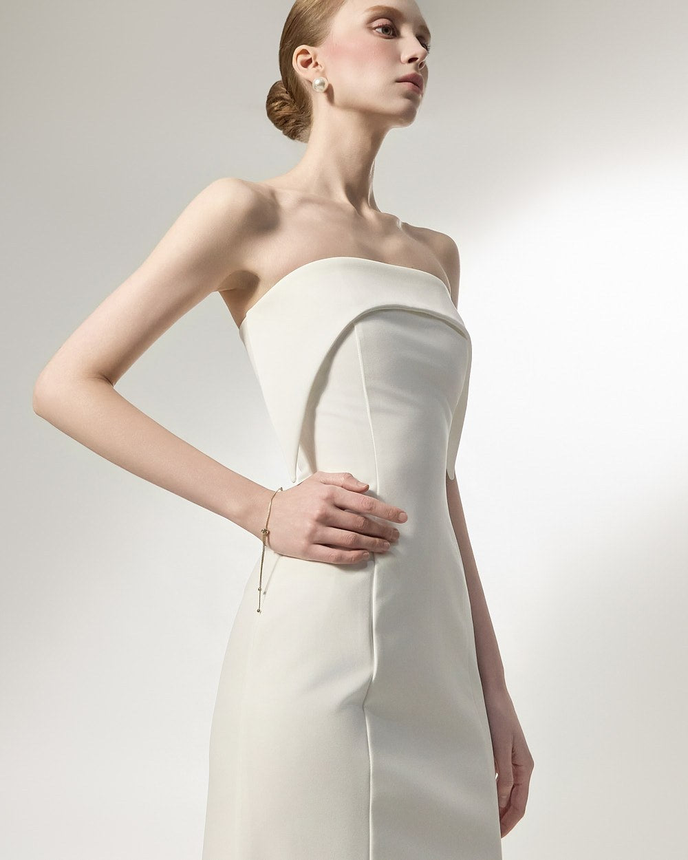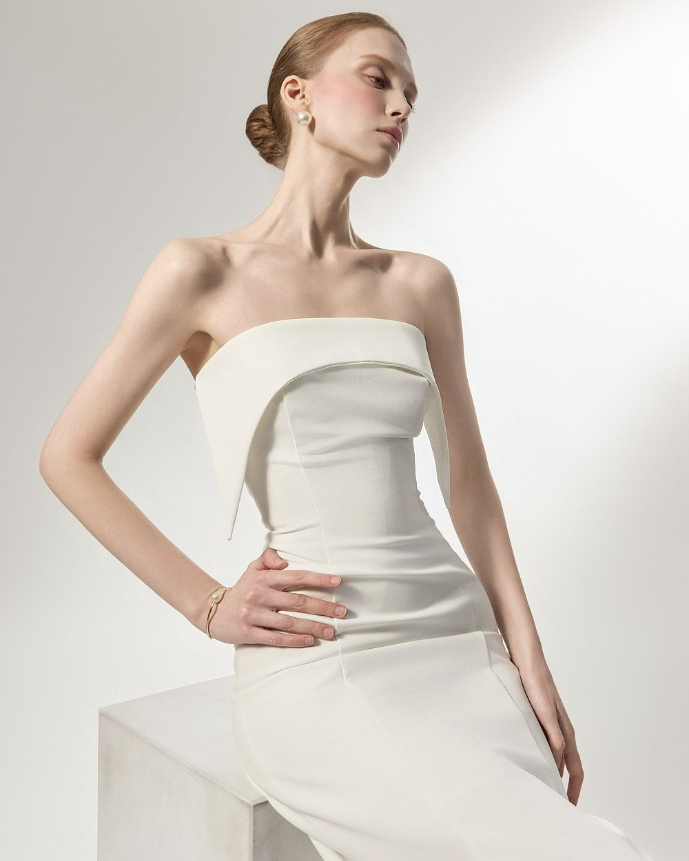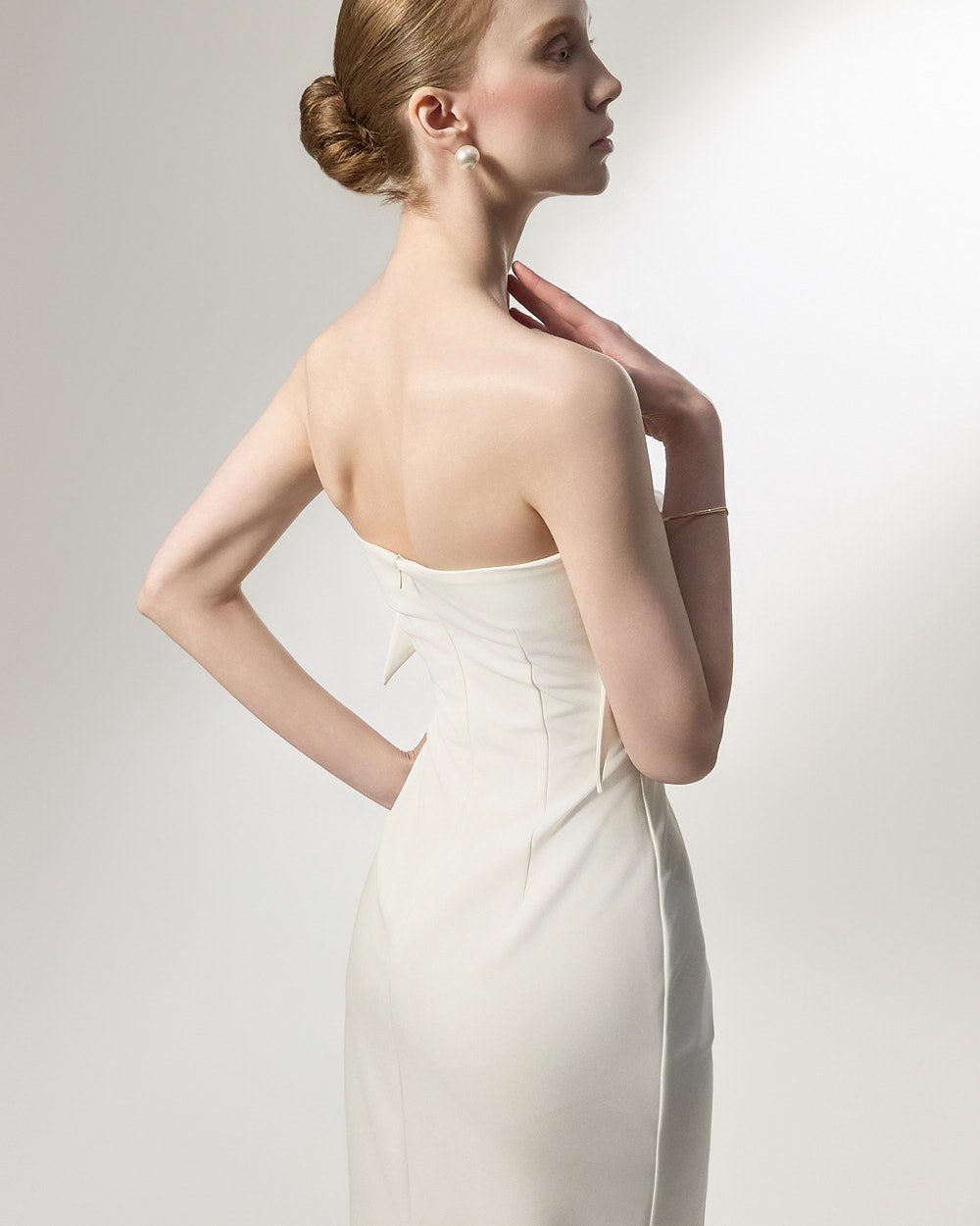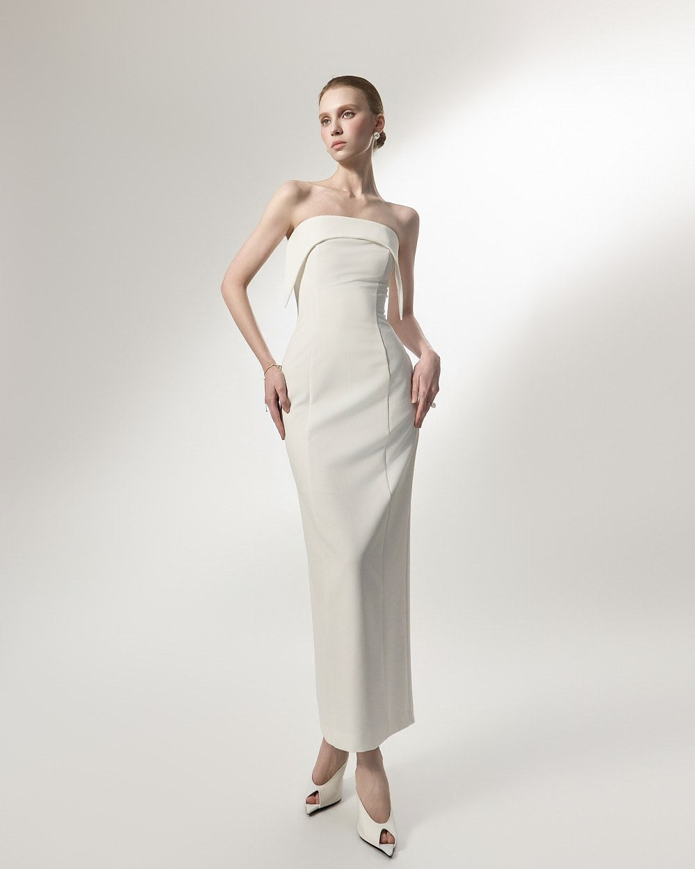 This is an off-shoulder dress with an elegant mood.