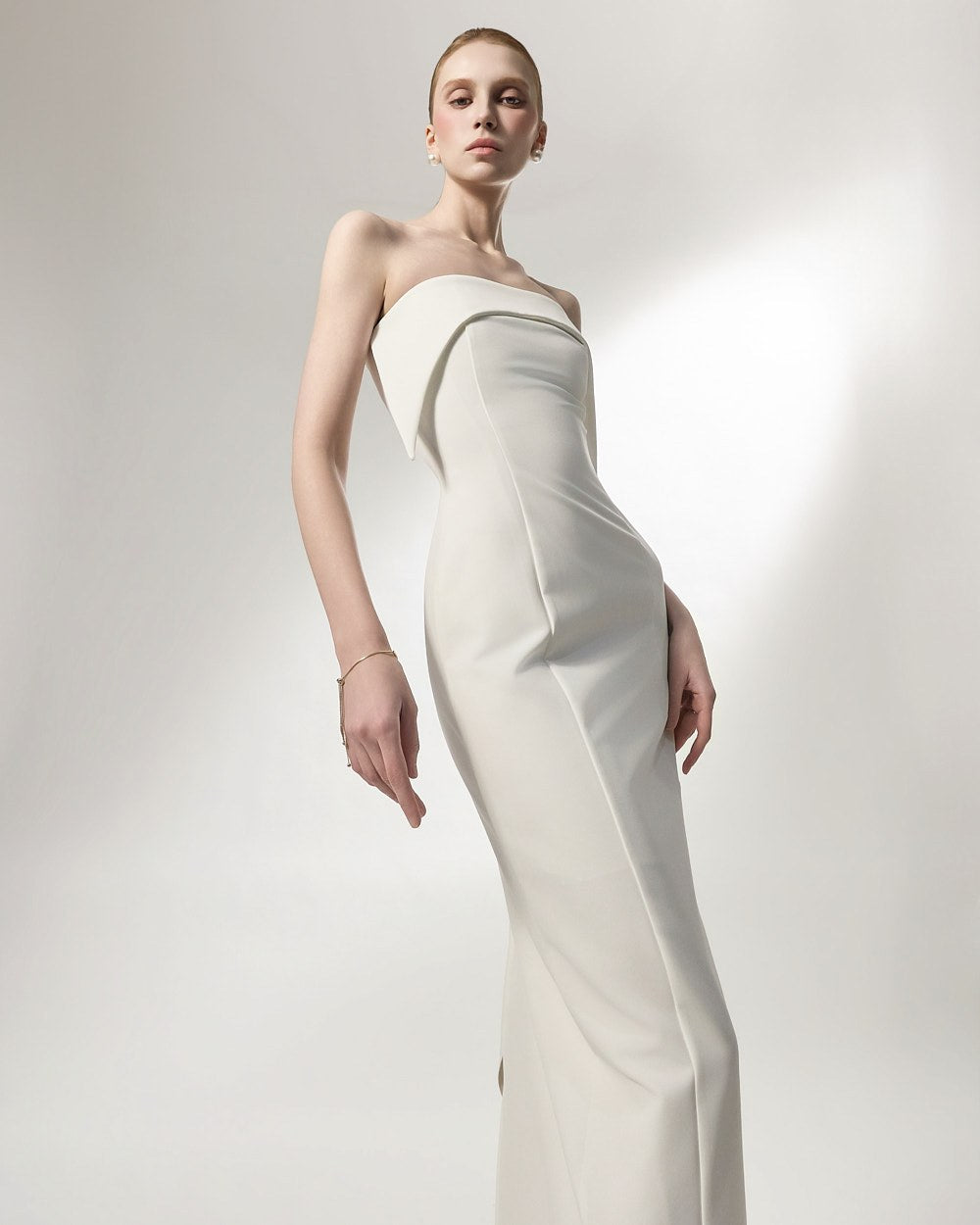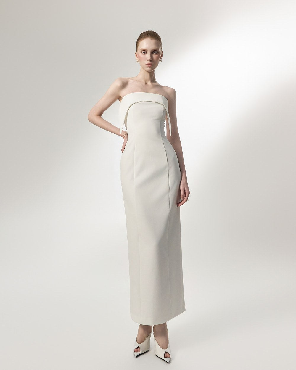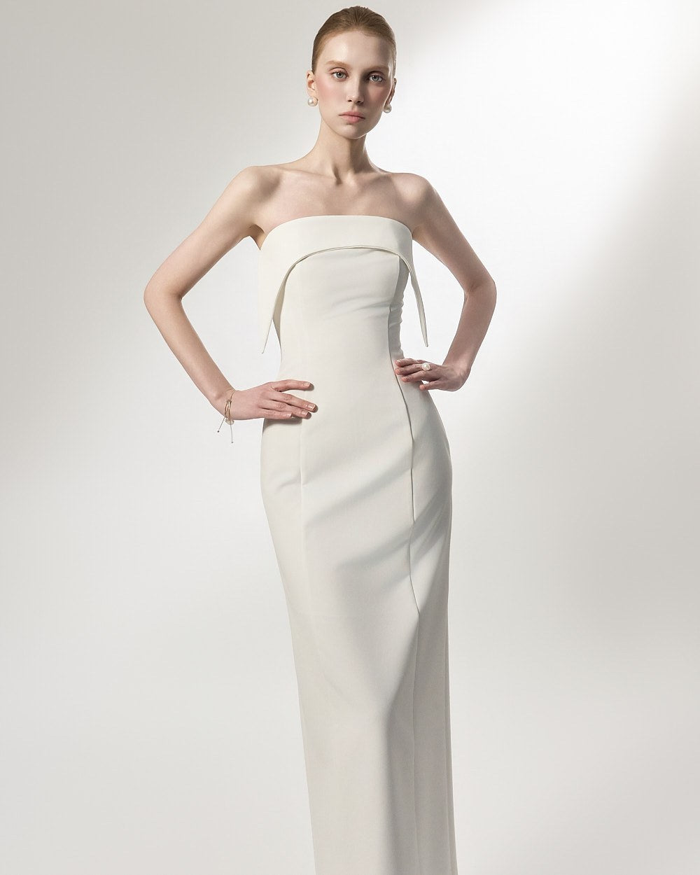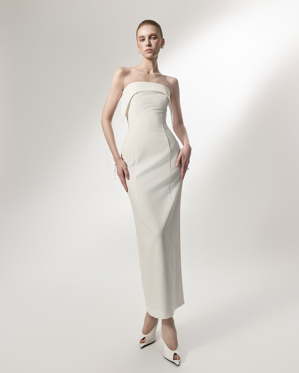 This is an off-shoulder dress with an elegant mood.