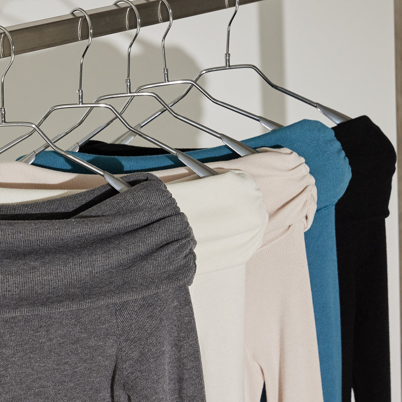 リブ編みの質感が体にぴったりフィットし、スリムで構造的なフィット感を実現します。