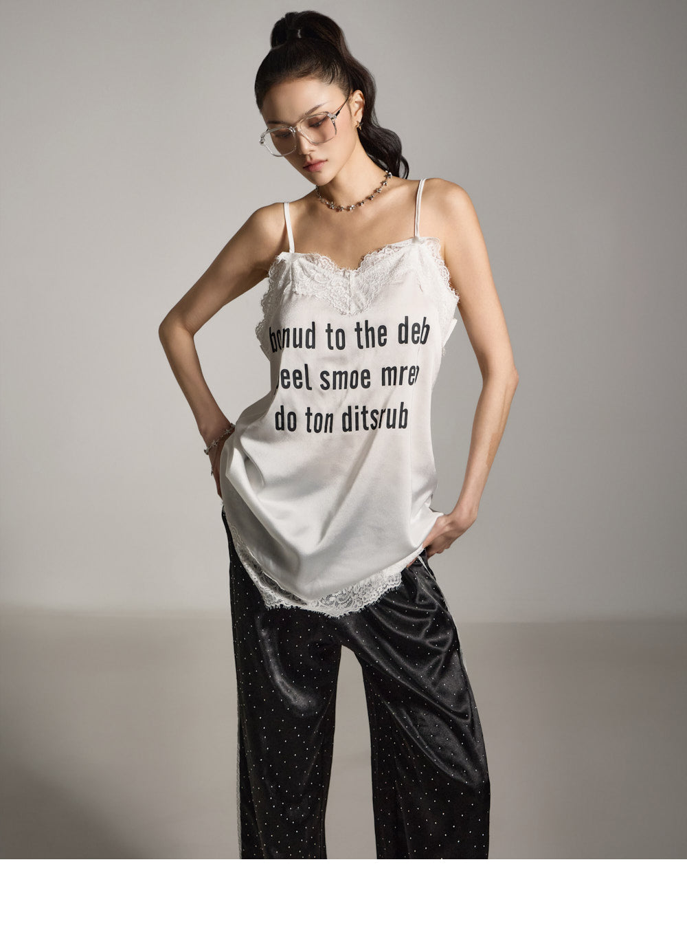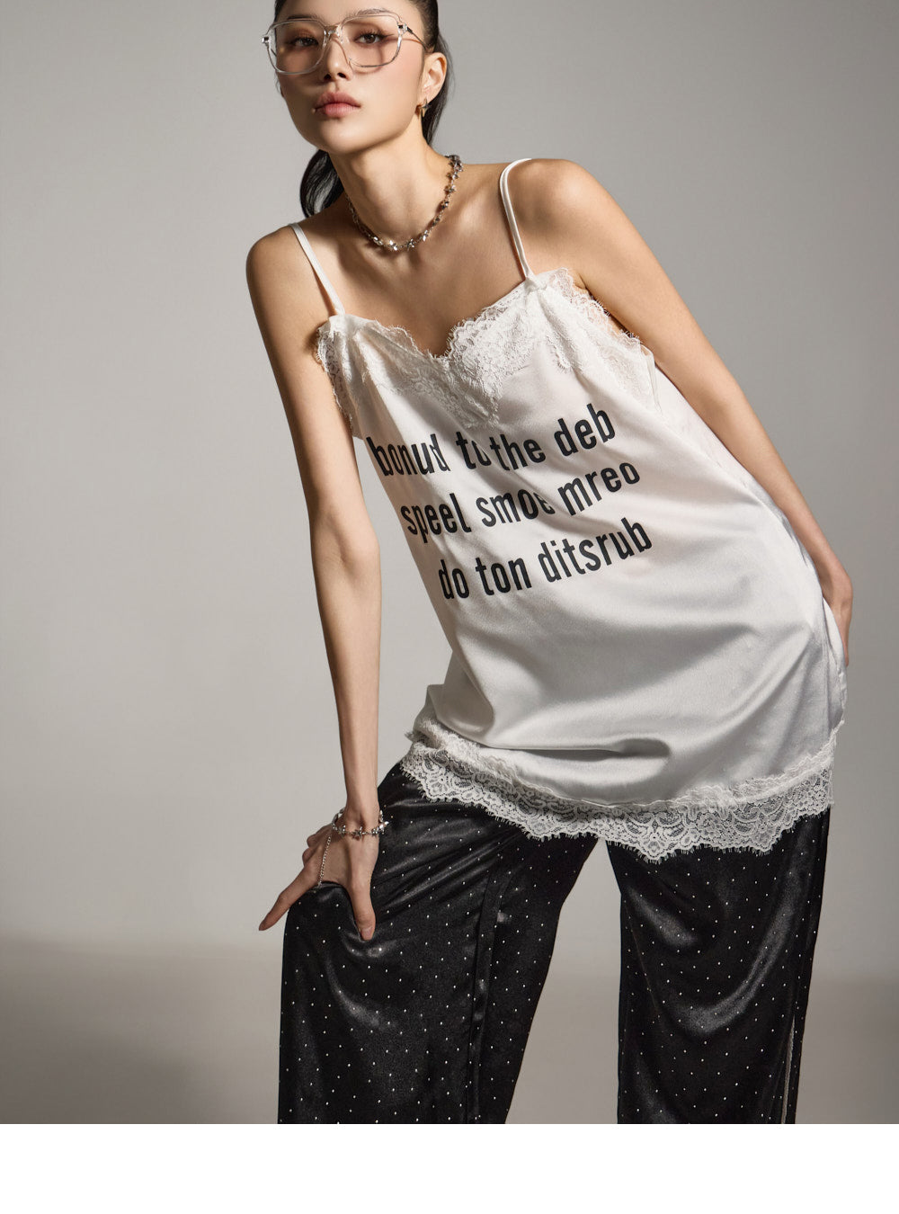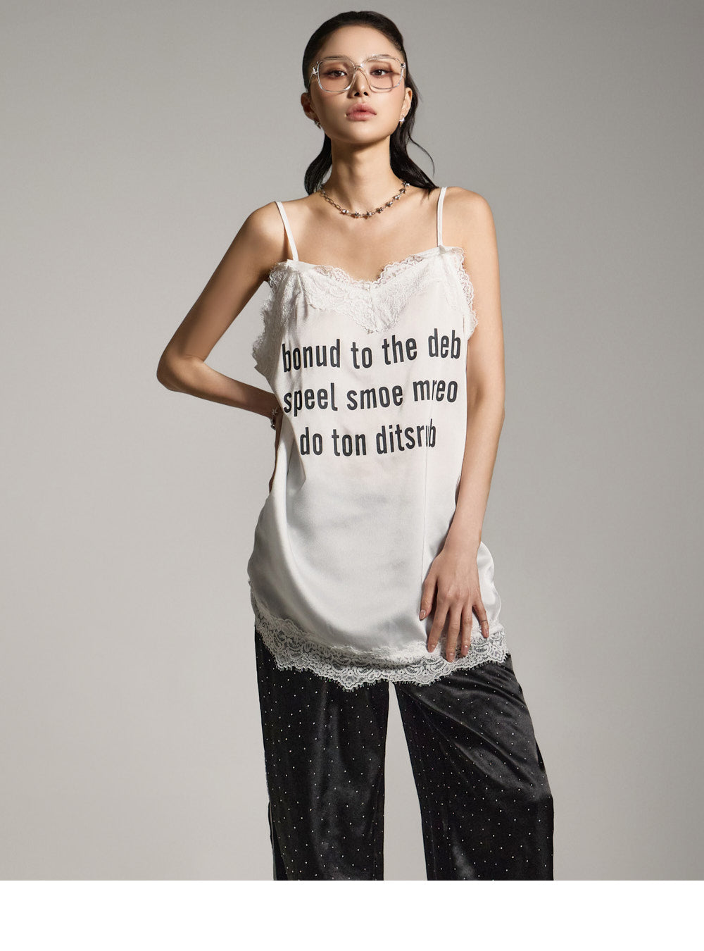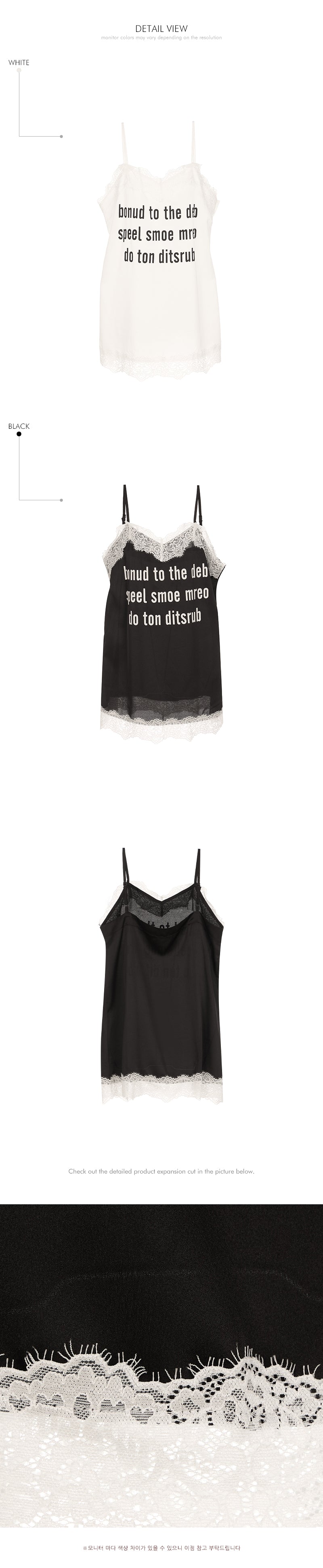 フロントにレタリングのディテール、裾と胸元にレースのアクセント、