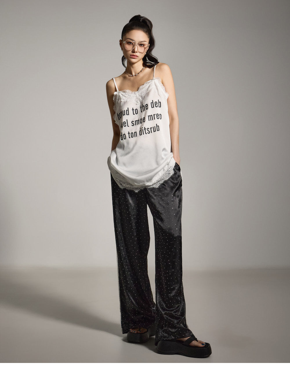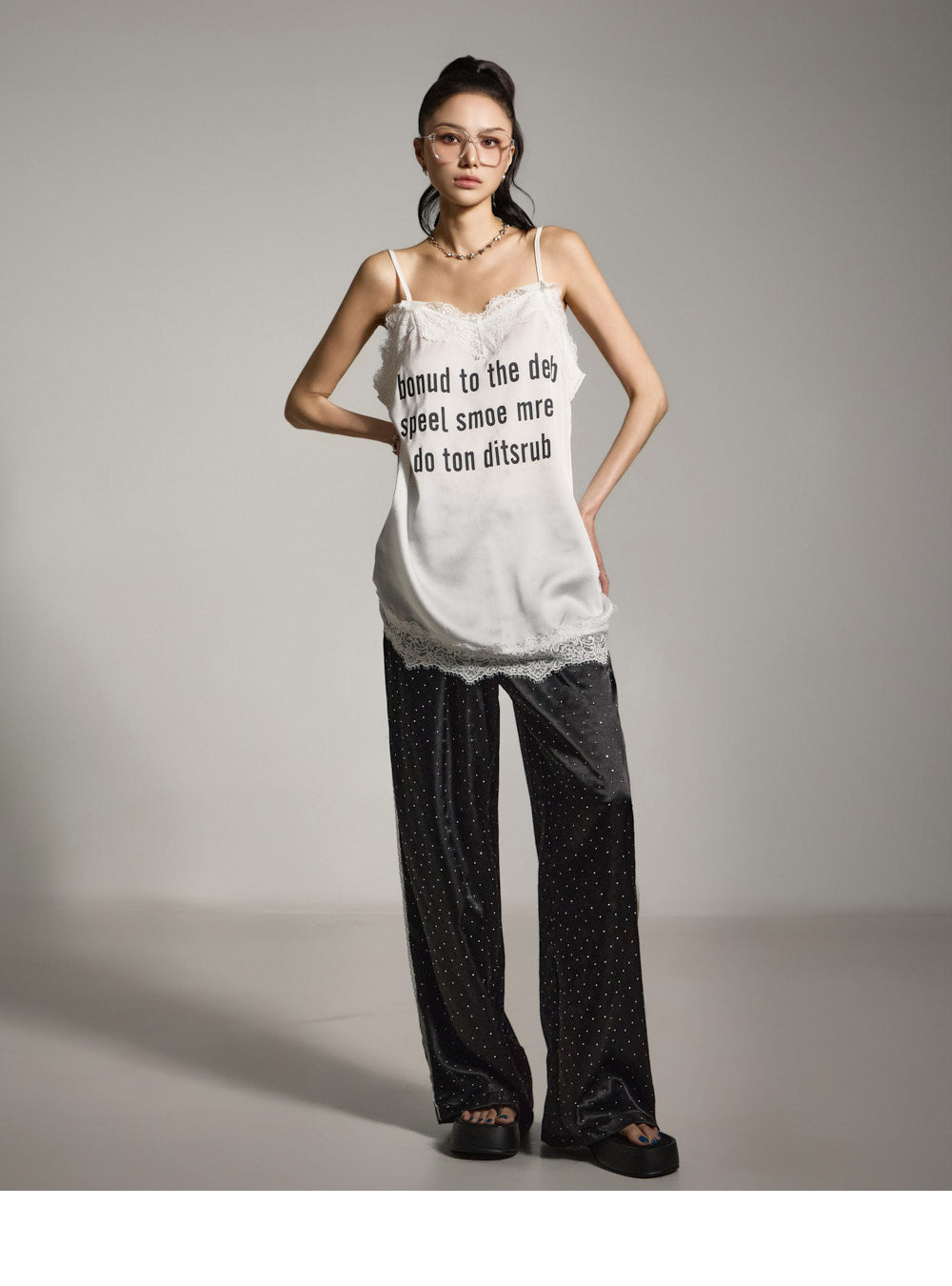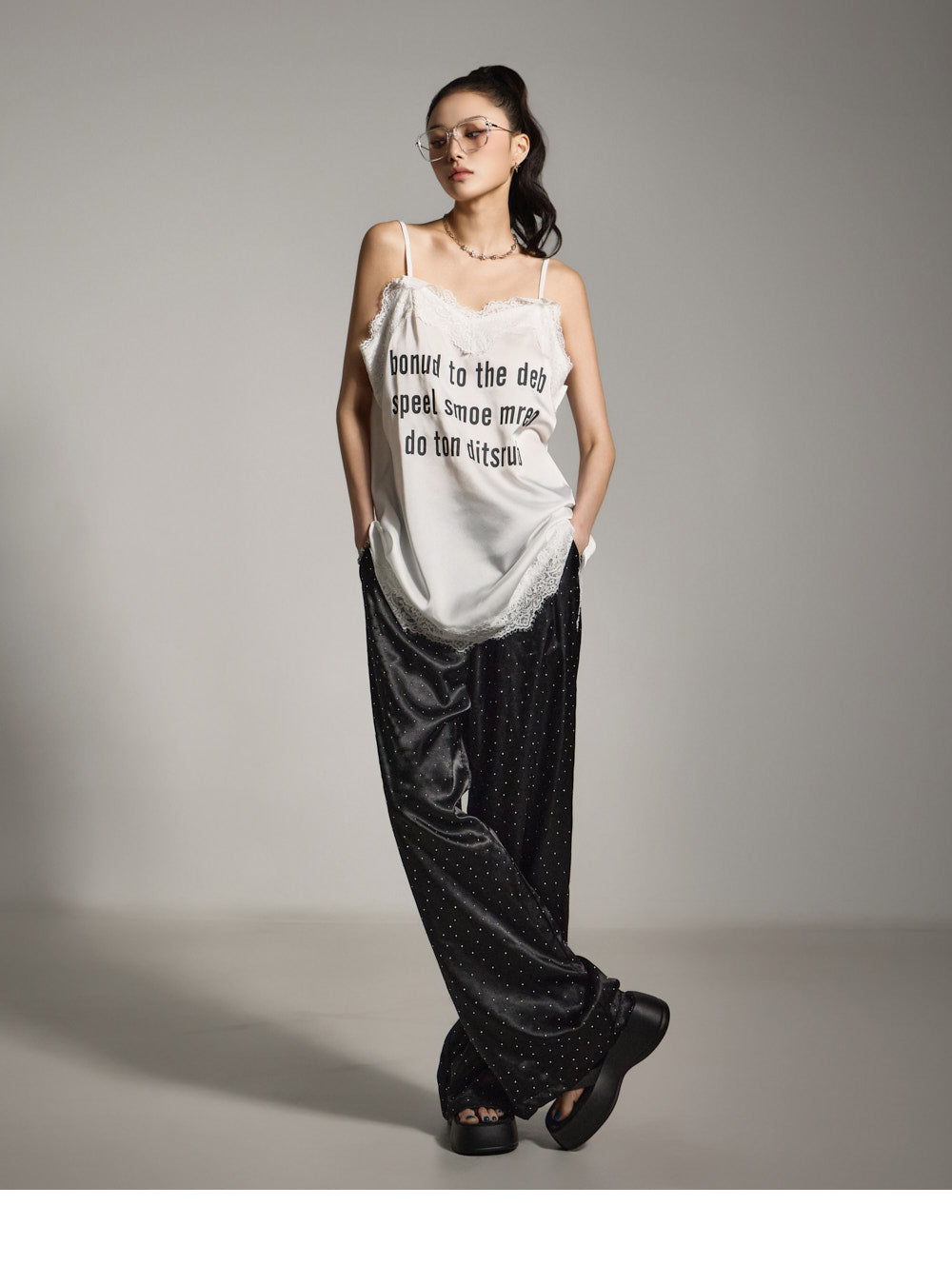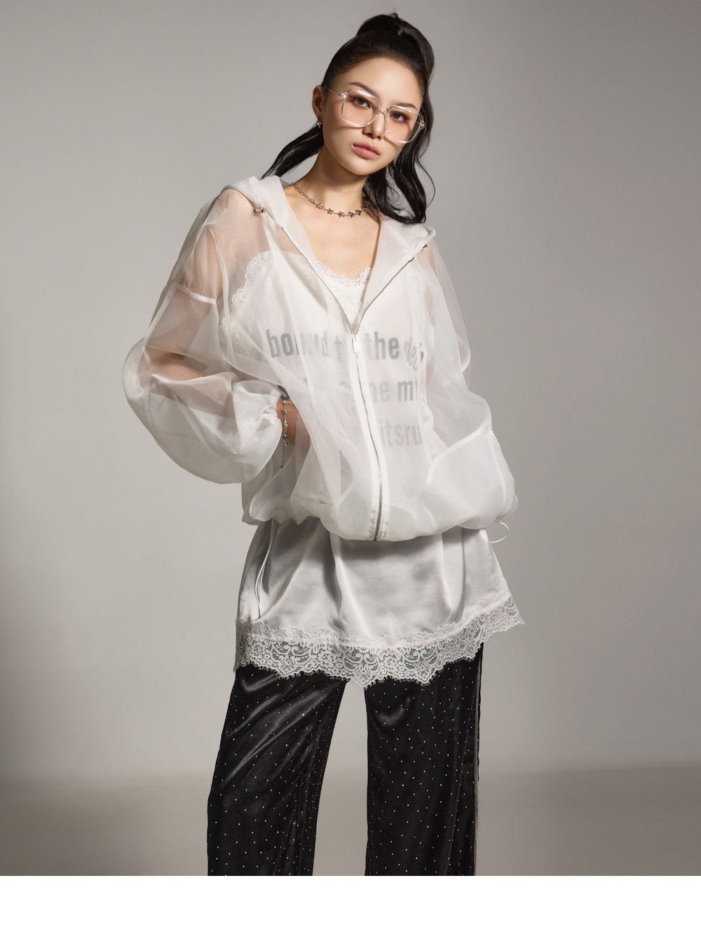 フロントにレタリングのディテール、裾と胸元にレースのアクセント、
