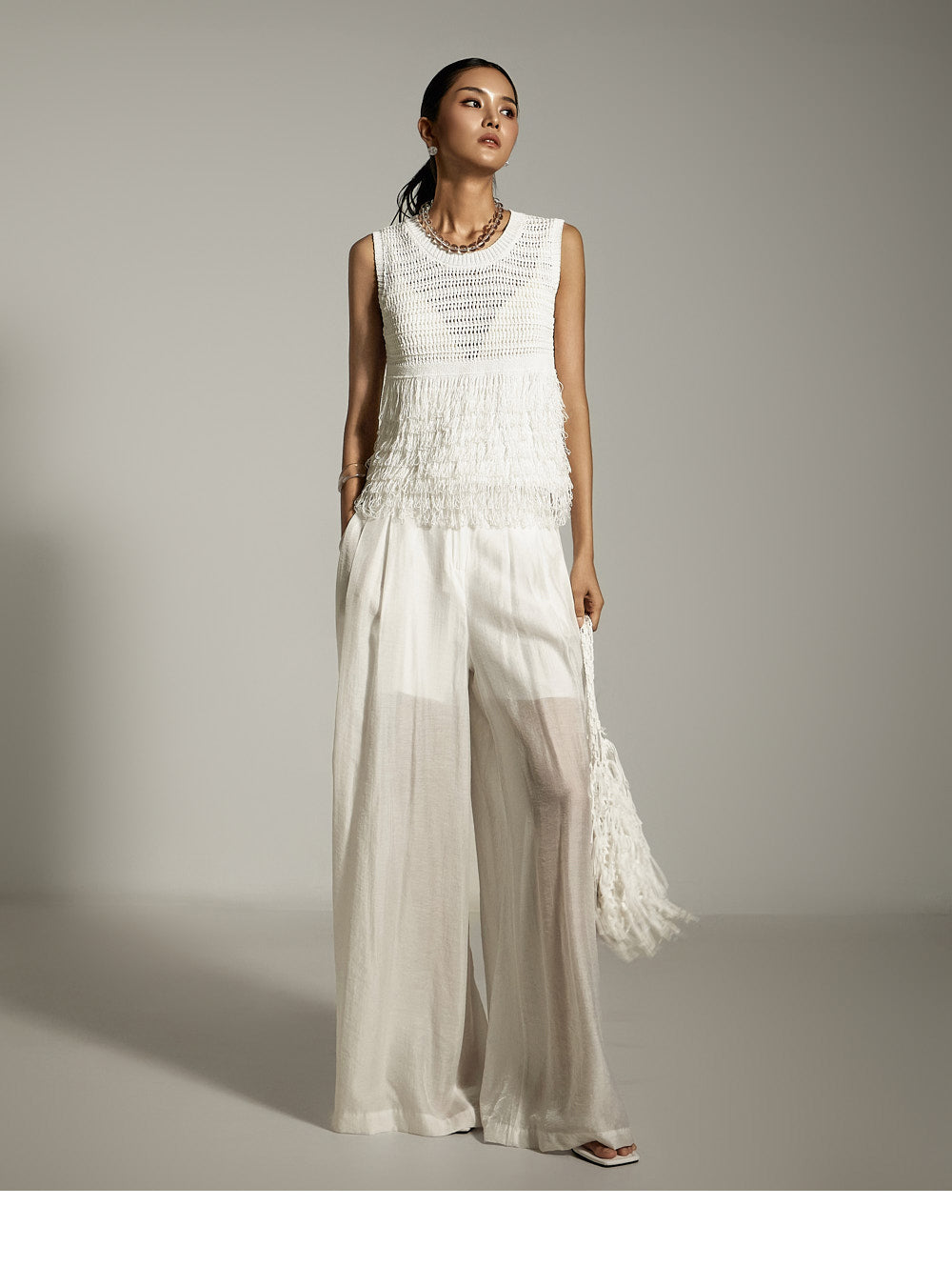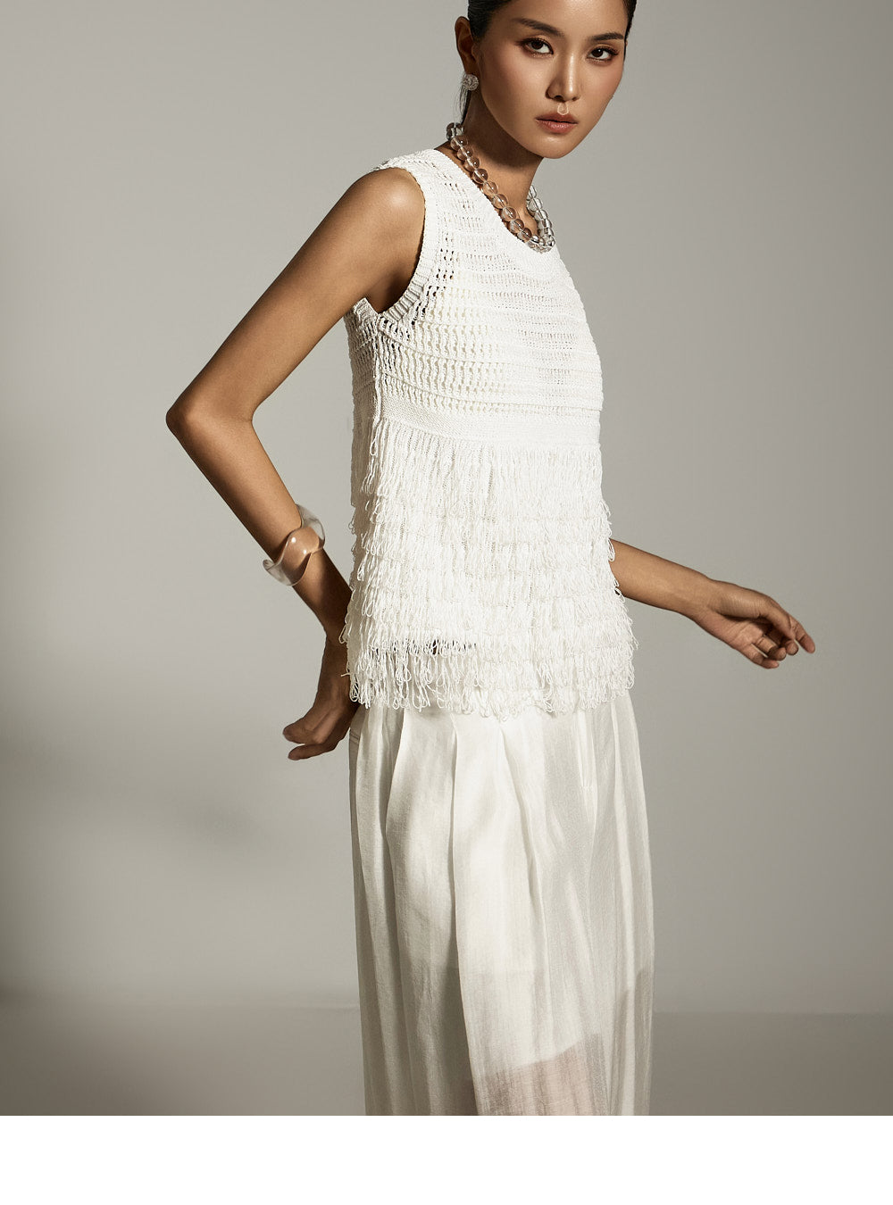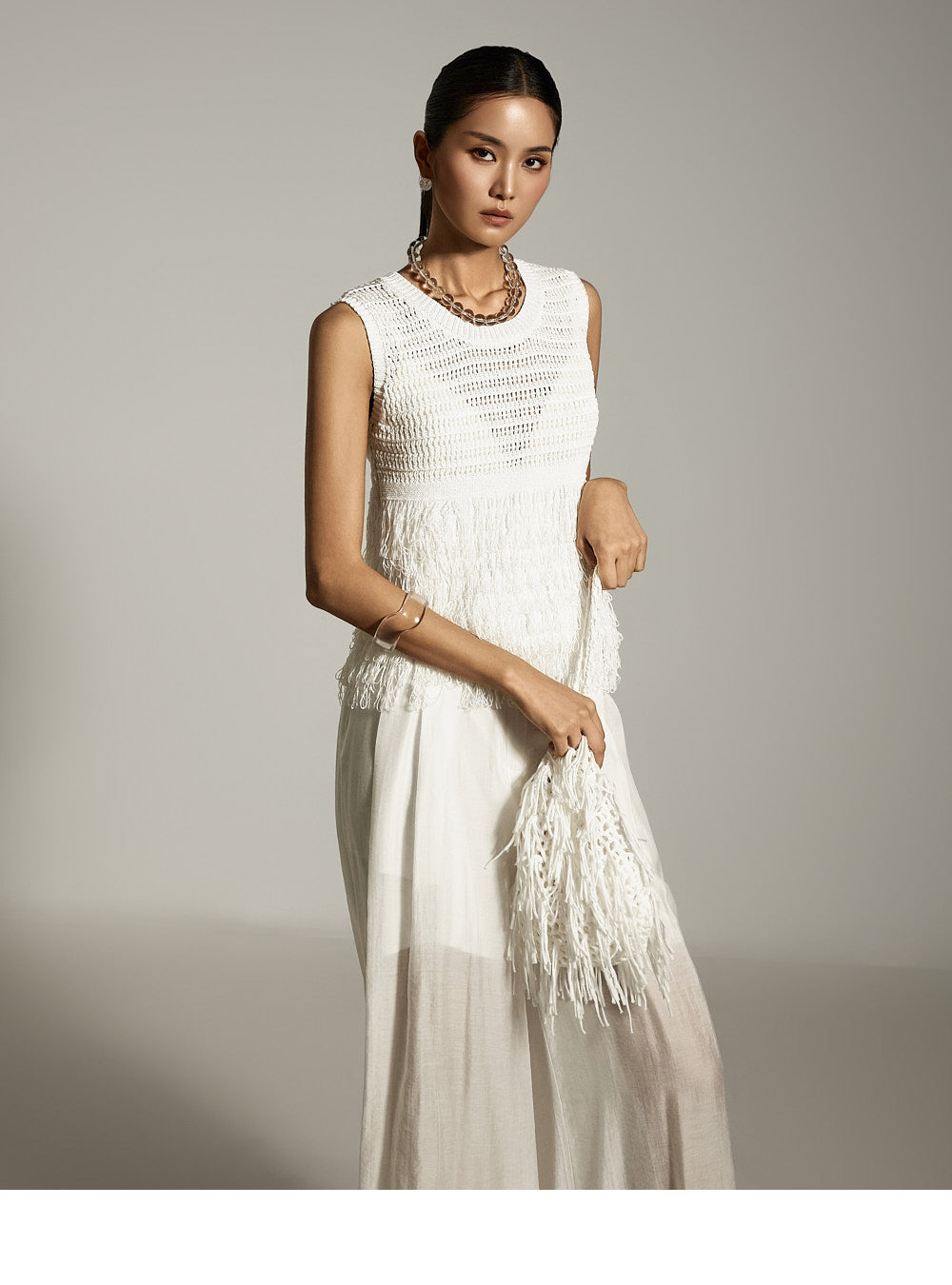 全体に施されたフリンジのディテールが、ボリューム感と質感のあるシルエットを作り出します。