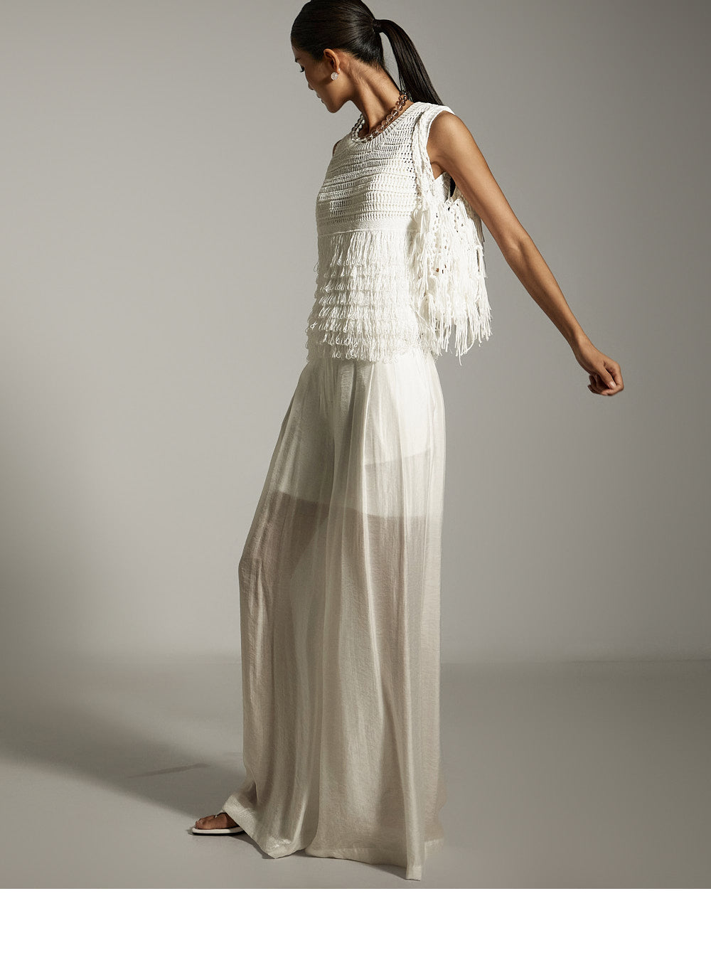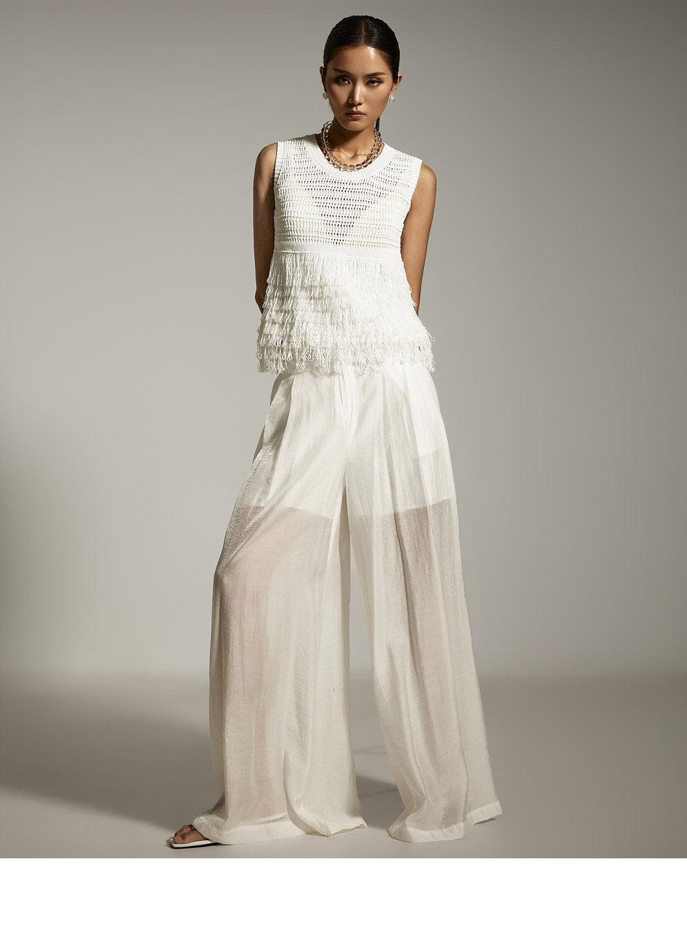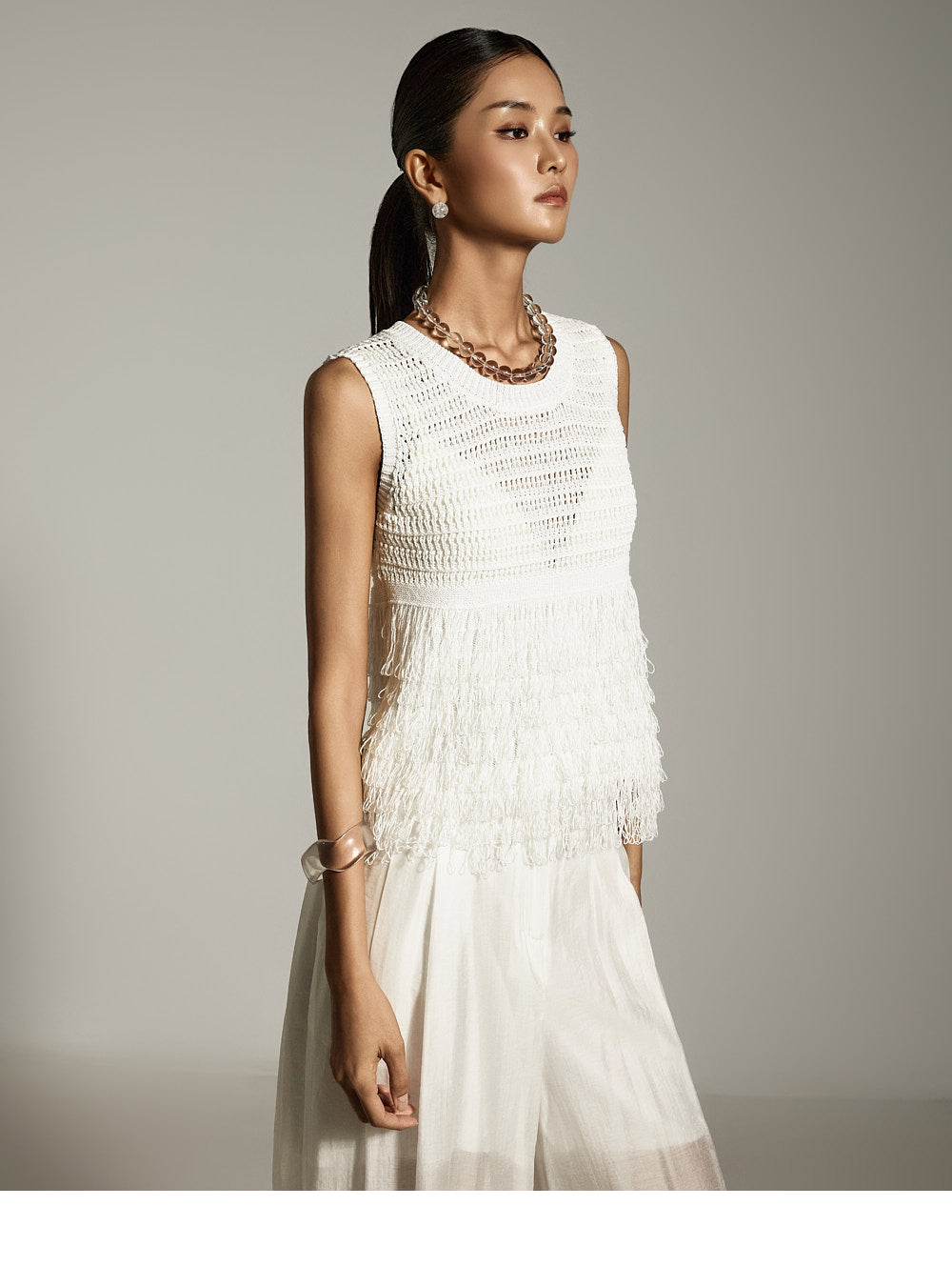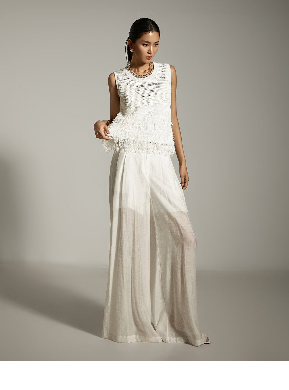 全体に施されたフリンジのディテールが、ボリューム感と質感のあるシルエットを作り出します。