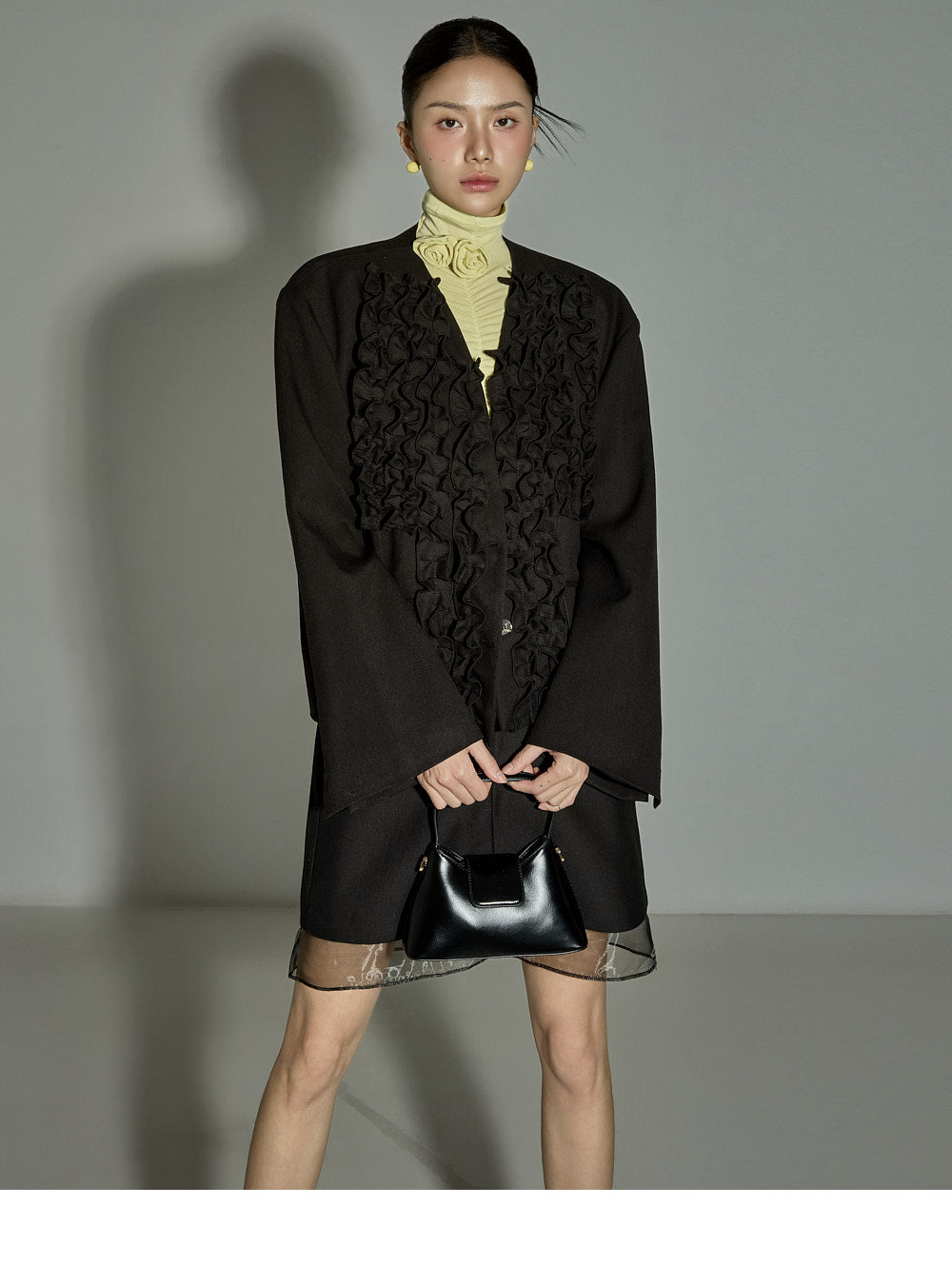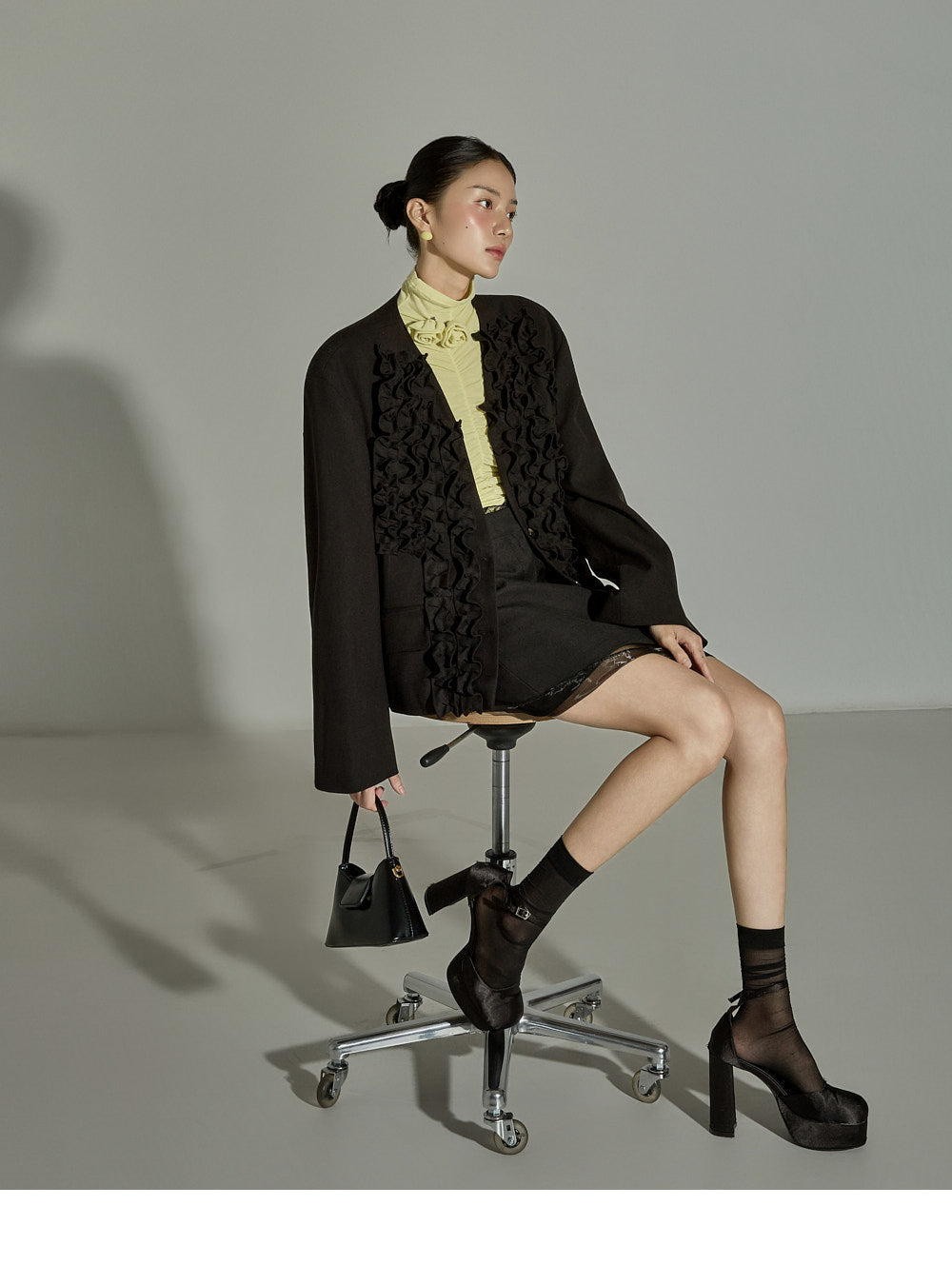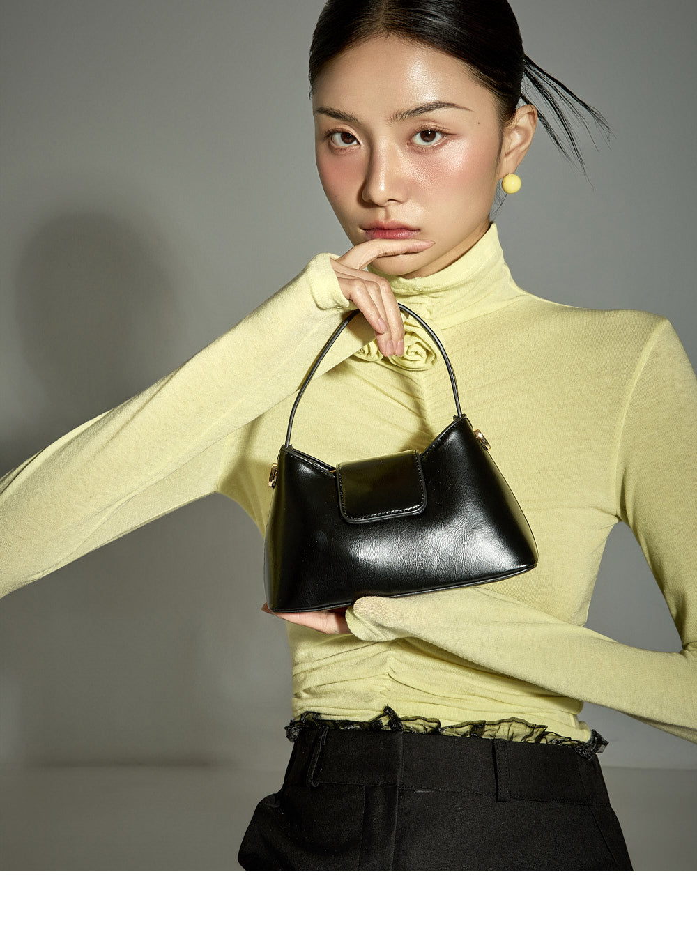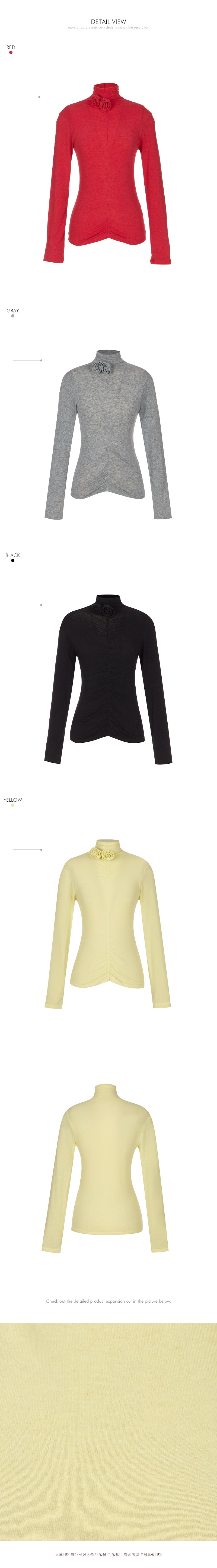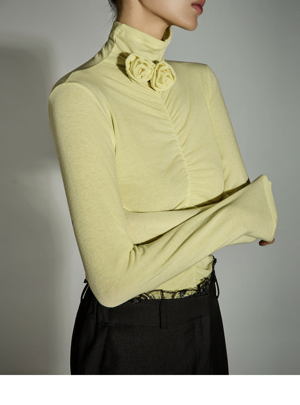 This lovely corsage set turtleneck top is crafted from a blend of various materials, including wool, cotton, and Tencel.