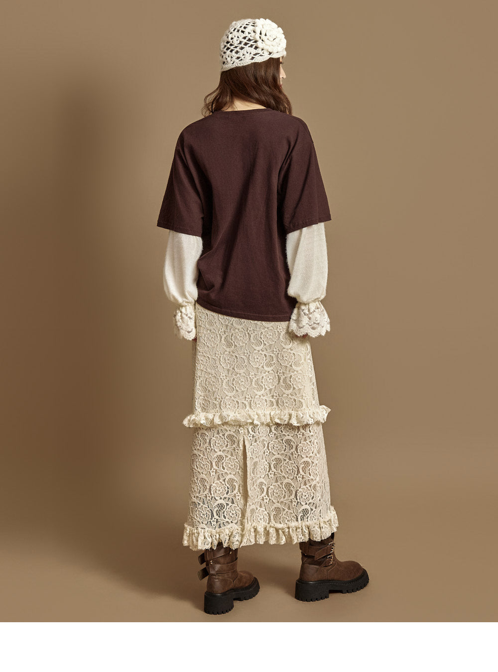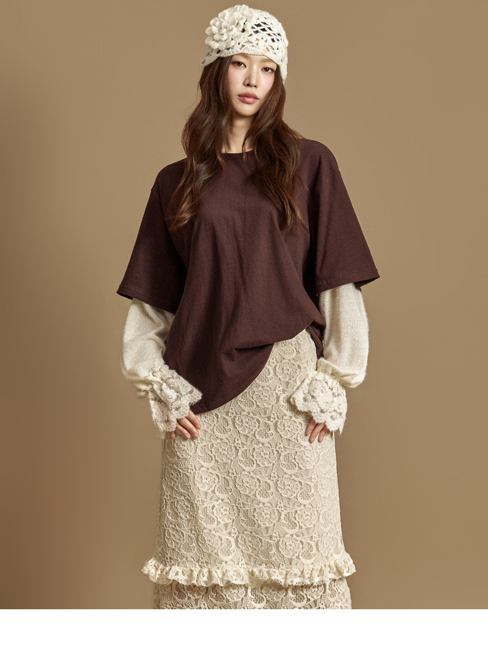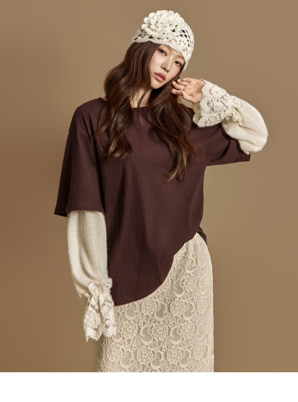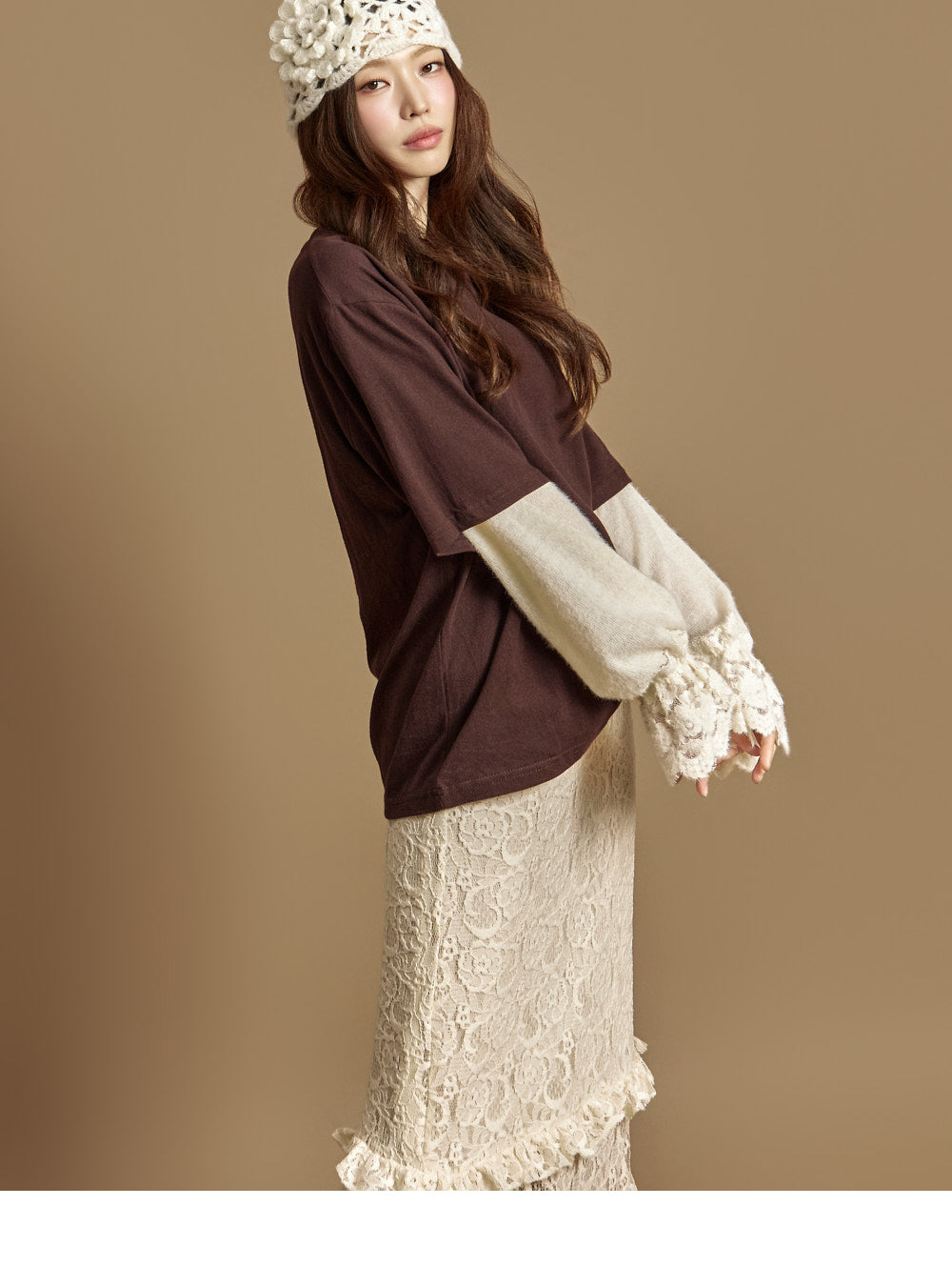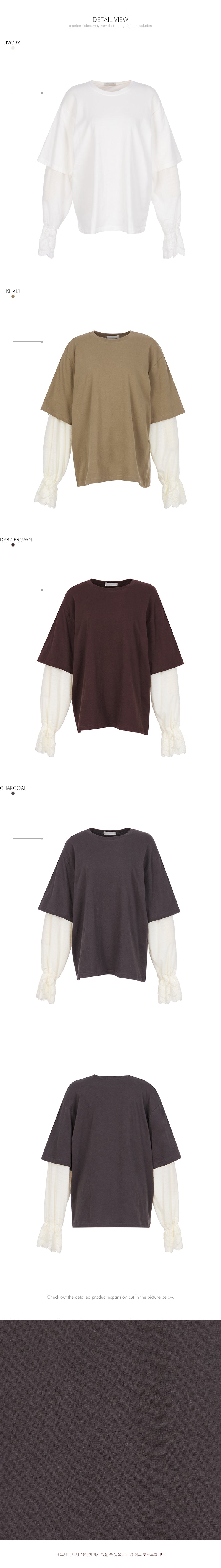 The loose fit creates a relaxed silhouette,and lace details at the sleeve hems