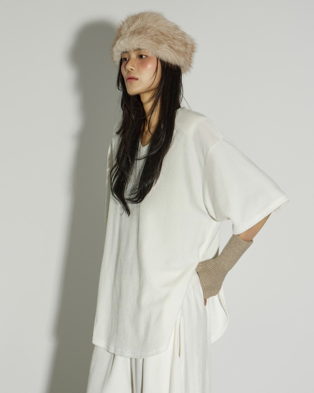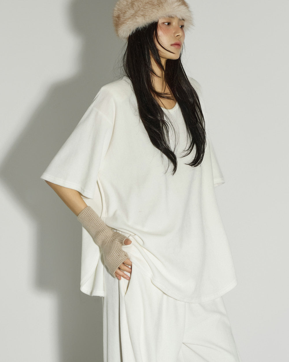 The loose-fitting boxy silhouette and U-neck create a soft, flattering look.