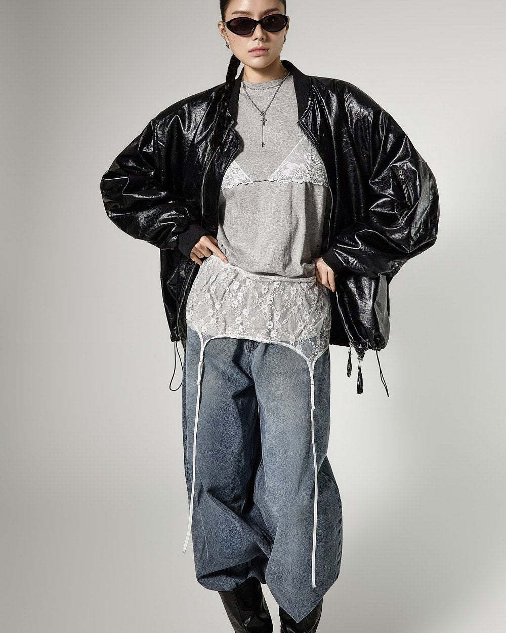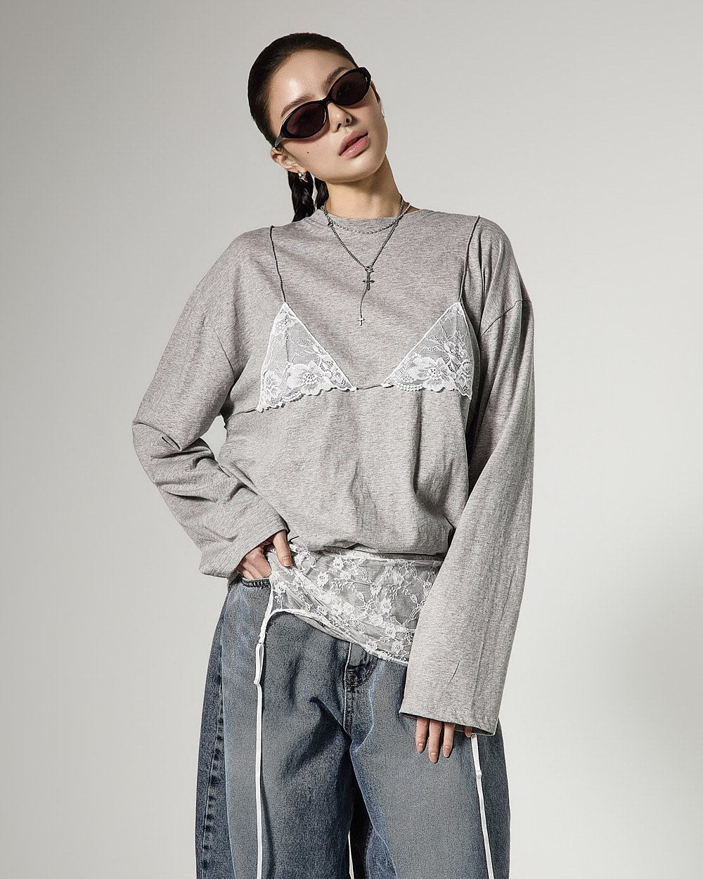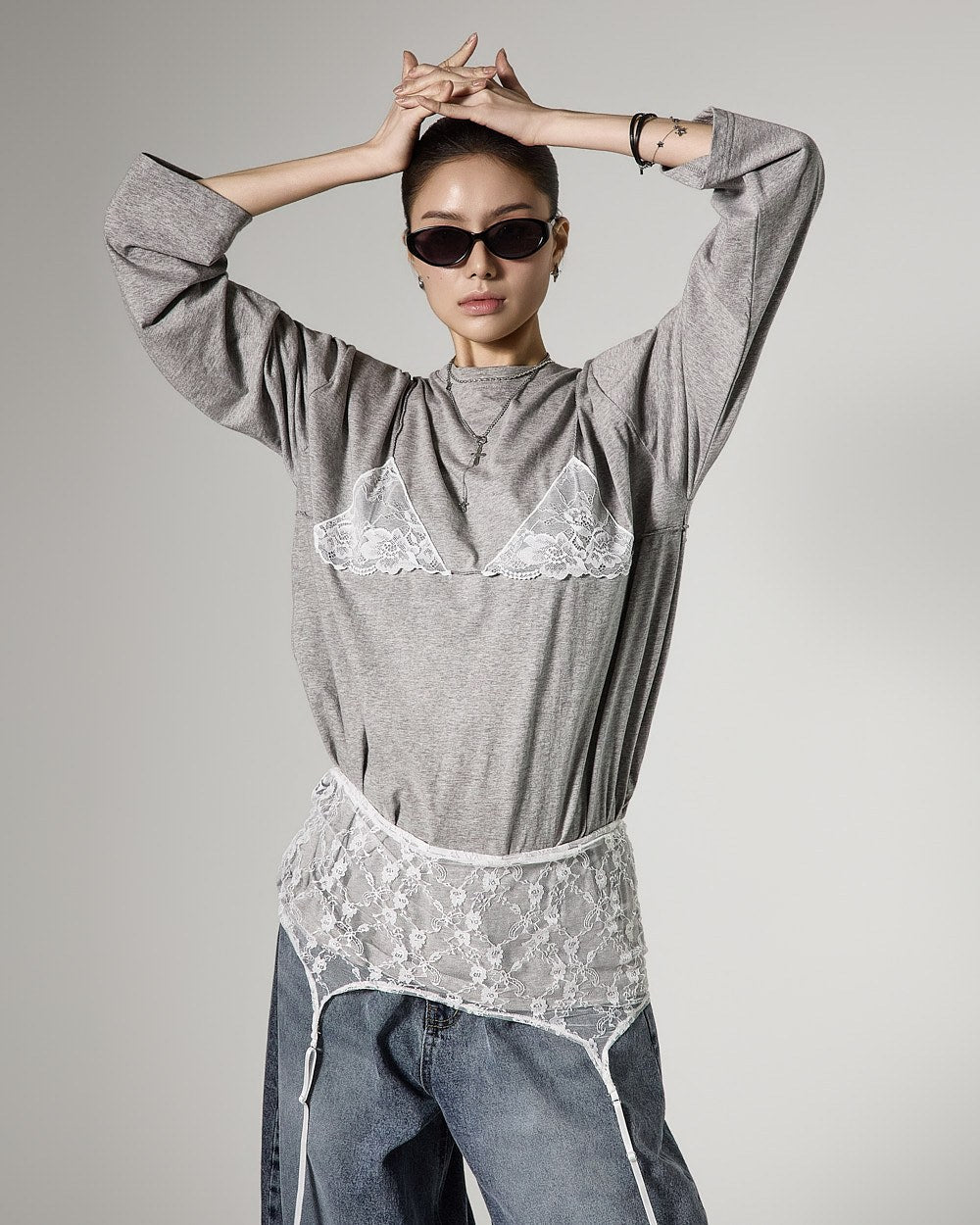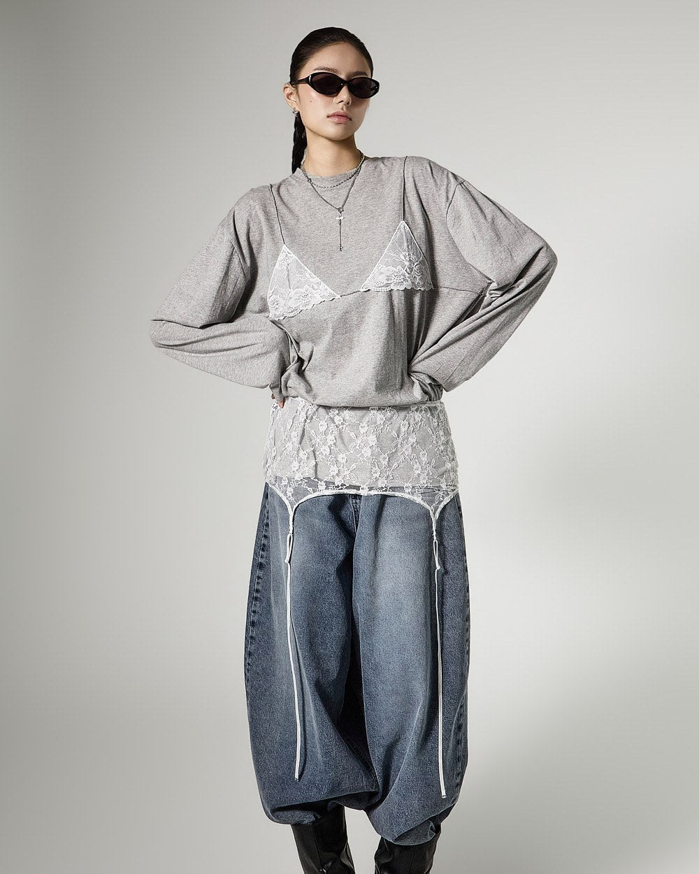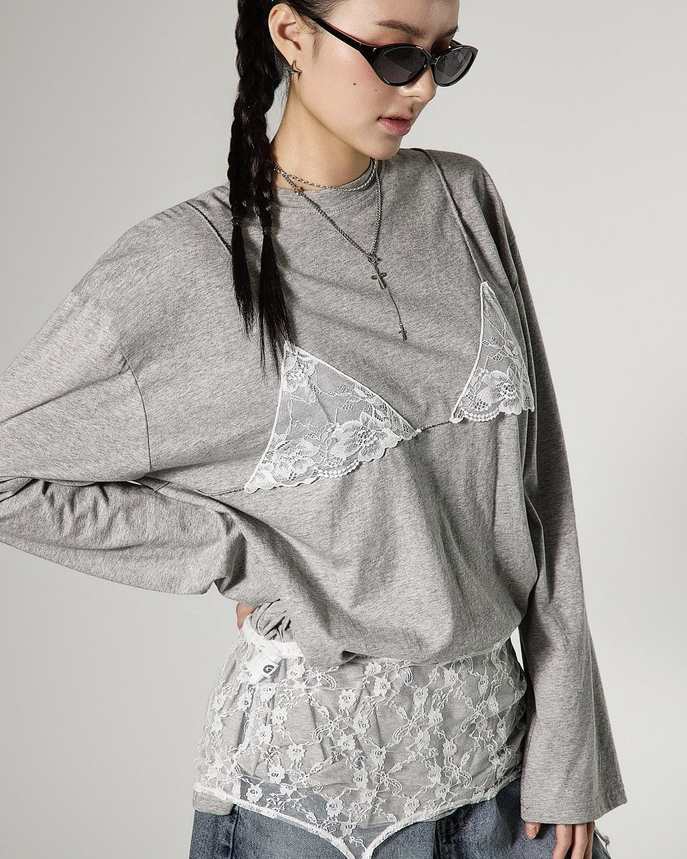 レイヤードされたレースビスチェのデザインがスタイリッシュなアクセントを加え、