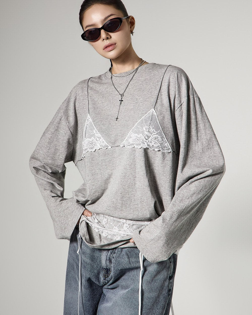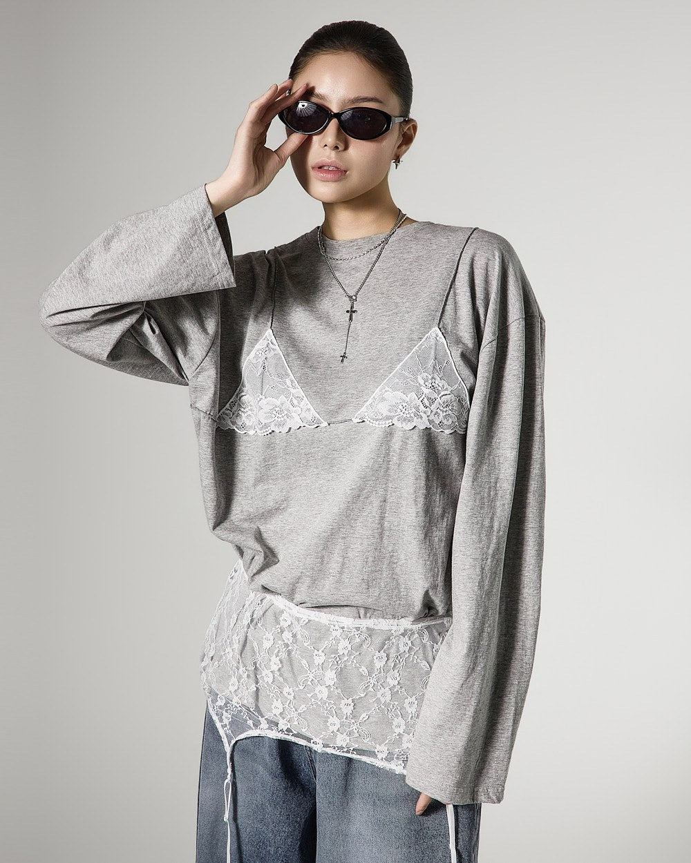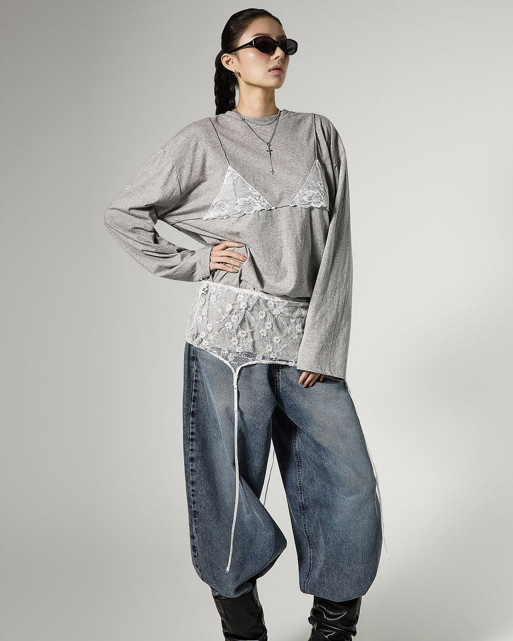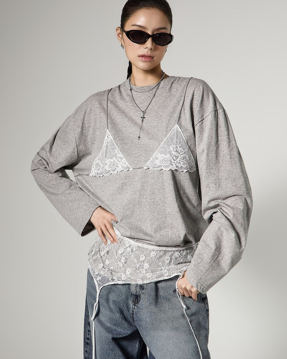 レイヤードされたレースビスチェのデザインがスタイリッシュなアクセントを加え、